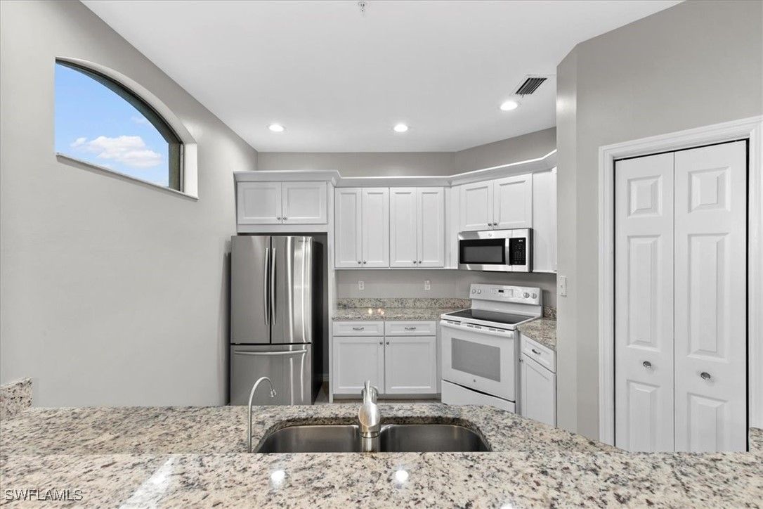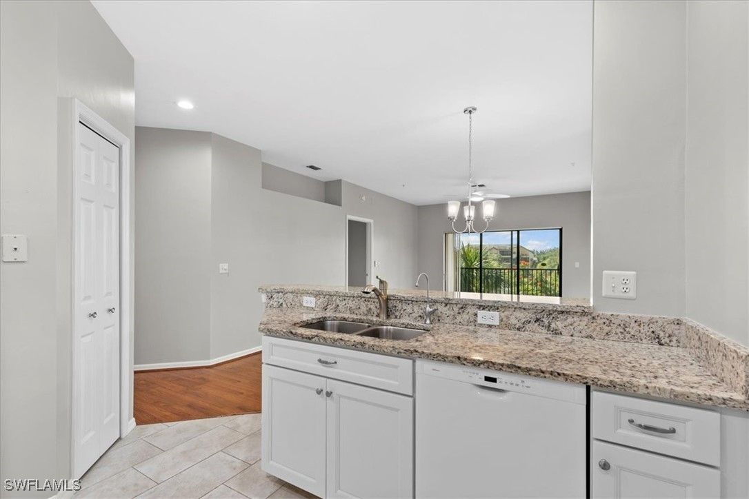 Bright and sunny condo in the Vineyards comes with three bedrooms and two full bathrooms, a large renovated open kitchen with beautiful white cabinets and granite countertops as well as covered parking and an outside storage closet. This home boasts high ceilings with tons of natural light. Enjoy your morning coffee or evening cocktails as you relax in your lanai overlooking long lake views. Internet and fiber optic TV are included in the HOA fees. The Vineyards has 5 miles of walking sidewalks throughout the community. Vineyards Country Club offers varying levels of membership (optional for residents & non-residents): Full, Lifestyle & Social. The Club features 36 holes of golf w/easy tee time availability, unmatched amenities and no food & beverage minimums.