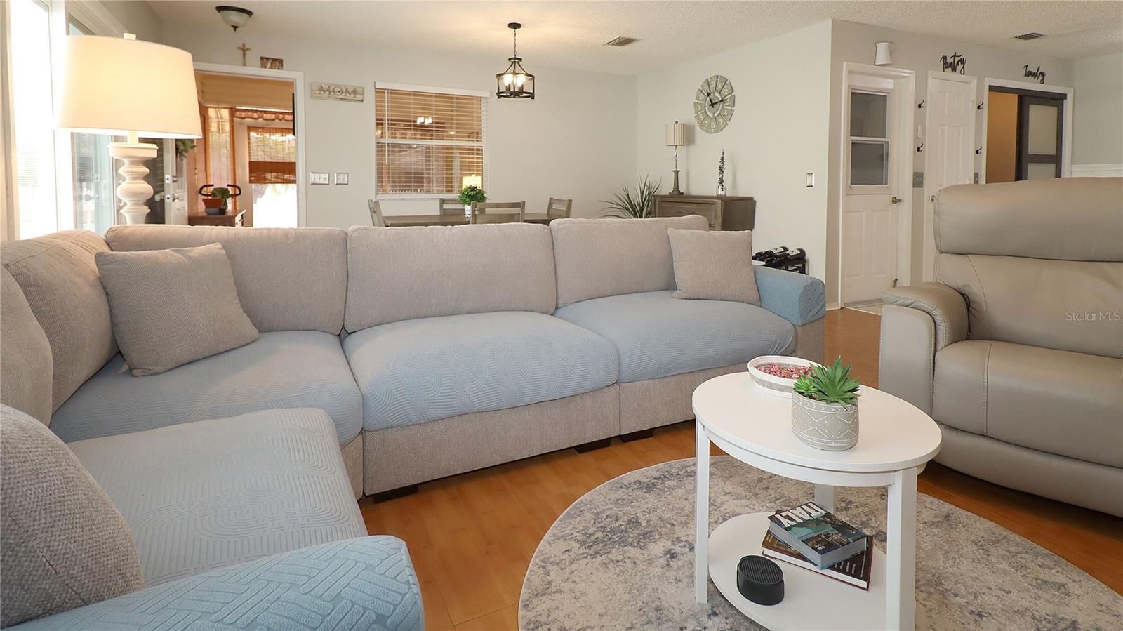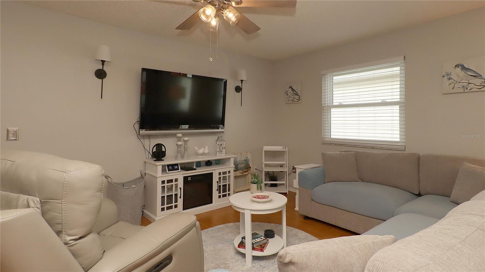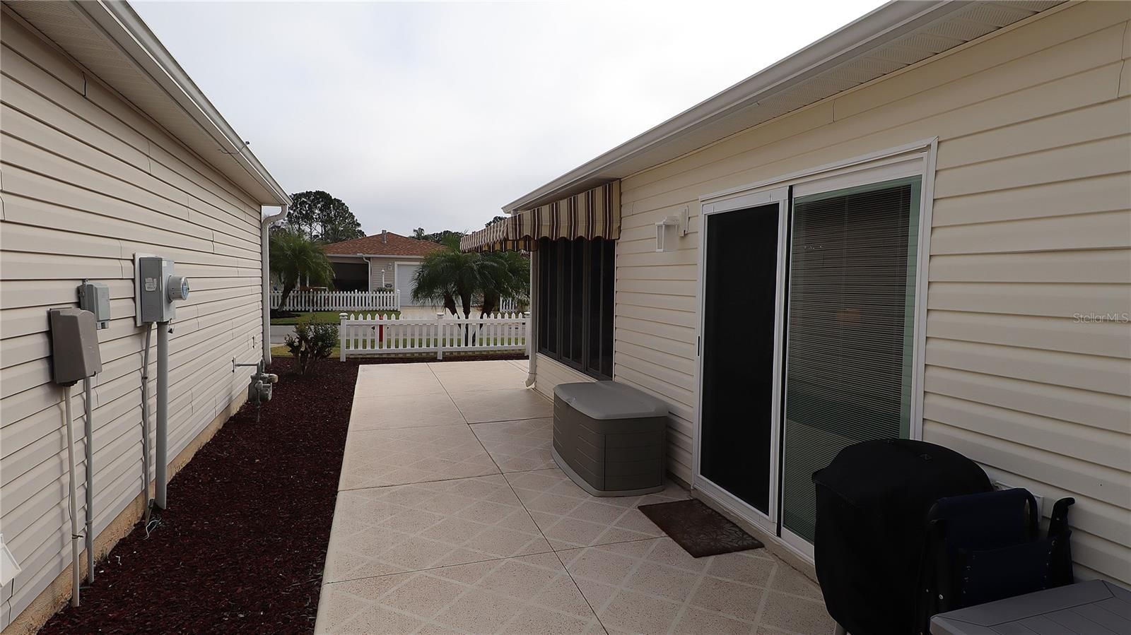 Location, location. This colony 2/2 patio villa is in a perfect location for access to golf courses, shopping and the town square at Sumter Landing. It is located in the Eagle Ridge Villas of Liberty Park. You will notice as your drive up that the driveway has been widened to have room for two cars and is beautifully painted as is the walkway. There are awnings on the front and side of the home. Enter through the enclosed lanai and you will enjoy the Chattahoochi flooring and a nice place to relax. The shades also provide privacy. Once inside this lovely villa you will see the new lights and fans that give it a nice upgraded look. The flooring in the livng and dining areas is bamboo. The kitchen is spacious enough to accomodate a nice table and chairs. Flooring in the kitchen is luxury vinyl tile. All of the appliances are stainless steel. The counter tops are a unique crystal product. The range is gas and there is a new disposal. Enjoy the decorative remote control fan in the kitchen while you do your laundry behind the glass sliding doors. There is also a nice pantry in the kitchen. Both bedrooms have closets and carpet flooring. The Primary closet is a good sized walk-in. The Primary bathroom has a shower and the guest bath has a tub and shower and the cabinets have been painted. Flooring in both bathrooms is also luxury vinyl tile. The one and a half car garage has a new opener. The roof was replaced in 2020 and there is instant tankless hot water. HVAC is 2018. All new windows have been installed as well as patio doors. The ducts were also cleaned in 2024. Home is power washed every six months. Fire $320.71, Maint. $214.74, Bond Maint $457.38, Bond balance is $2,757.27