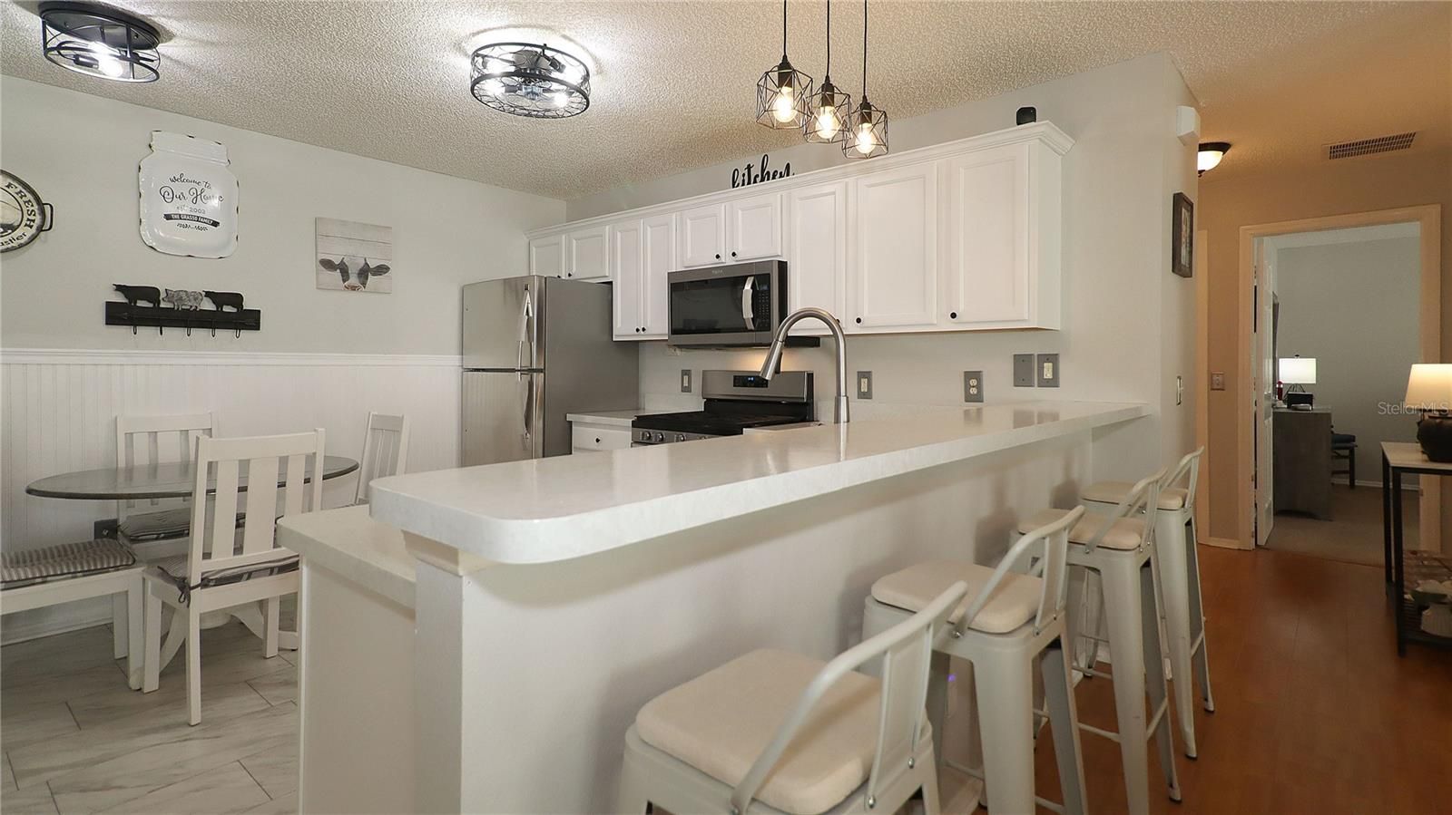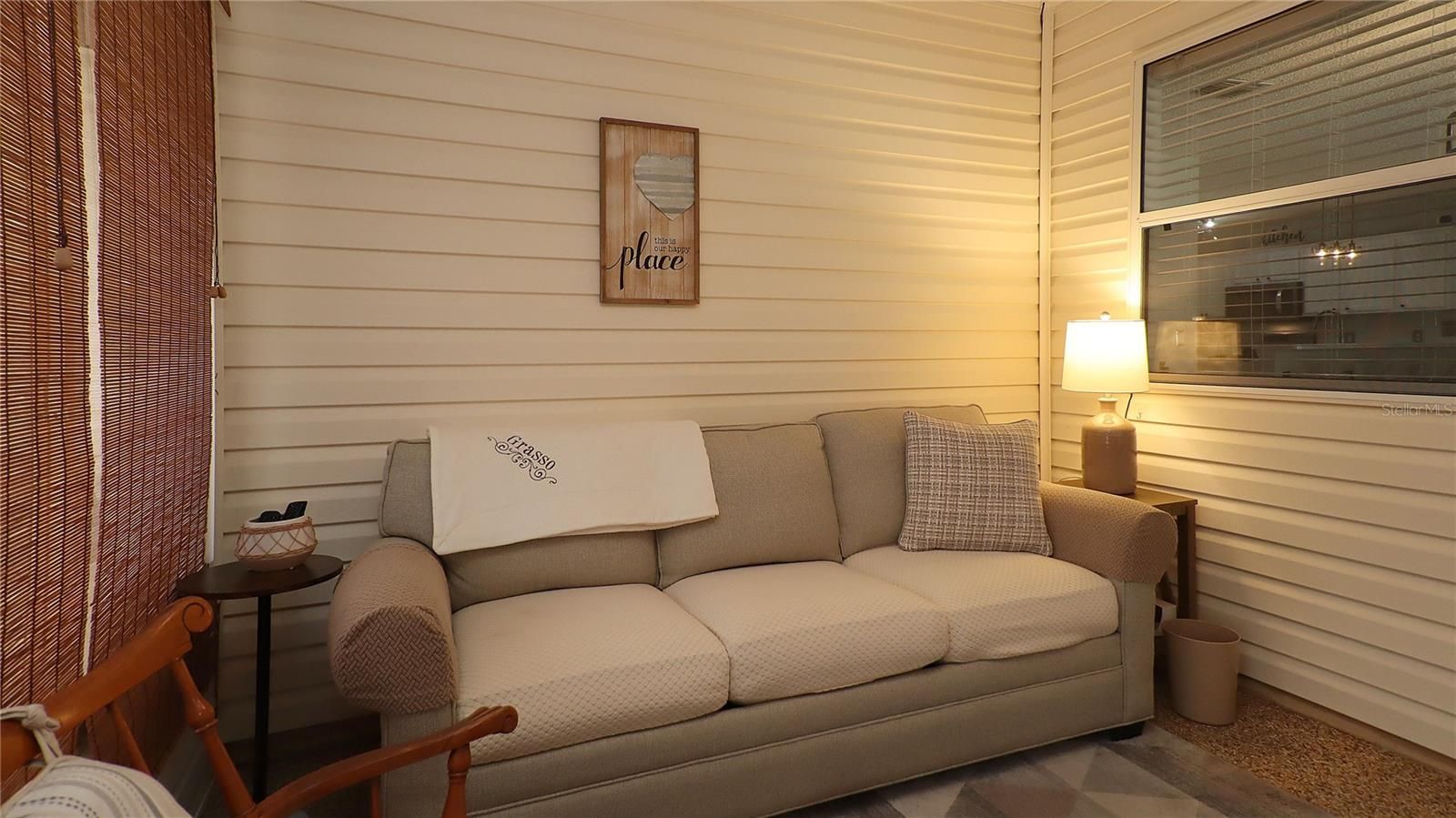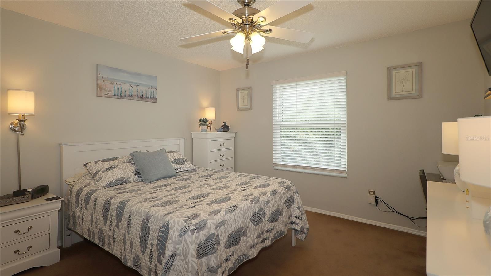 Location, location. This colony 2/2 patio villa is in a perfect location for access to golf courses, shopping and the town square at Sumter Landing. It is located in the Eagle Ridge Villas of Liberty Park. You will notice as your drive up that the driveway has been widened to have room for two cars and is beautifully painted as is the walkway. There are awnings on the front and side of the home. Enter through the enclosed lanai and you will enjoy the Chattahoochi flooring and a nice place to relax. The shades also provide privacy. Once inside this lovely villa you will see the new lights and fans that give it a nice upgraded look. The flooring in the livng and dining areas is bamboo. The kitchen is spacious enough to accomodate a nice table and chairs. Flooring in the kitchen is luxury vinyl tile. All of the appliances are stainless steel. The counter tops are a unique crystal product. The range is gas and there is a new disposal. Enjoy the decorative remote control fan in the kitchen while you do your laundry behind the glass sliding doors. There is also a nice pantry in the kitchen. Both bedrooms have closets and carpet flooring. The Primary closet is a good sized walk-in. The Primary bathroom has a shower and the guest bath has a tub and shower and the cabinets have been painted. Flooring in both bathrooms is also luxury vinyl tile. The one and a half car garage has a new opener. The roof was replaced in 2020 and there is instant tankless hot water. HVAC is 2018. All new windows have been installed as well as patio doors. The ducts were also cleaned in 2024. Home is power washed every six months. Fire $320.71, Maint. $214.74, Bond Maint $457.38, Bond balance is $2,757.27