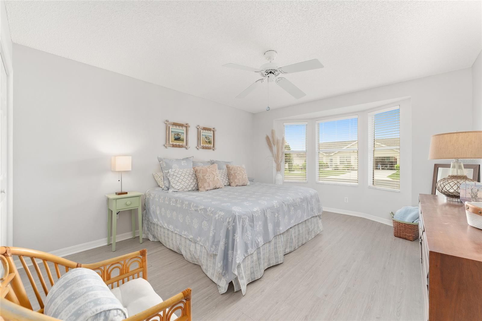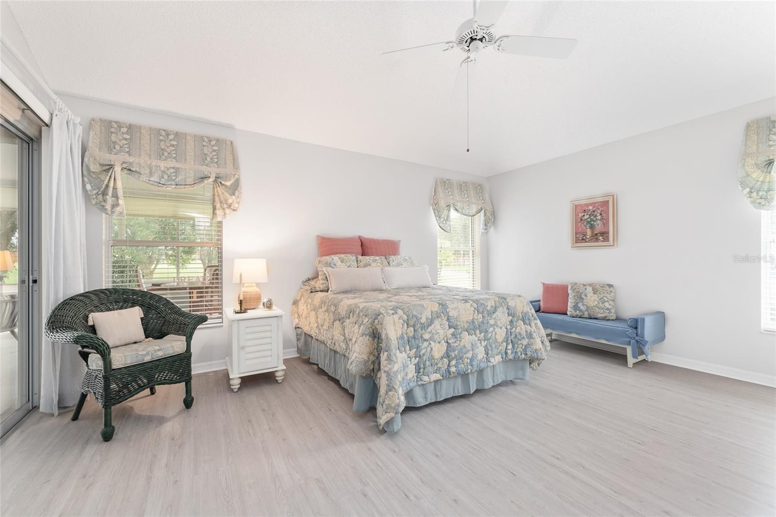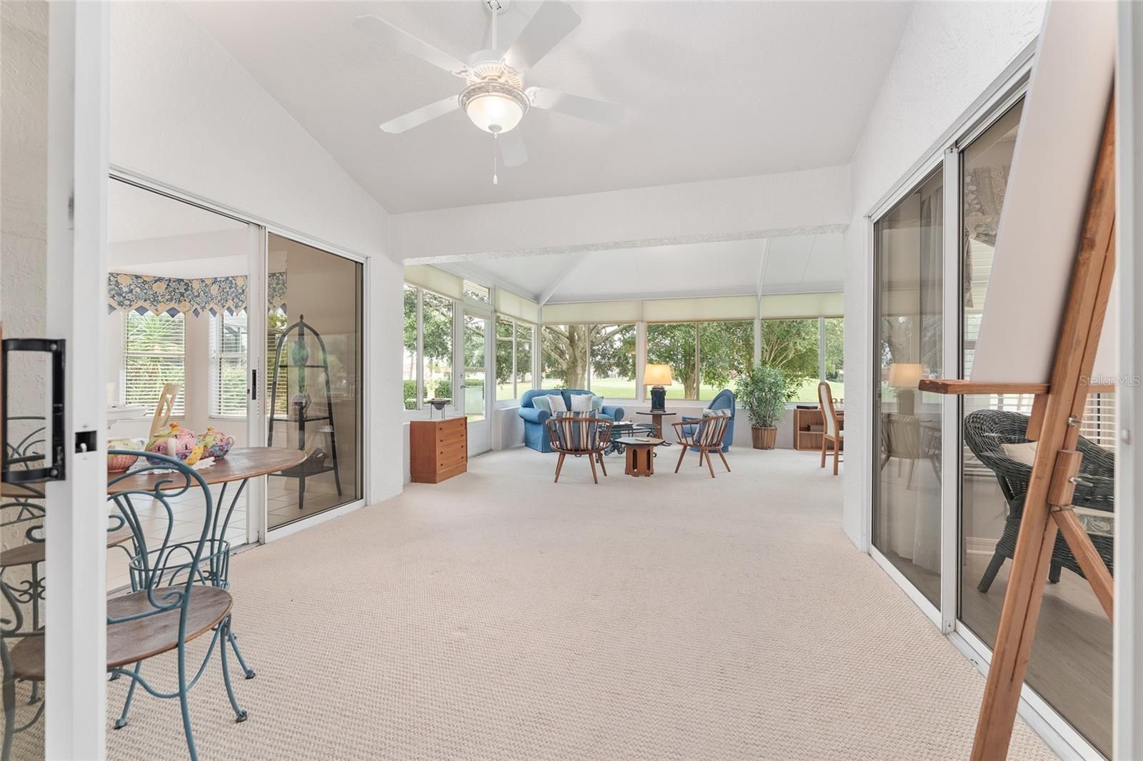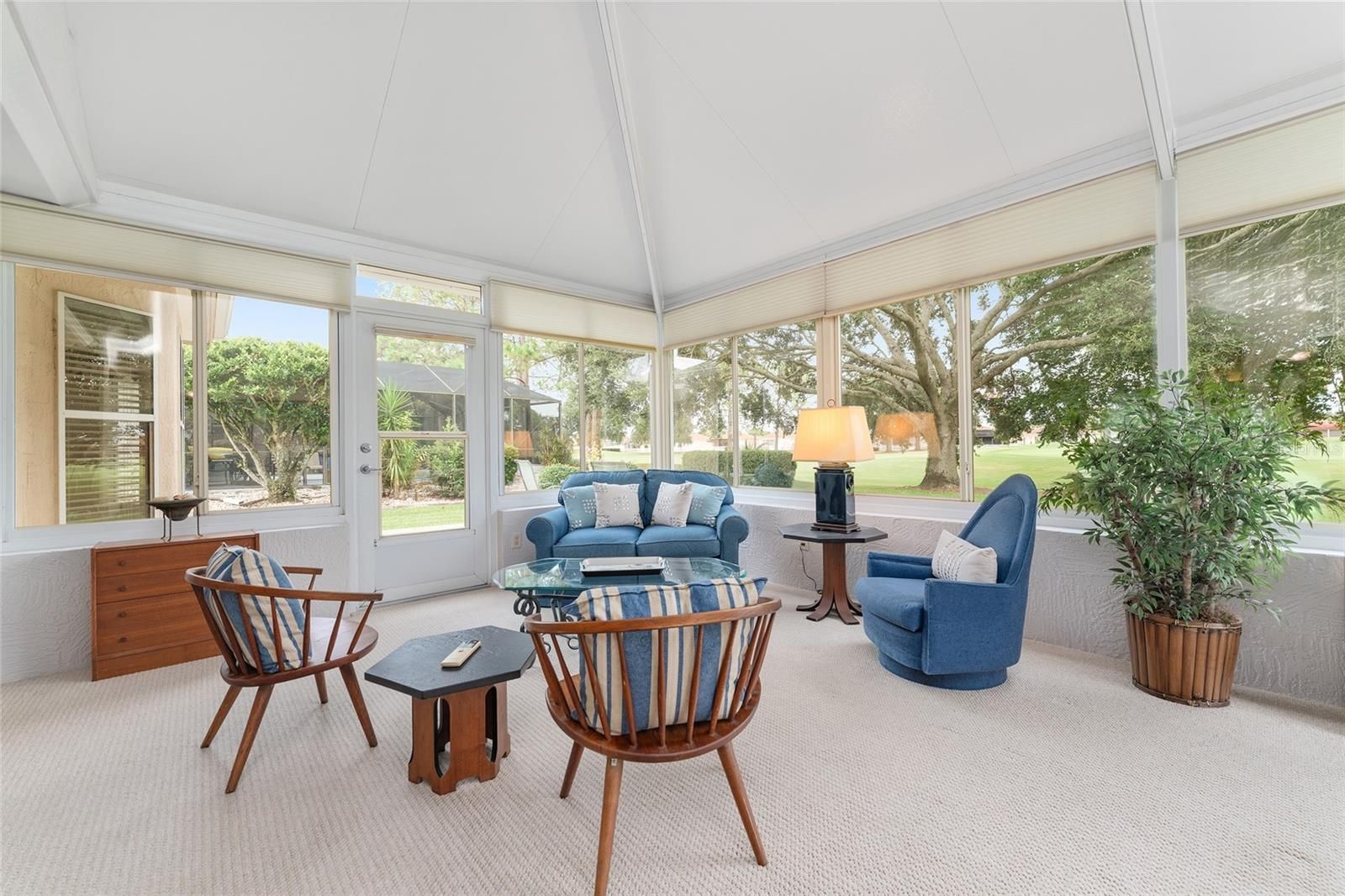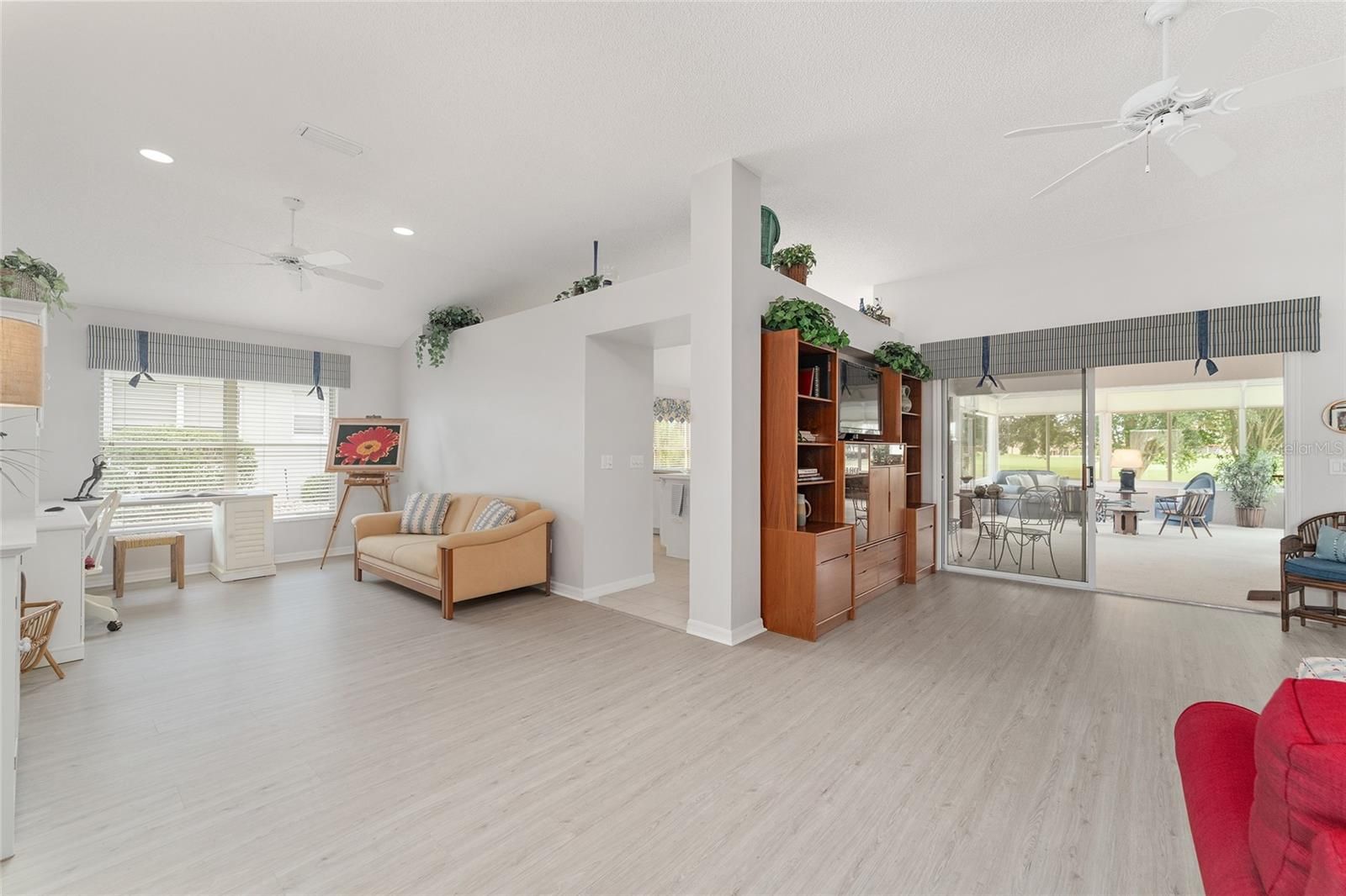 Stunning Golf Front Home on the ninth hole of Tierra Del Sol Championship Golf Course. As you arrive notice the covered front entry and double doors. Stepping inside, be prepared to be Wowed. High ceilings and lots of windows help create a bright and welcoming space. Newly painted walls and high-end luxury vinyl plank flooring add to the elegance. The large living room shares space with a bonus area currently being used as a home office/den. This area could easily be partitioned off as an additional separate room. The kitchen area is also bright and airy with white cabinets and tiled floor. The breakfast table is versatile with a great view. It's time to step into the sun room. The panoramic views of the golf course are exceptional. The open floor plan lends itself to entertaining. Whether you are relaxing, playing a game or mixing drinks, this space has it all. This area faces east offering morning sunshine and afternoon shade. It also includes a separate split system AC unit. Notice the outdoor paver patio area that helps capture the beautiful views of being outdoors. As we continue through the home visit the primary suite complete with walk-in closet, dual sinks and shower area. The guest suite is located in the front of the home providing maximum privacy. This area includes a generous closet and a full bath. Another feature of this home is the inside laundry with cabinet storage and utility sink. The location of the home can't be beat. The oversized corner lot has plenty of room for expansion, including a pool/birdcage, (see site plan). It is also a short stroll to the Tierra Del Sol Country Club offering fine dining or a fun lunch. Also, take advantage of all of that this area has to offer, which includes pools, tennis, pickleball, Recreation Centers and Town Squares. Please take a look at the pictures and professional video and then call to schedule a private showing. Bond is Paid
