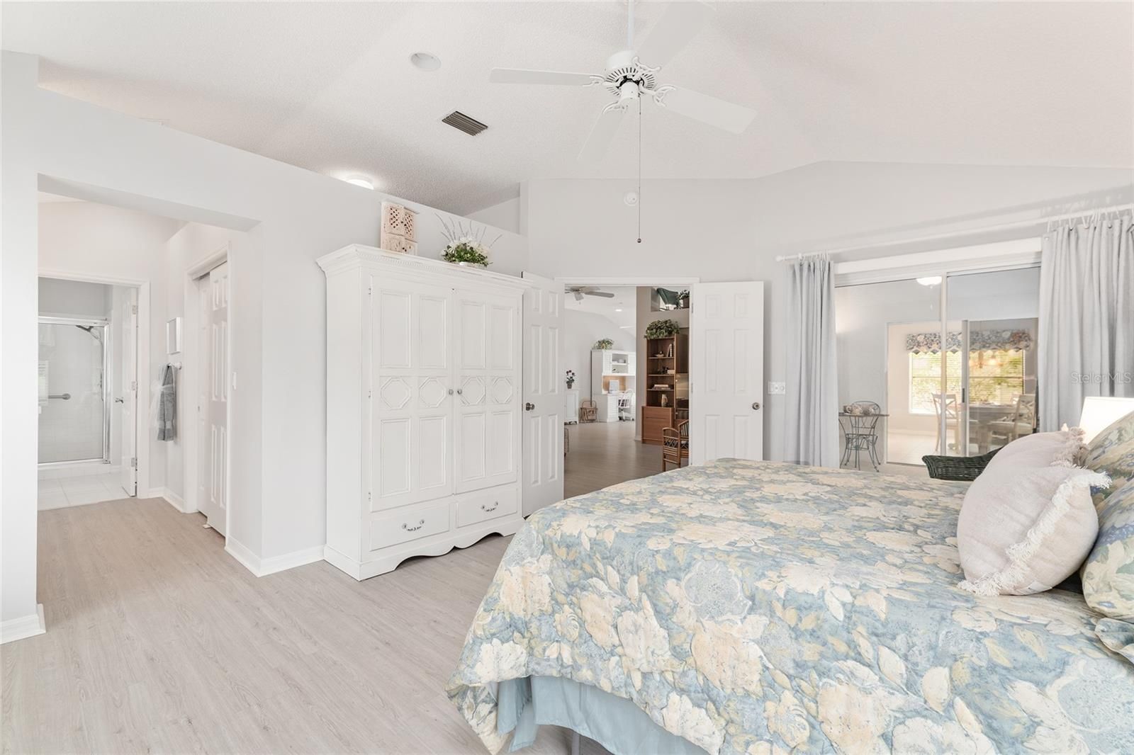 - Ceiling Fan(s), Eat-in Kitchen, High Ceilings, Open Floorplan, Main Level Primary, Solid-Wood Cabinets, Thermostat, Walk-In Closet(s), Window Treatments