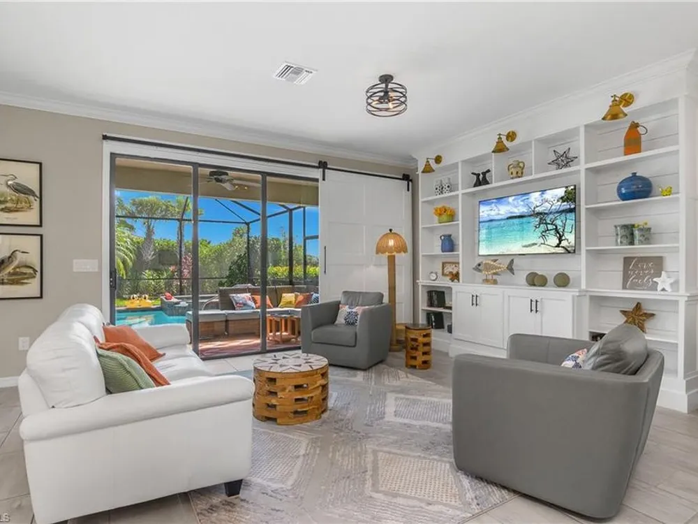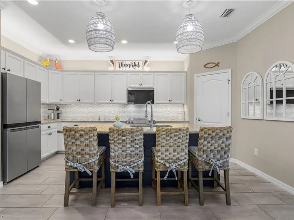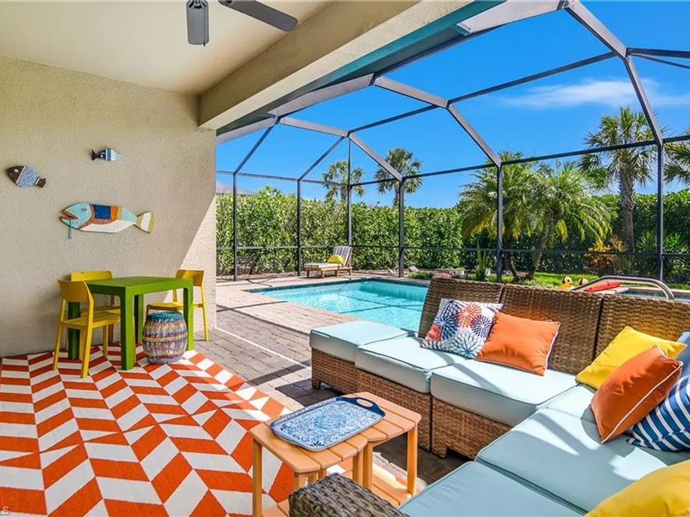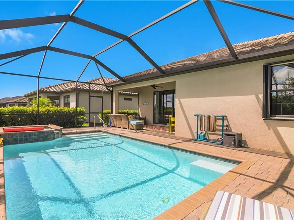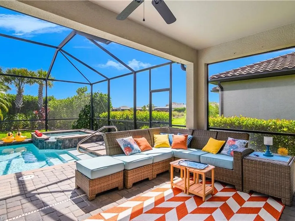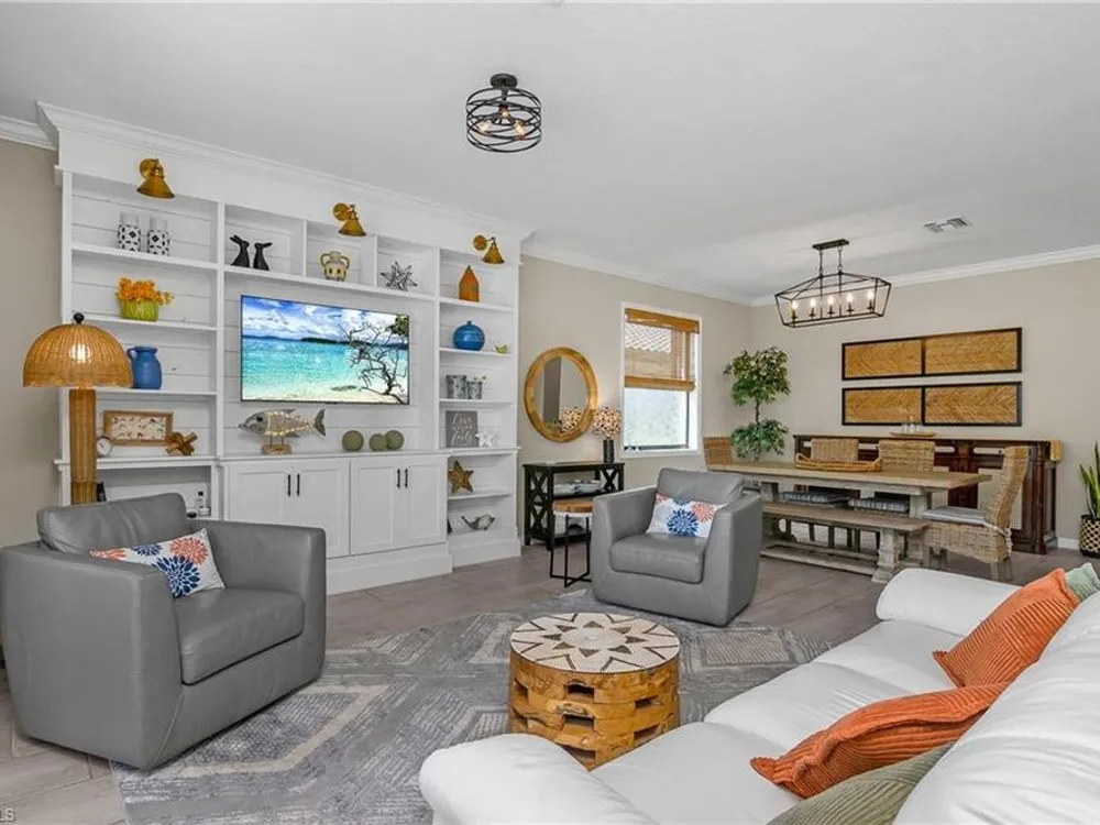 Step into refined comfort with this meticulously designed and fully furnished 4-bedroom, 3-bathroom residence located in one of Southwest Florida’s most sought-after gated communities. The open-concept living area features a custom-built entertainment center with floating shelves, tile throughout with no carpet, and crown molding that add architectural interest. The kitchen is both stylish and functional, showcasing tile backsplash, upgraded stainless steel appliances, over-cabinet and under-cabinet lighting, and a large island that provides ample prep and seating space. The primary suite offers a peaceful escape with a custom shiplap accent wall and a luxurious ensuite bath complete with a frameless glass rain shower, dual sinks, and designer finishes. Secondary bedrooms are generously sized, and all three full bathrooms have been upgraded with modern vanities and tilework. Outdoors, enjoy a private oasis within the screened lanai, where a heated pool and spa are surrounded by lush tropical landscaping. The covered patio provides the perfect space for shaded relaxation or outdoor dining. Additional upgrades include accordion hurricane shutters for added storm protection, a UV light system installed in the AC for enhanced air quality, and a full suite of stylish furnishings, making this home truly move-in ready. As a resident of The Place at Corkscrew, you'll enjoy access to a remarkable array of amenities that cater to your every need. Dive into the resort-style pool featuring a thrilling 100' waterslide, relax in the expansive spa, or let the kids splash around in the dedicated splash pad. Socialize around the firepit or enjoy delicious meals at the Barefoot Bar & Grill, the Bourbon Bar, or the poolside martini bar. For those who prioritize fitness, the fitness center is equipped with exercise equipment and a movement studio, along with a variety of sports courts, including tennis, pickleball, and basketball. Enjoy the sugar-sand volleyball court, let the kids play at the playground, or take your furry friend to the dog park.