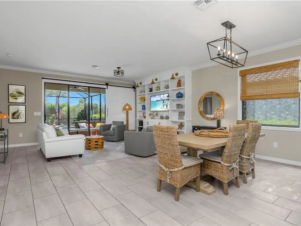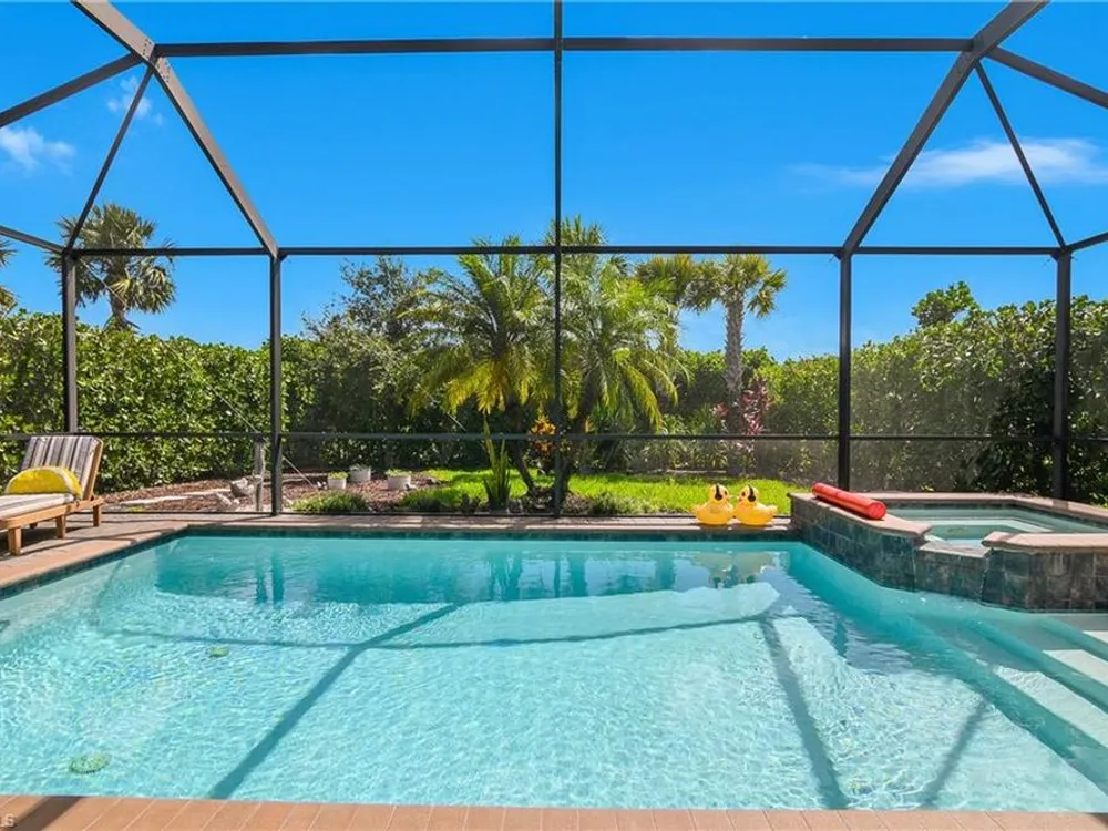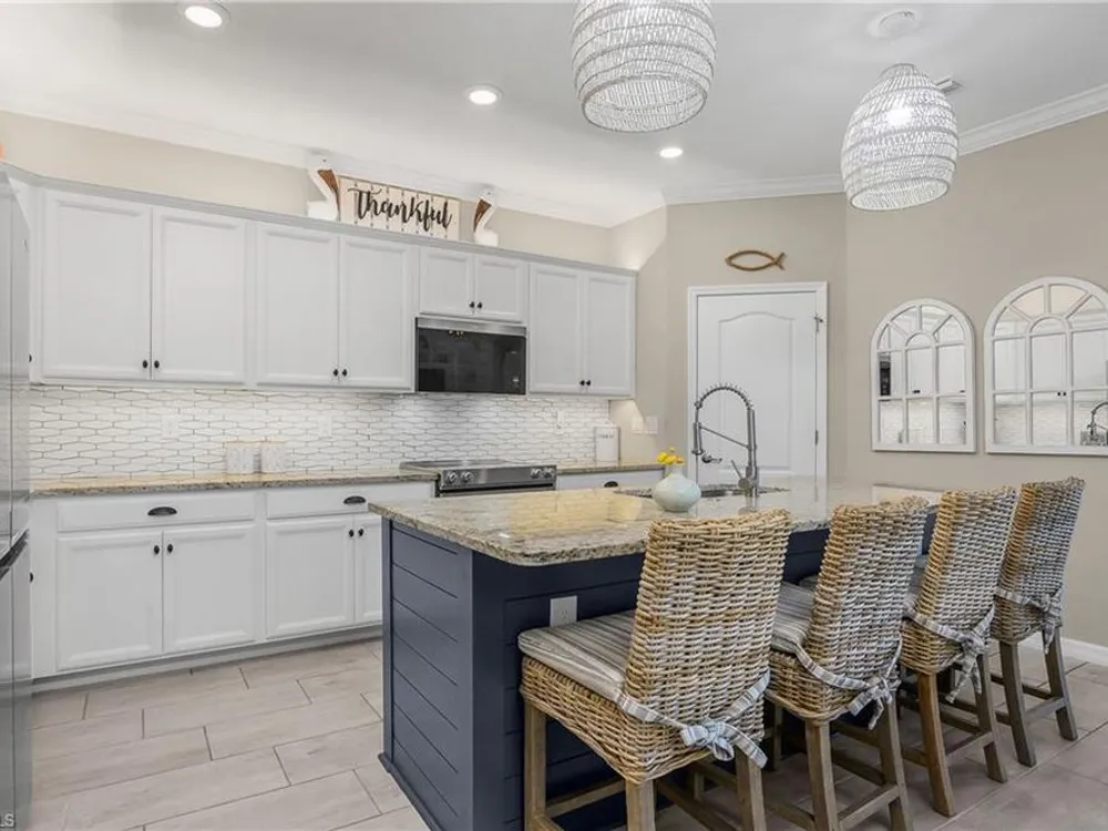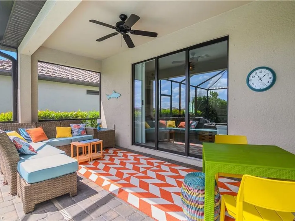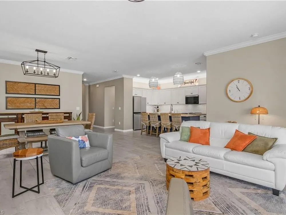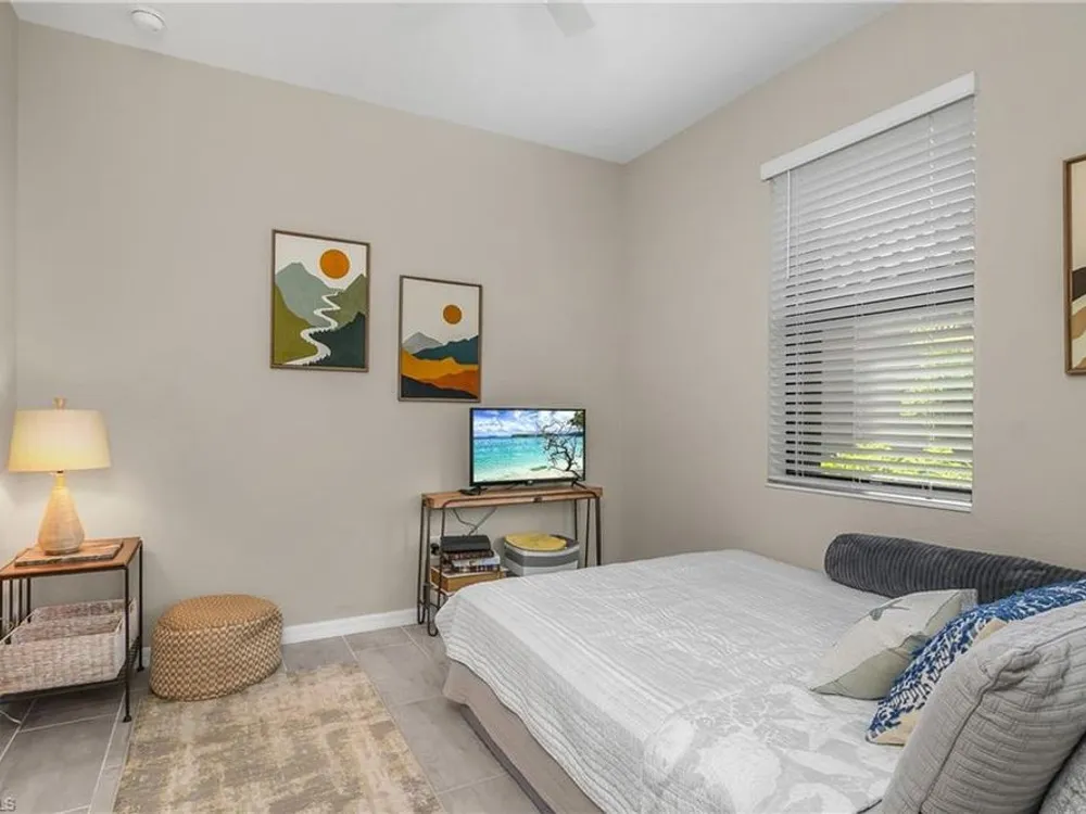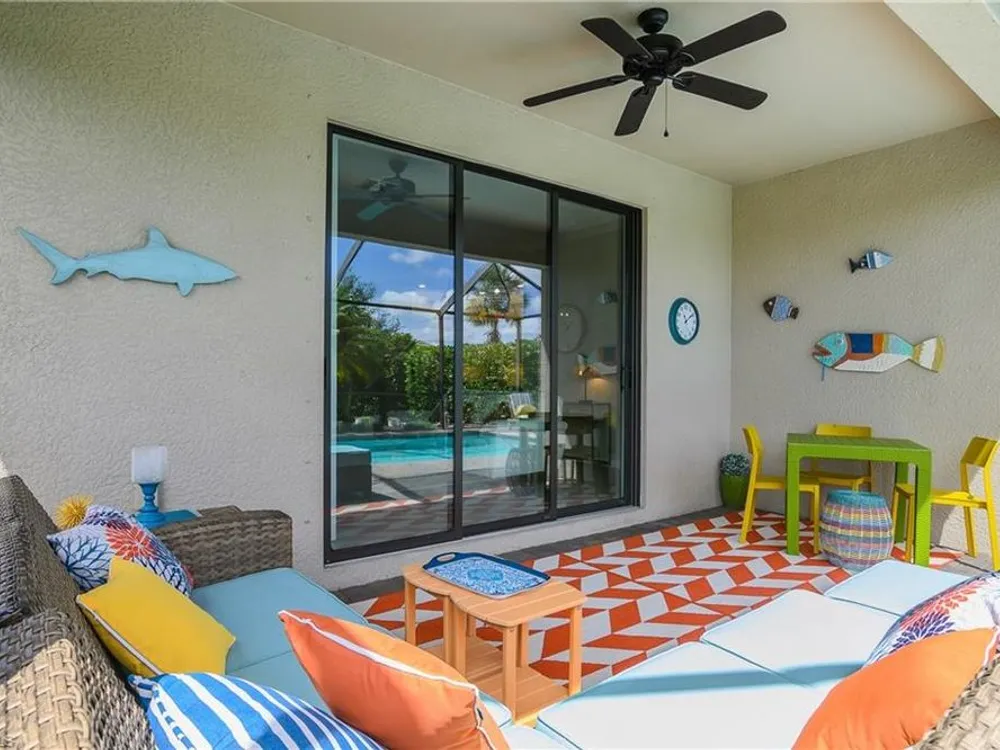 Step into refined comfort with this meticulously designed and fully furnished 4-bedroom, 3-bathroom residence located in one of Southwest Florida’s most sought-after gated communities. The open-concept living area features a custom-built entertainment center with floating shelves, tile throughout with no carpet, and crown molding that add architectural interest. The kitchen is both stylish and functional, showcasing tile backsplash, upgraded stainless steel appliances, over-cabinet and under-cabinet lighting, and a large island that provides ample prep and seating space. The primary suite offers a peaceful escape with a custom shiplap accent wall and a luxurious ensuite bath complete with a frameless glass rain shower, dual sinks, and designer finishes. Secondary bedrooms are generously sized, and all three full bathrooms have been upgraded with modern vanities and tilework. Outdoors, enjoy a private oasis within the screened lanai, where a heated pool and spa are surrounded by lush tropical landscaping. The covered patio provides the perfect space for shaded relaxation or outdoor dining. Additional upgrades include accordion hurricane shutters for added storm protection, a UV light system installed in the AC for enhanced air quality, and a full suite of stylish furnishings, making this home truly move-in ready. As a resident of The Place at Corkscrew, you'll enjoy access to a remarkable array of amenities that cater to your every need. Dive into the resort-style pool featuring a thrilling 100' waterslide, relax in the expansive spa, or let the kids splash around in the dedicated splash pad. Socialize around the firepit or enjoy delicious meals at the Barefoot Bar & Grill, the Bourbon Bar, or the poolside martini bar. For those who prioritize fitness, the fitness center is equipped with exercise equipment and a movement studio, along with a variety of sports courts, including tennis, pickleball, and basketball. Enjoy the sugar-sand volleyball court, let the kids play at the playground, or take your furry friend to the dog park.