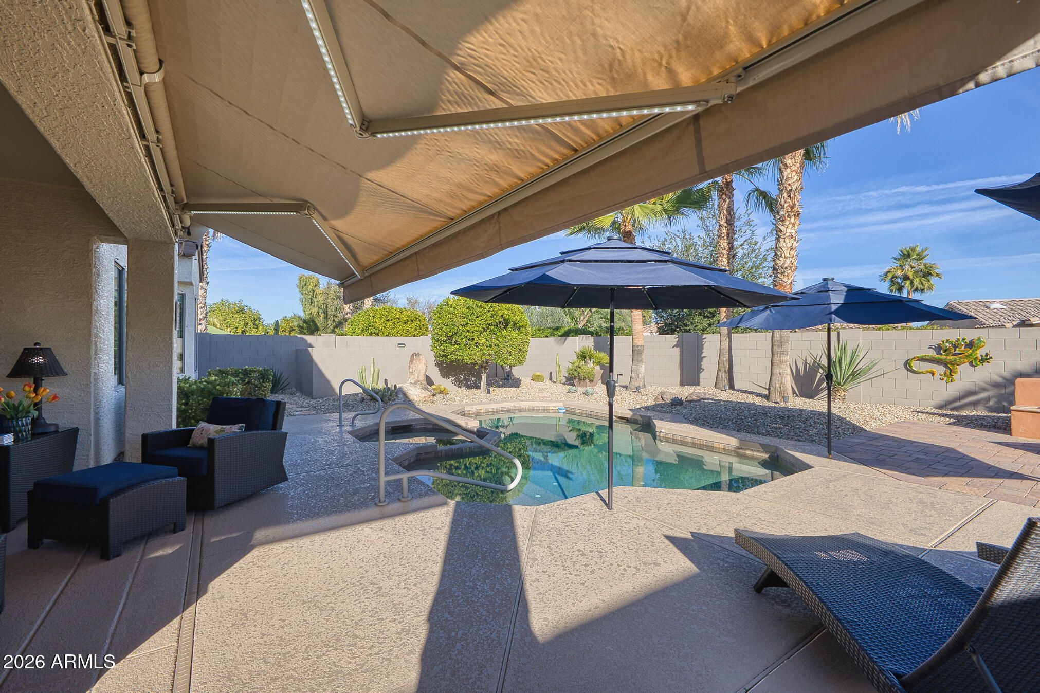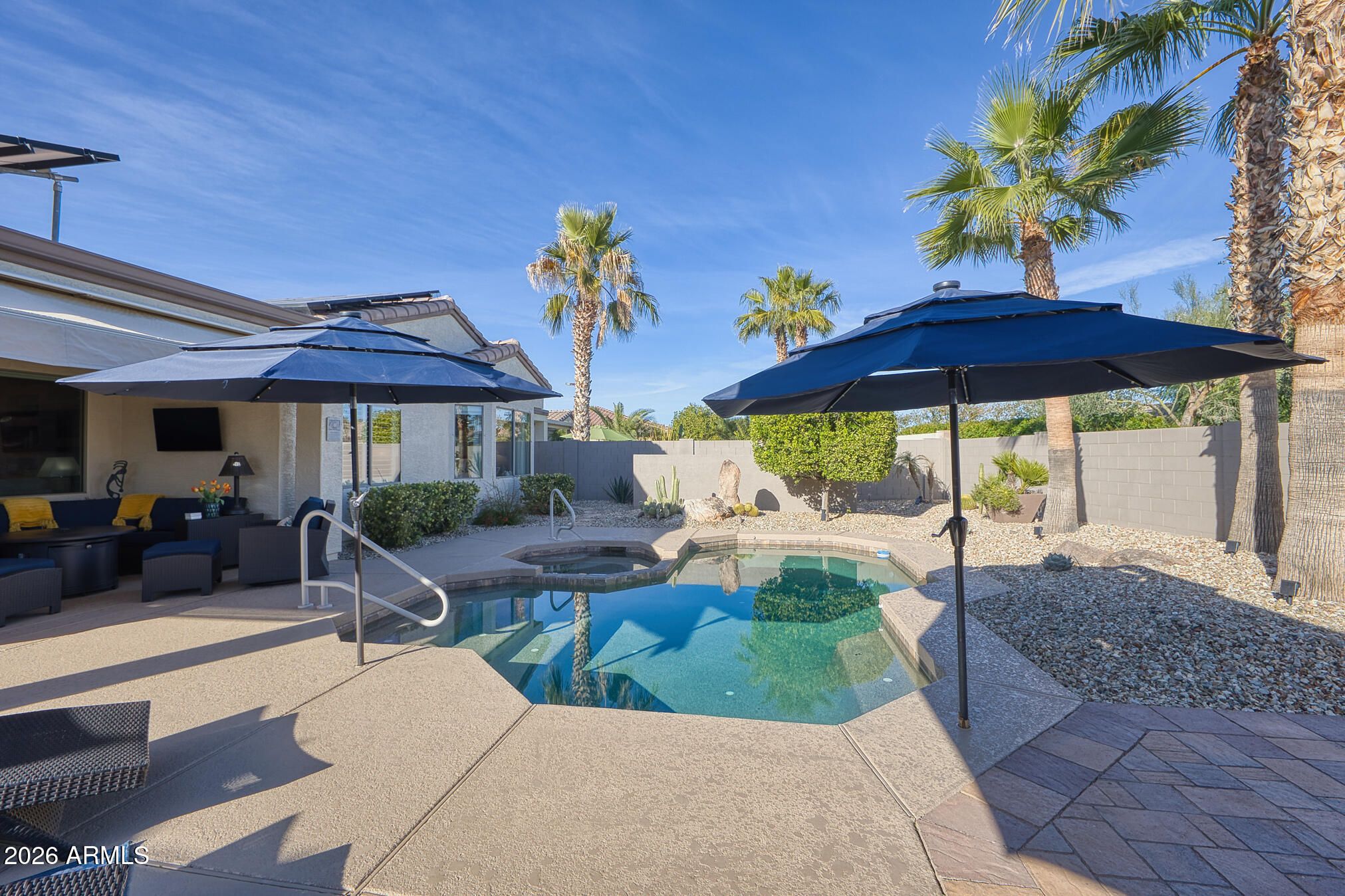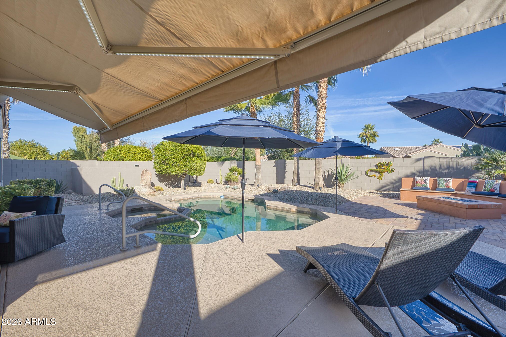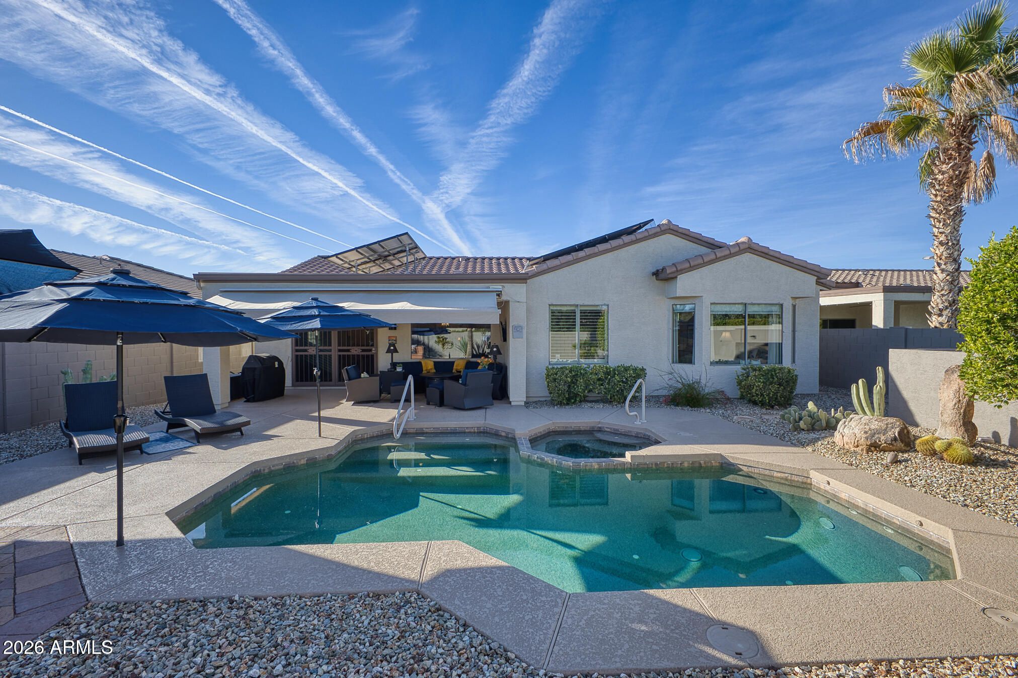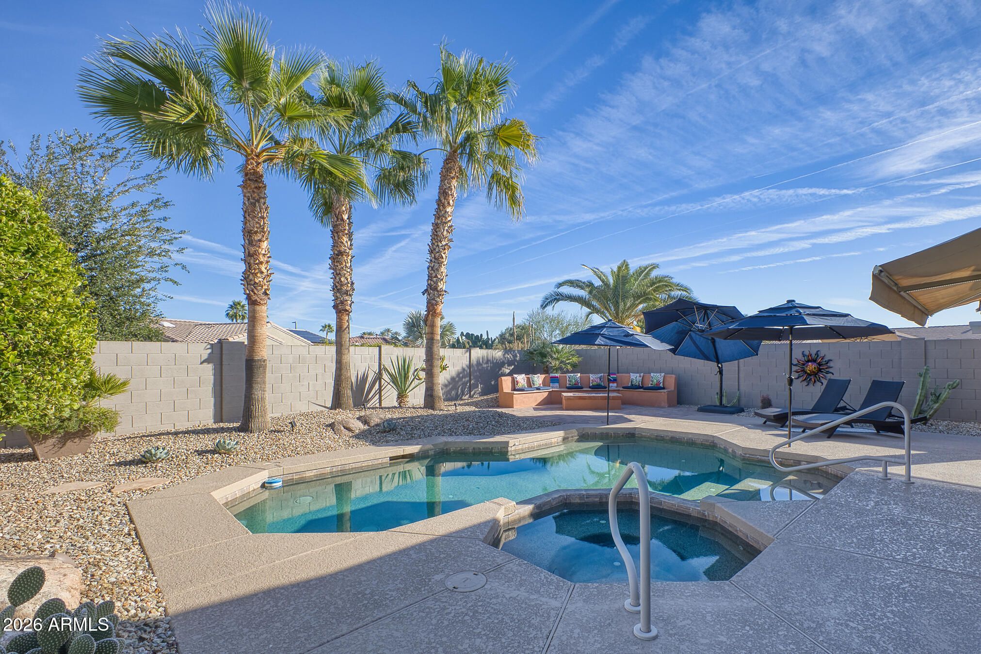 A charming Desert Rose welcomes you with warm, casual elegance. An inviting Arizona-inspired color palette blended with modern design creates a tranquil retreat. The updated kitchen features white cabinetry, granite countertops, an undermount white sink, updated faucet, and newer stainless steel appliances. A cozy breakfast nook with a wood-look accent wall and a breakfast bar with designer pendant lighting provide additional seating for casual dining. The open great room offers a custom A/V wall, formal dining area, and a versatile den/office with privacy doors—ideal as a 2nd guest room. The primary suite features a bay window with sconce lighting and soft draperies, plus a stylish barn door leading to the ensuite bath. Here, you'll find white cabinetry/vanity, undermount sink, and a spacious tiled zero-threshold walk-in shower. A huge walk-in closet completes the retreat. The guest bath has been updated with a granite-topped vanity, bowl style sink, decorative faucets, white cabinetry, new toilet, and tiled walk-in shower, with convenient access from both the hallway and the spacious guest bedroom. Plantation shutters, six-panel decorative interior doors, and thoughtful designer touches enhance the home throughout. Enjoy super-low power bills with a prepaid solar lease. The recent installation of a whole-house fan allows for additional energy efficient cooling of the house in the hot months and warming in the cooler months. Step outside to a private, walled backyard oasis featuring a custom-designed heated salt water pool with in floor auto cleaning and new pool motor, spa, fire pit with built-in seating, extended partially covered patio, cool deck surface, solar-lit umbrellas, and motorized lighted sun shadesperfect for entertaining or relaxing. In 2025 installed completely new sprinkler system with professional grade timer, vacuum breaker, valves, pipes and drip heads. The extended garage includes epoxy flooring, built-in cabinets, a workbench, and a side service door. Ideally located near amenities, this home offers comfort, style, and resort-like living.