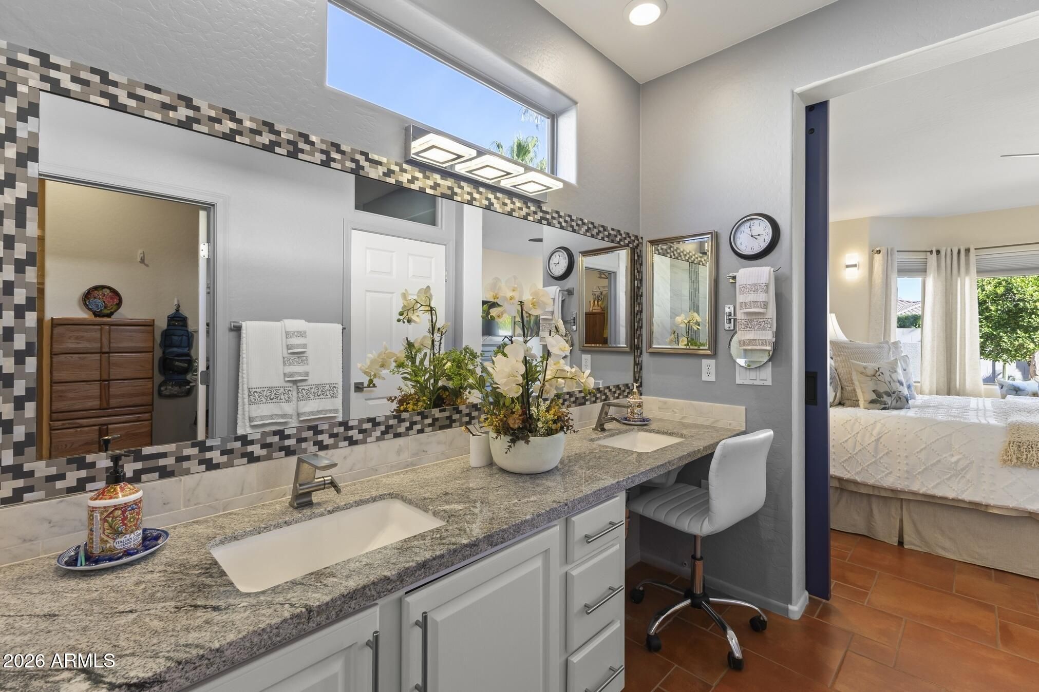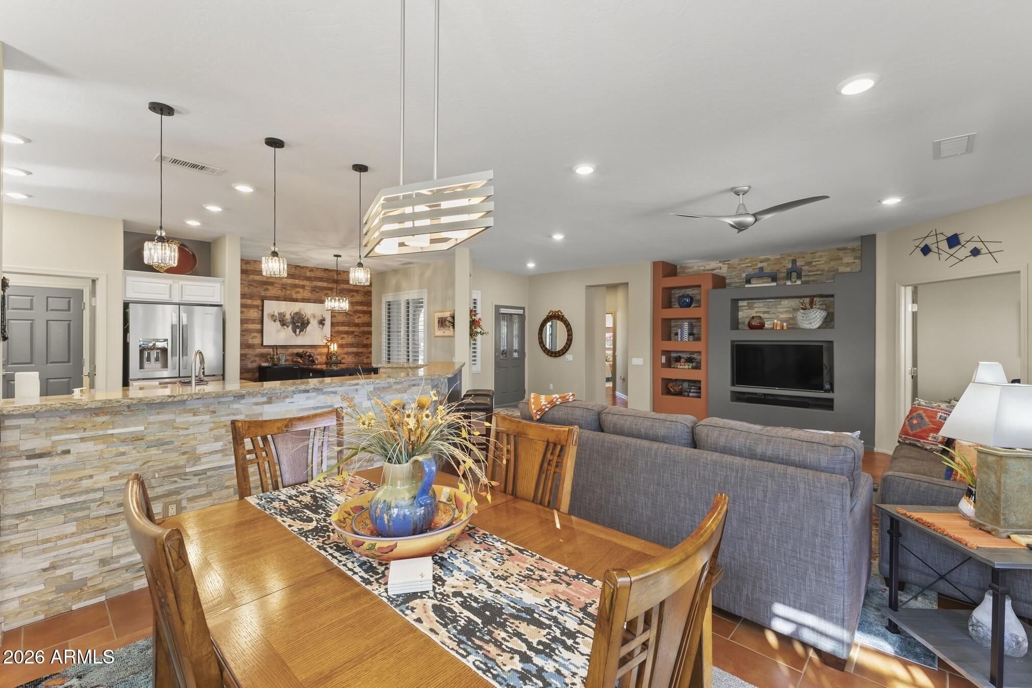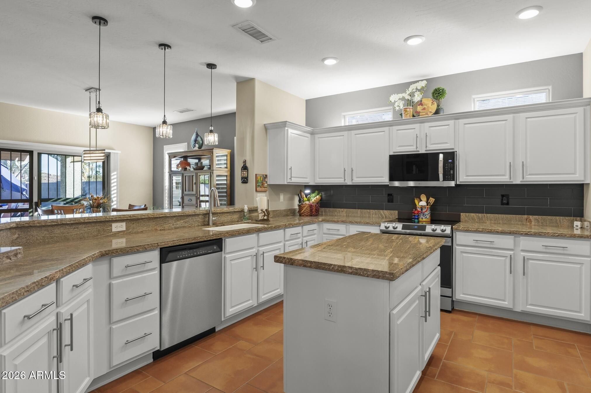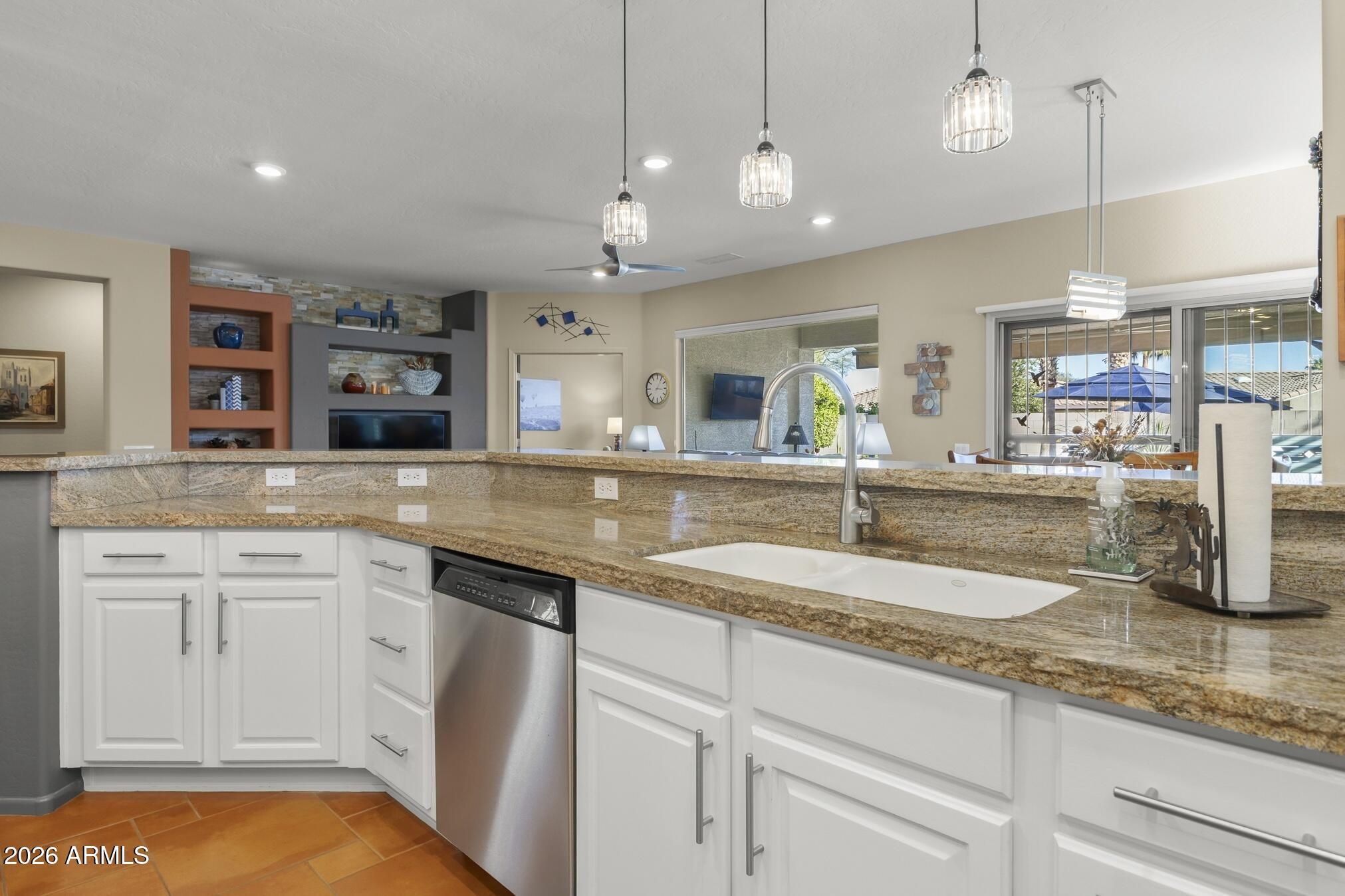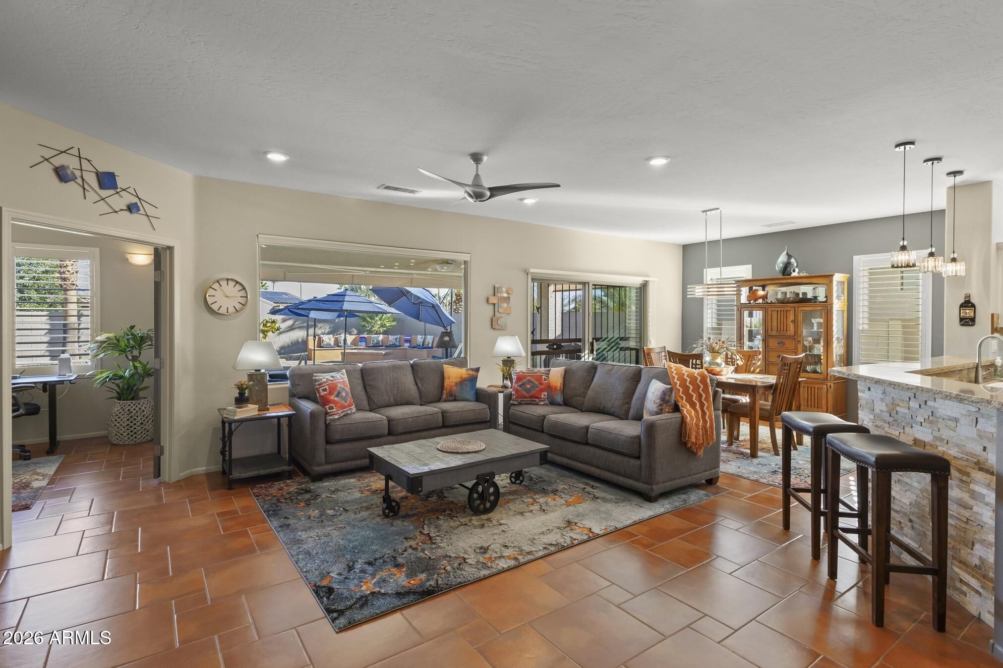 A charming Desert Rose welcomes you with warm, casual elegance. An inviting Arizona-inspired color palette blended with modern design creates a tranquil retreat. The updated kitchen features white cabinetry, granite countertops, an undermount white sink, updated faucet, and newer stainless steel appliances. A cozy breakfast nook with a wood-look accent wall and a breakfast bar with designer pendant lighting provide additional seating for casual dining. The open great room offers a custom A/V wall, formal dining area, and a versatile den/office with privacy doors—ideal as a 2nd guest room. The primary suite features a bay window with sconce lighting and soft draperies, plus a stylish barn door leading to the ensuite bath. Here, you'll find white cabinetry/vanity, undermount sink, and a spacious tiled zero-threshold walk-in shower. A huge walk-in closet completes the retreat. The guest bath has been updated with a granite-topped vanity, bowl style sink, decorative faucets, white cabinetry, new toilet, and tiled walk-in shower, with convenient access from both the hallway and the spacious guest bedroom. Plantation shutters, six-panel decorative interior doors, and thoughtful designer touches enhance the home throughout. Enjoy super-low power bills with a prepaid solar lease. The recent installation of a whole-house fan allows for additional energy efficient cooling of the house in the hot months and warming in the cooler months. Step outside to a private, walled backyard oasis featuring a custom-designed heated salt water pool with in floor auto cleaning and new pool motor, spa, fire pit with built-in seating, extended partially covered patio, cool deck surface, solar-lit umbrellas, and motorized lighted sun shadesperfect for entertaining or relaxing. In 2025 installed completely new sprinkler system with professional grade timer, vacuum breaker, valves, pipes and drip heads. The extended garage includes epoxy flooring, built-in cabinets, a workbench, and a side service door. Ideally located near amenities, this home offers comfort, style, and resort-like living.