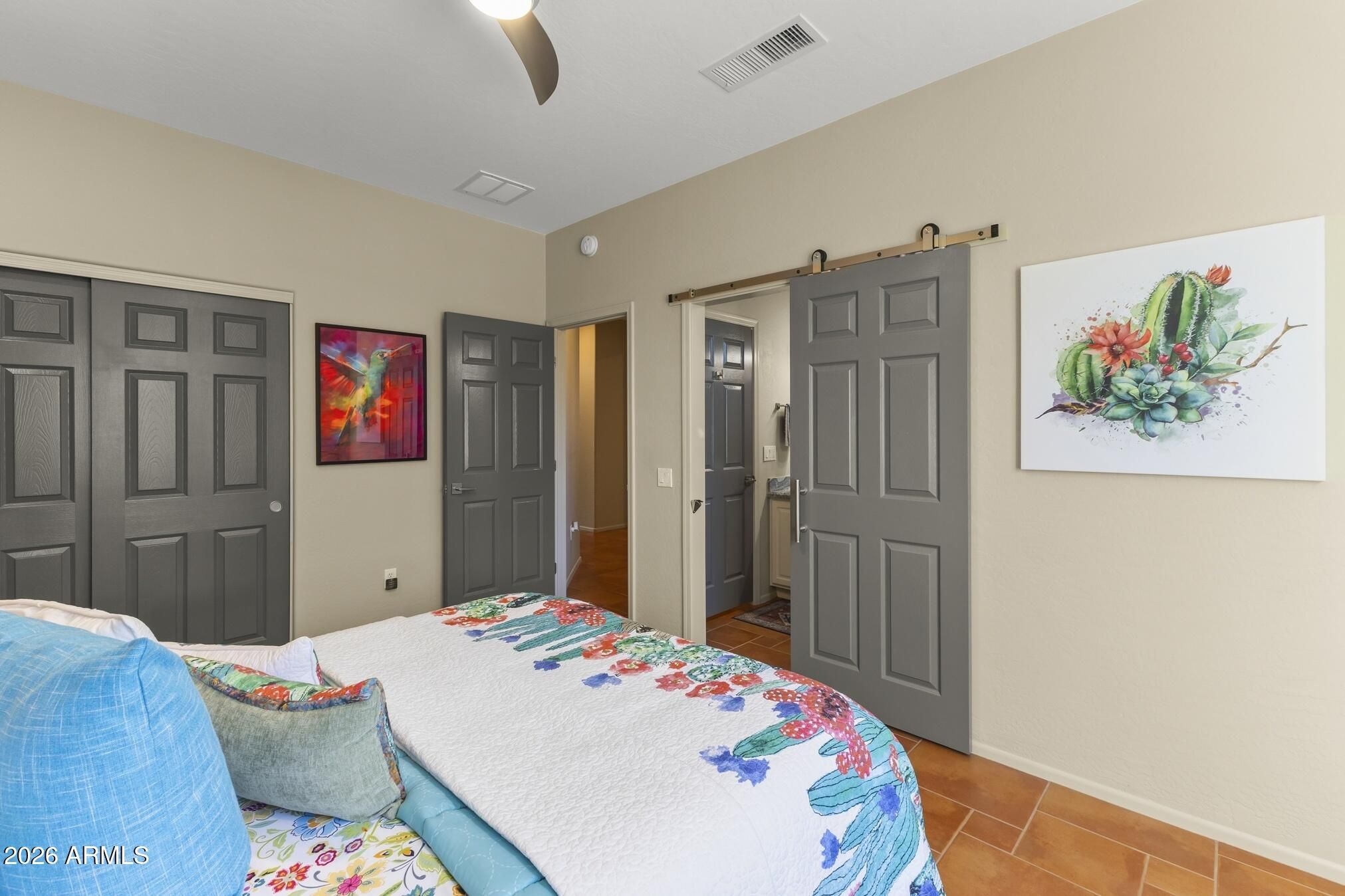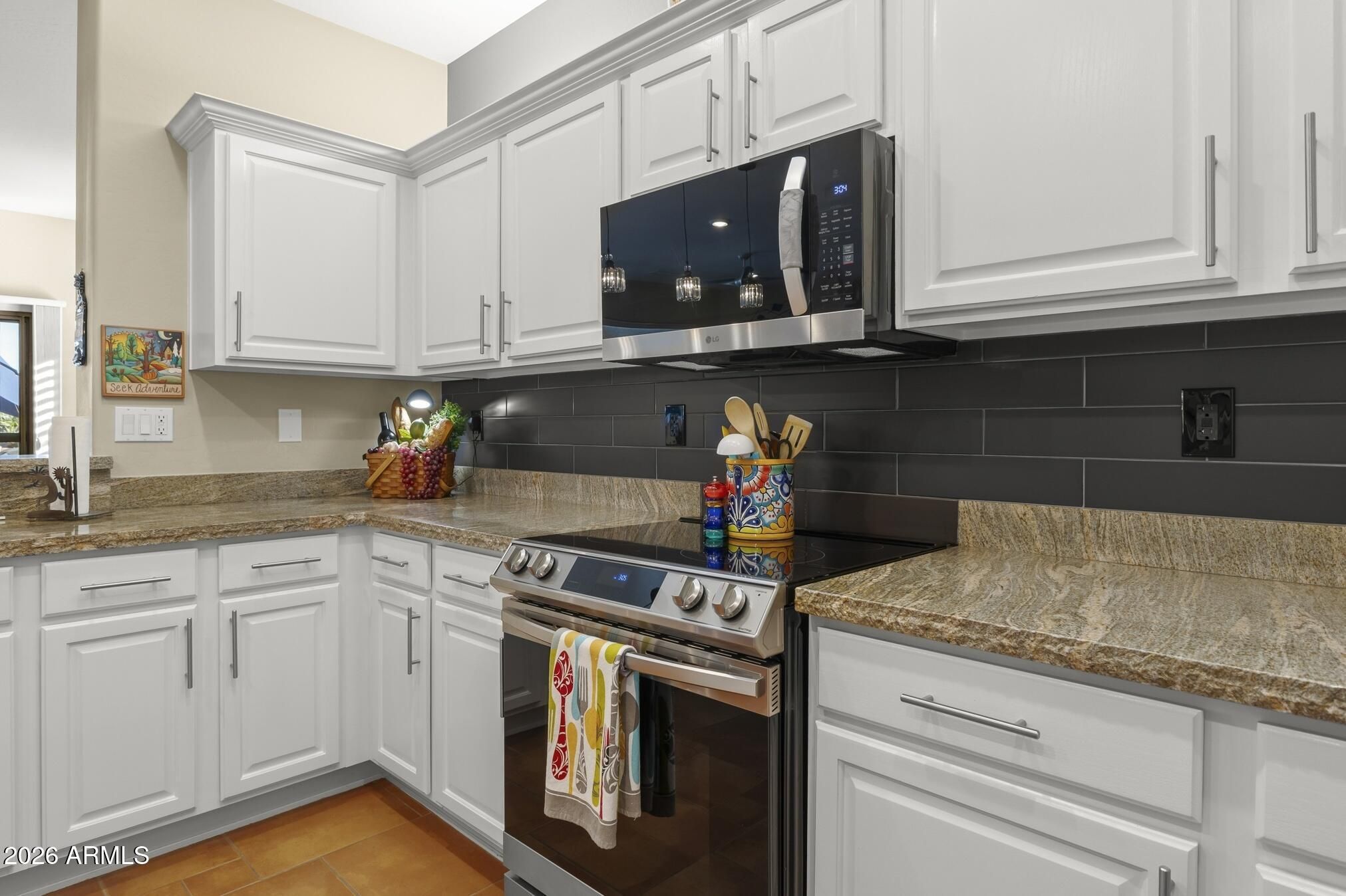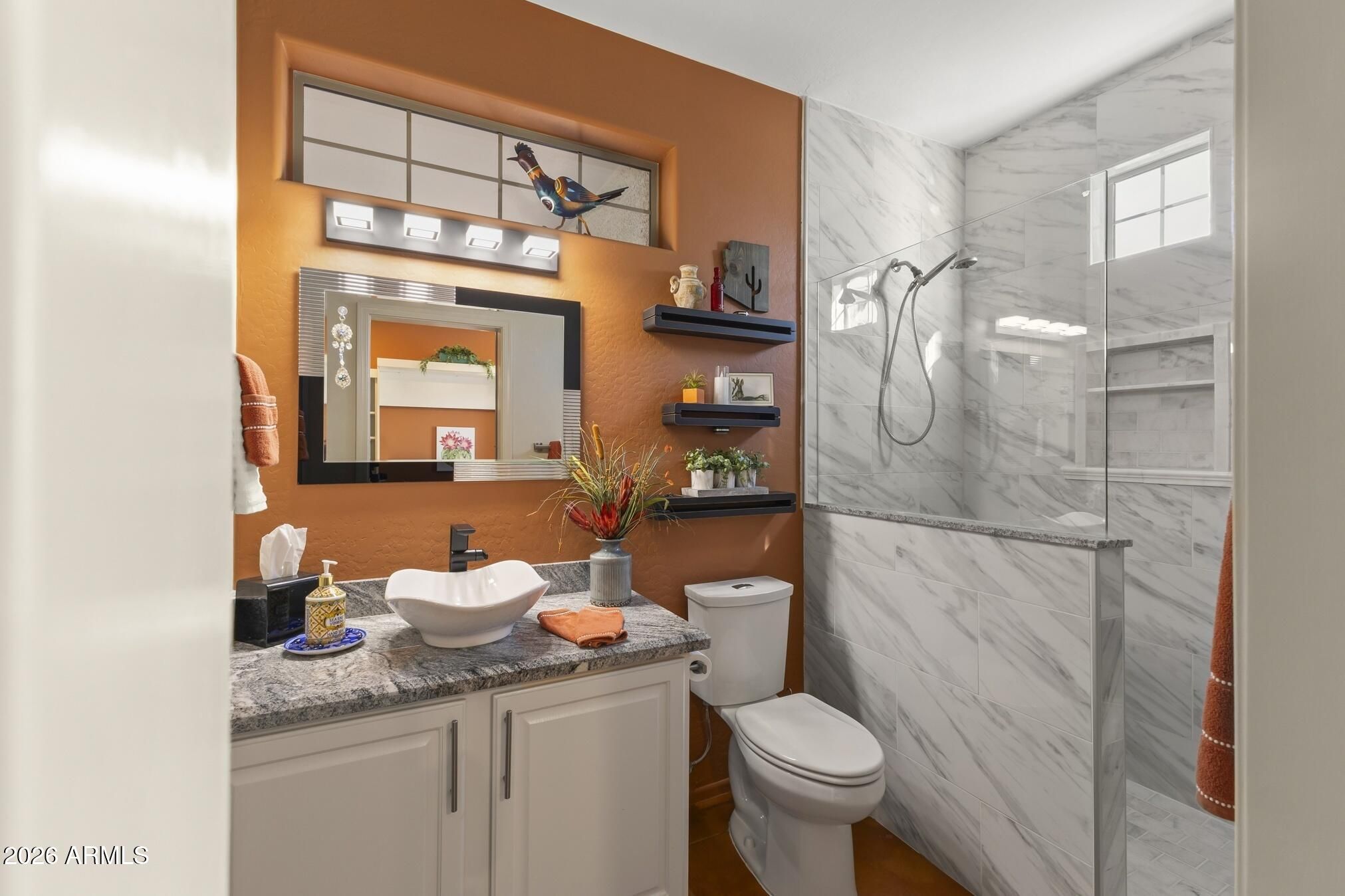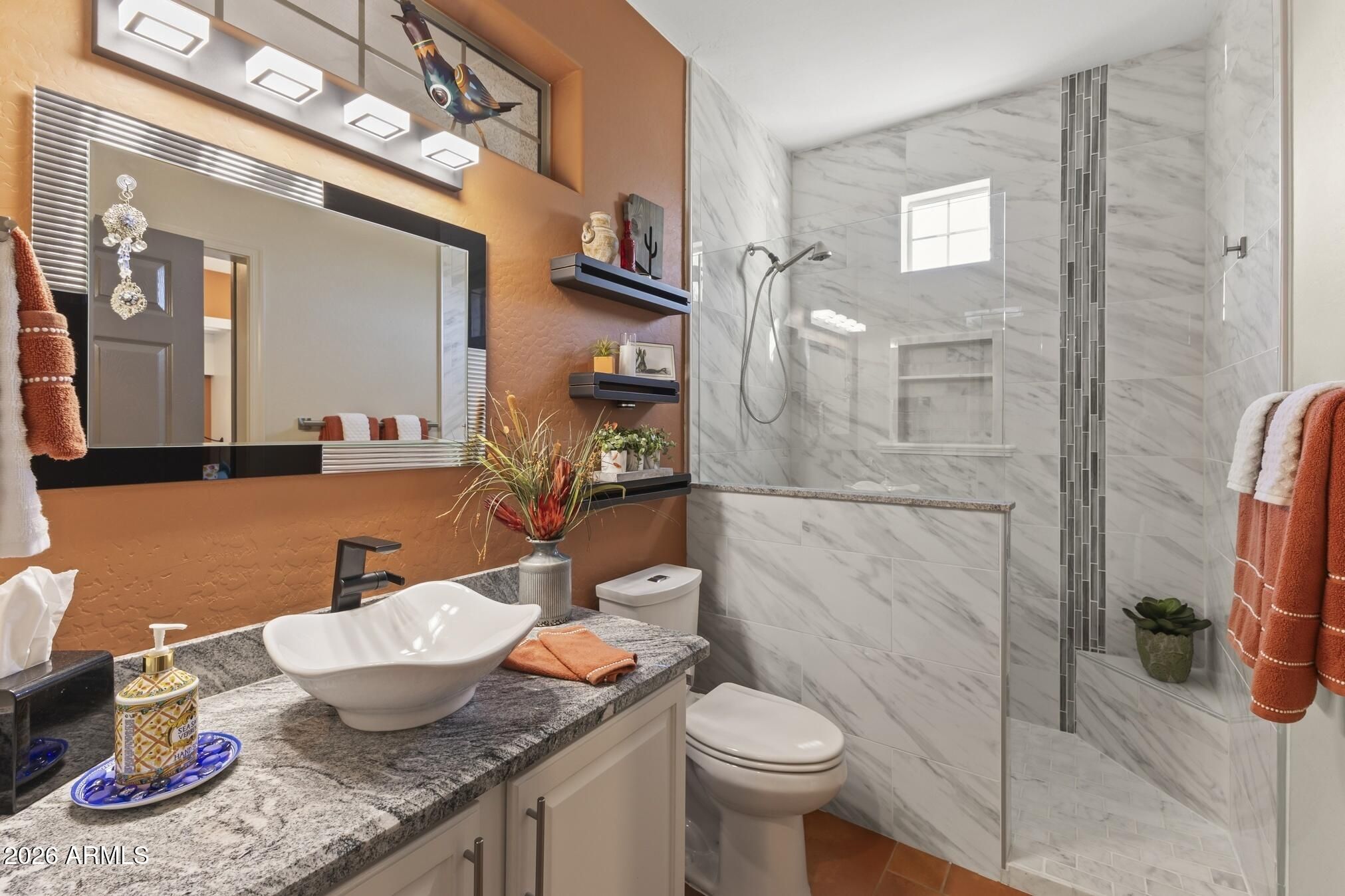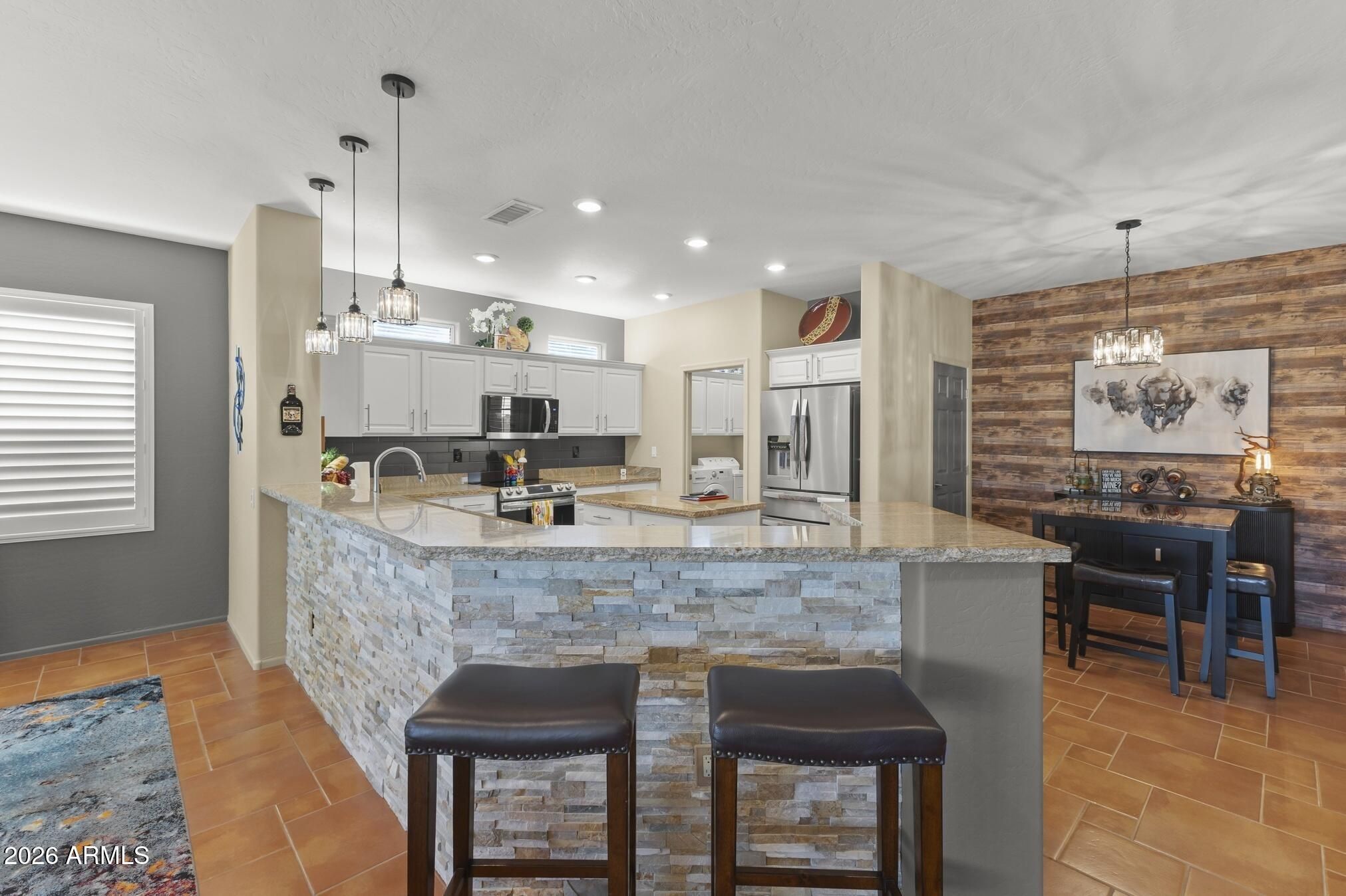 A charming Desert Rose welcomes you with warm, casual elegance. An inviting Arizona-inspired color palette blended with modern design creates a tranquil retreat. The updated kitchen features white cabinetry, granite countertops, an undermount white sink, updated faucet, and newer stainless steel appliances. A cozy breakfast nook with a wood-look accent wall and a breakfast bar with designer pendant lighting provide additional seating for casual dining. The open great room offers a custom A/V wall, formal dining area, and a versatile den/office with privacy doors—ideal as a 2nd guest room. The primary suite features a bay window with sconce lighting and soft draperies, plus a stylish barn door leading to the ensuite bath. Here, you'll find white cabinetry/vanity, undermount sink, and a spacious tiled zero-threshold walk-in shower. A huge walk-in closet completes the retreat. The guest bath has been updated with a granite-topped vanity, bowl style sink, decorative faucets, white cabinetry, new toilet, and tiled walk-in shower, with convenient access from both the hallway and the spacious guest bedroom. Plantation shutters, six-panel decorative interior doors, and thoughtful designer touches enhance the home throughout. Enjoy super-low power bills with a prepaid solar lease. The recent installation of a whole-house fan allows for additional energy efficient cooling of the house in the hot months and warming in the cooler months. Step outside to a private, walled backyard oasis featuring a custom-designed heated salt water pool with in floor auto cleaning and new pool motor, spa, fire pit with built-in seating, extended partially covered patio, cool deck surface, solar-lit umbrellas, and motorized lighted sun shadesperfect for entertaining or relaxing. In 2025 installed completely new sprinkler system with professional grade timer, vacuum breaker, valves, pipes and drip heads. The extended garage includes epoxy flooring, built-in cabinets, a workbench, and a side service door. Ideally located near amenities, this home offers comfort, style, and resort-like living.