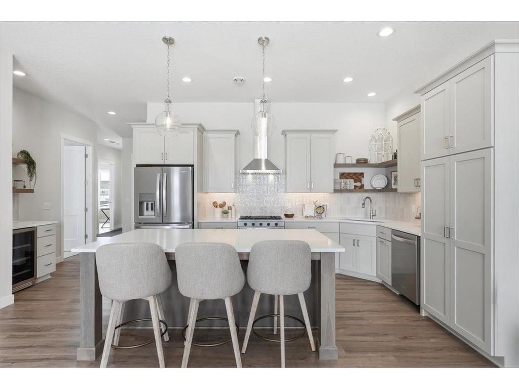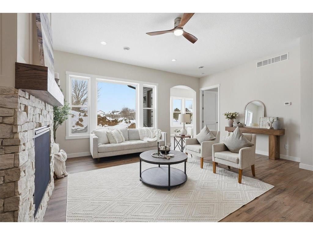 Welcome to Cattail Villas ? New Richmond?s Premier 55+ Private Community. Experience refined one-level living in this 3-bedroom, 2-bath custom slab-on-grade townhome by St. Croix Homes. Thoughtfully crafted with in-floor heat, soaring 10-foot ceilings, a designer stone fireplace, custom lighting, and expansive windows, every detail is tailored for comfort and style. The kitchen showcases a quartz island, custom soft-close cabinetry, tiled backsplash, breakfast nook with wine fridge, and energy-efficient appliances. A bright sunroom invites relaxation, while the third bedroom offers flexibility as an office or den. In the private primary suite, enjoy a spacious walk-in closet and a spa-like bath with a zero-entry tiled shower and double vanity. The home also includes extra storage, a laundry room, and a 2-car finished garage for added convenience. Set within a quiet, private neighborhood, residents enjoy exclusive amenities including a pickleball court, along with close access to walking trails, shopping, medical facilities, and the golf course. Cattail Villas combines elegance, convenience, and community?designed exclusively for 55+ living.
