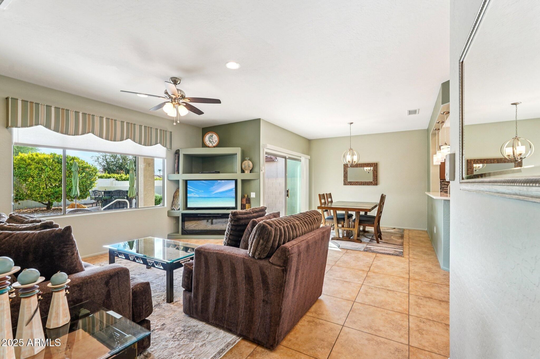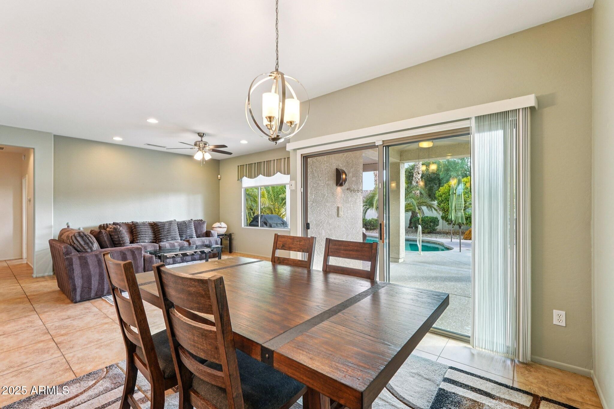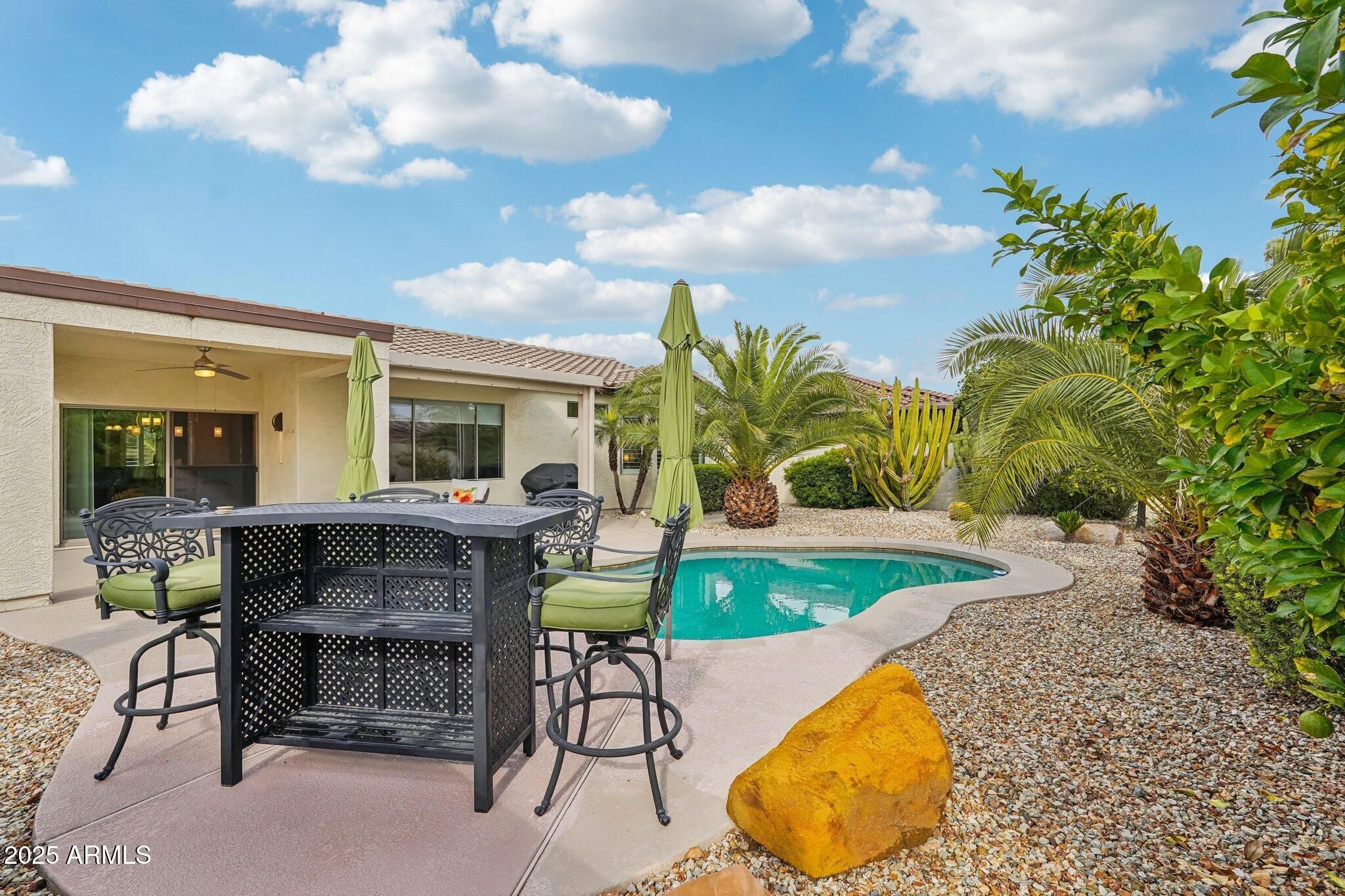 Discover the perfect blend of comfort, style, and resort-style living. Located in a highly desirable master-planned community, this beautifully maintained single-family home offers access to top-rated amenities including walking and biking trails, community parks, golf courses, recreation centers, and popular pickleball and tennis courts. Step into your own private backyard oasis, featuring a sparkling saltwater pool, lush mature landscaping, and fruit-bearing citrus trees—an ideal space for relaxing or entertaining year-round. Inside, the home features a bright and inviting breakfast nook, perfect for morning coffee or casual dining. The spacious primary suite provides a peaceful retreat with its elegant bay window, generous layout, and dual-sink ensuite Enjoy the best of Arizona outdoor living on the extended covered patio, designed for comfort whether you're hosting guests or unwinding after a day of exploring the community's many amenities. With convenient access to shopping, dining, fitness centers, community events, and beautifully maintained neighborhood spaces, this home combines tranquil living with everyday convenience.