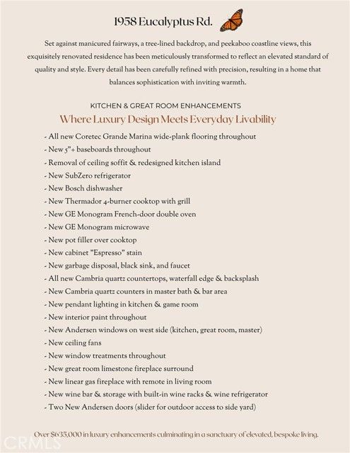 A Rare Blend of Curated Design and Luxury Central Coast Living. 1958 Eucalyptus Road is set along a manicured fairway, framed by a lush tree-lined view and coastline glimmers. This residence has been transformed with over $600,000 in upgrades and features, into an elevated California lifestyle. The experience begins the moment you arrive, unique landscaping design, exterior lighting and featuring a modern garage door. Enter to all new flooring, custom paint, lighting, ceiling fans and a chef’s kitchen that is nothing short of a culinary masterpiece—Cambria quartz waterfall island and counters, new appliances and a pot filler create a chef's kitchen designed not just for meals, but for moments. New west-facing, Andersen doors & windows draw the eye outward to a magical array of golf course vistas, swaying trees, sunsets and the distant ocean. Fireplaces flicker throughout the residence—each one a vignette of comfort and atmosphere. In the great room, the family room, the primary suite, and even outdoors, these glowing focal points create the range from, a perfect morning coffee to evening gatherings. The primary suite offers a spa inspired bathroom retreat with radiant heated floors, soaking tub, walk-in shower, bidet, and walk-in closet. Outside, the property transforms into a private resort—an escape designed for relaxation, celebration, and year-round enjoyment. A custom waterfall feature, oversized fire pit, infrared heater, Alfresco BBQ kitchen, spa and lush, low maintenance landscaping create an environment that feels both luxurious and effortless. Additional features include solar panels, Tesla backup battery, tankless water heater, LifeSource whole house filtration, EV charger, Solar Tubes, new laundry appliances, custom bar with built-in wine refrigerator and racks, 5" baseboards, entertainment center wall, French doors at office and much more. Elevated design and luxury living in one of the area’s most desirable resort communities.