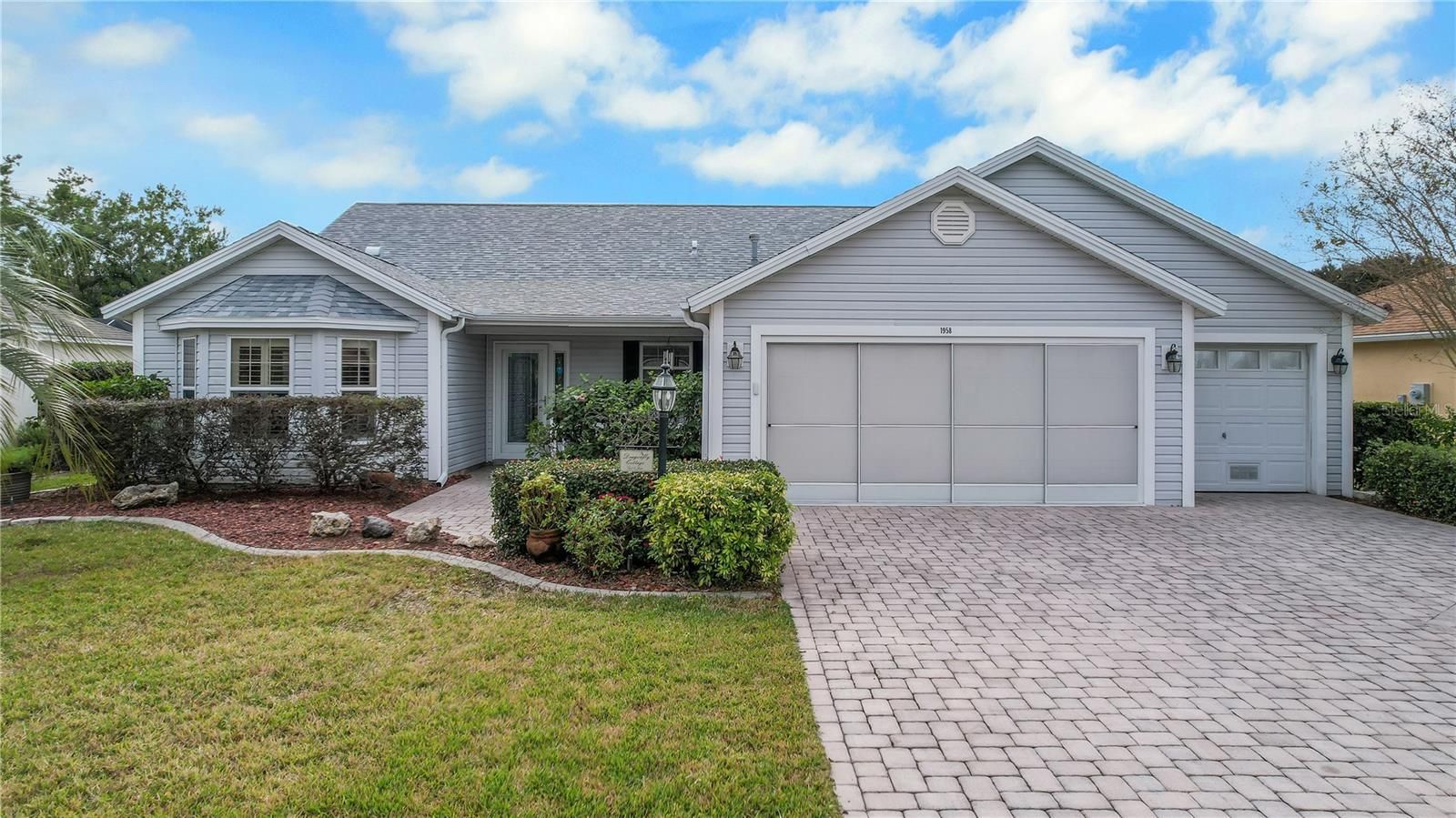 Welcome home to this beautifully appointed 3-bedroom, 2-bath residence with a 2-car PLUS golf cart garage, located in the desirable & sought after Village of Winifred. Step through the inviting covered front porch and immediately appreciate the crown molding, soaring 10 foot ceilings, plantation shutters, and sleek tile and laminate flooring throughout the main living areas. This home offers lots of natural light in addition to the solar tubes located throughout the home. Another bonus is the utlities are both GAS and Electric. The spacious kitchen is a chef’s delight, featuring abundant white cabinetry with soft-close drawers, stainless steel appliances, granite countertops with matching backsplash, a breakfast bar, and a cozy breakfast nook—perfect for everyday living and entertaining. Retreat to the generous primary suite, which boasts two walk-in closets and a luxurious en-suite bath with granite countertops, dual vessel sinks, upgraded faucets, a vanity area, and a walk-in shower. Additional bedrooms offer comfort and flexibility for guests or a home office. The large indoor laundry room includes white cabinetry for extra storage, a utility sink, and an upgraded washer and dryer. Enjoy Florida living year-round in the fully enclosed lanai, with custom made Coolaroo shades, complete with two sets of sliding doors—one which leads to a patio covered by a full-length pergola. The tall privacy hedges create a peaceful, private outdoor retreat. The expansive driveway is beautifully paved and the garage is thoughtfully designed with extensive storage solutions. NEW ROOF (Jan 2026) and new tankless water heater (2023) provide peace of mind and lower insurance costs. Another bonus is the mailboxes, Laurel Recreation Center and pool are 1/2 mile from this Designer Cypress model home. Ideally located just minutes to 466 with easy access to restaurants, shopping, medical facilities, grocery stores and Paws Animal Hospital for your pets, this exceptional home truly has it all.