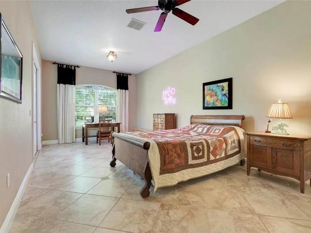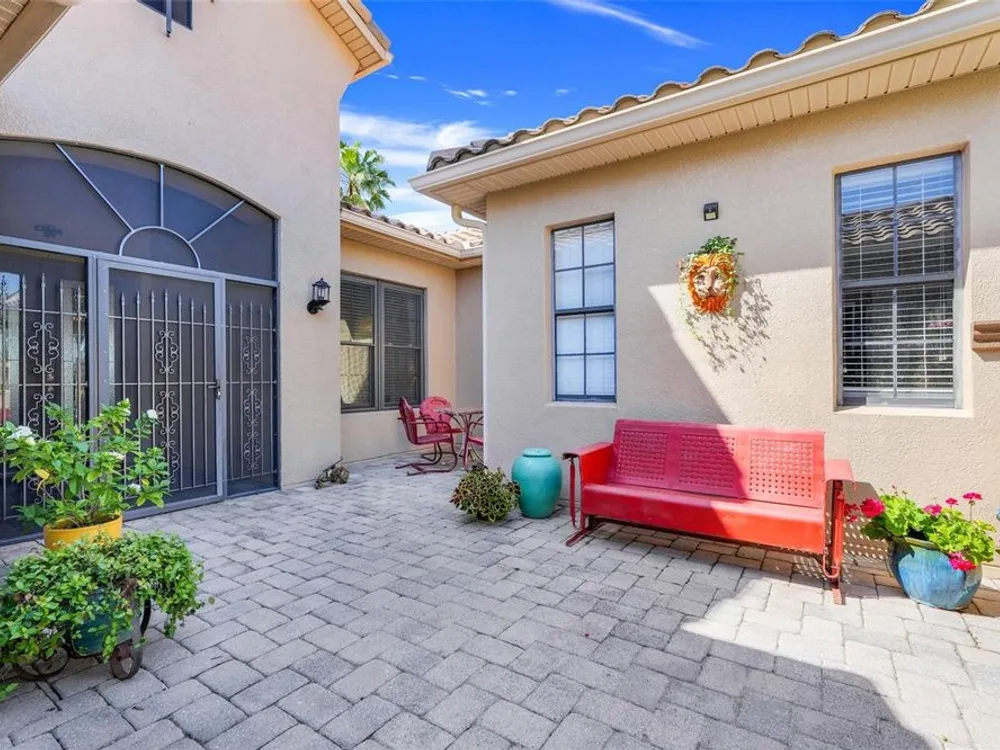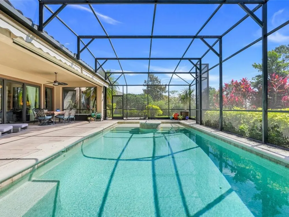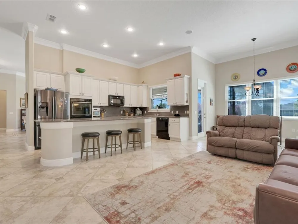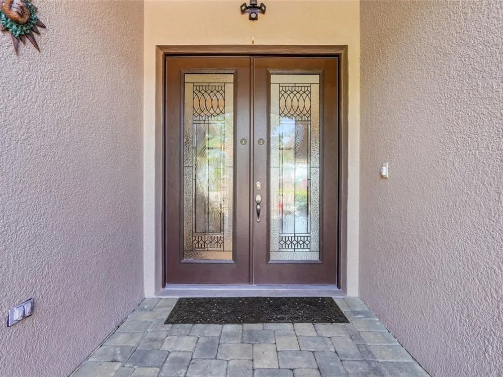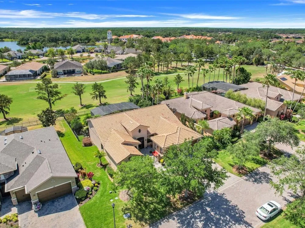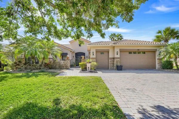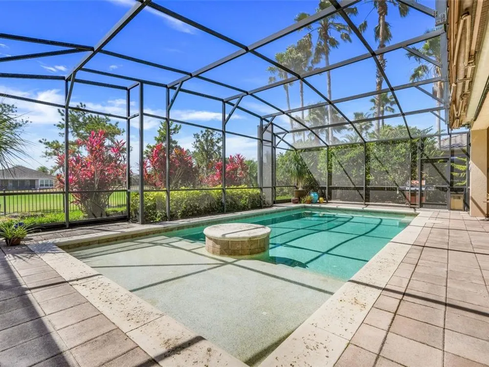 Fabulous Biscayne model with a Large Pool on the Golf Course in the Lago Vista subdivision of Solivita. The Home is located within walking distance to the Village Town Center on one of the few brick paver streets in Solivita. As the former model home for AV Homes, this home has so many upgrades including a Front Entryway that includes a Courtyard with automatic plant watering system, French Leaded Glass Insert Front Doors and a 7.5’ x 6’ Custom Tile Medallion in the Foyer. Upon entering the Home, there is 20 Inch Tile laid on the diagonal in all main living areas, Owner’s Suite & 2nd Bedroom Suite with Bamboo in the Third Bedroom. Eight Foot doors, Rounded corners and & 5 ¼ inch Baseboards throughout. Upgraded Crown Molding in the Living, Dining & Family Rooms, Kitchen, Hallways & Foyer. Gourmet Kitchen features a Double Oven, Cooktop, 42 Inch Upper Cabinets with Crown Molding and Under Mount lights, Pull-out Drawers in the lower Cabinets, Corian Countertop and Backsplash, a Large Island, Recessed Lights and a Pantry with Custom pull out Drawers. The Breakfast Room adjoins the kitchen. The purchase includes all Kitchen Aid appliances. The Family Room has Plantation Shutters, a single Door leading to the Lanai with built-in Blinds. There is a built-in Entertainment Center with Surround Sound. The Owner's Suite has a Bay Window, Tray Ceiling, Large Walk in Closet with custom built-in shelves. The Owner's Bathroom has Dual Vanities and Large Walk in Shower. The second bedroom has a Sitting Area with French Doors that open to the Front Courtyard, so it has its own Private Entrance. It also has its own Ensuite Bathroom with raised Vanity and Tub/Shower. The Third Bedroom is being used as an Office with a Murphy Bed; its bathroom has a Pocket Door leading to the 3rd Full Bathroom. The Center Piece of this home is the Large Screened Enclosed Solar Heated Pool with Walk out Entry and in Pool Beverage Table. The Pool also has automatic pop-up cleaners to make pool maintenance care-free. Enjoy the Peaceful and Private Covered Lanai that facing East, Overlooking the First Hole of the Stonegate Cypress Golf Course. The entire Lanai Screen Enclosure was new in 2013, including Brick Pavers with plenty of space to relax under the covered portion of the Lanai. The Lanai has a Remote- Controlled Sunesta Motorized Retractable Awning and a Remote-Controlled Solar Shade. There are Pavered Open Patios on either side of the lanai & pool for BBQ and Sun-Bathing. The Back Yard is Fenced with a Astro Turf Dog Track along the back fence line. The Laundry Room includes a Wash Basin, Built-in Cabinets and Ironing Board. 2 Car Garage plus Golf Cart Addition includes Overhead Storage Racks & a Built-in workbench and the floor is painted with Epoxy and Confetti Chips. HVAC with a healthy climate filter was new in 2017. Front doors and slider leading to the lanai and all windows were new in 2013. This is the Top-of-the-Line Luxury Home in Solivita and its Ready to be yours! Call the listing agent for a private tour!