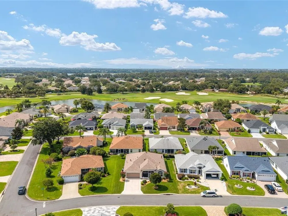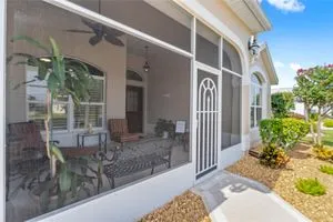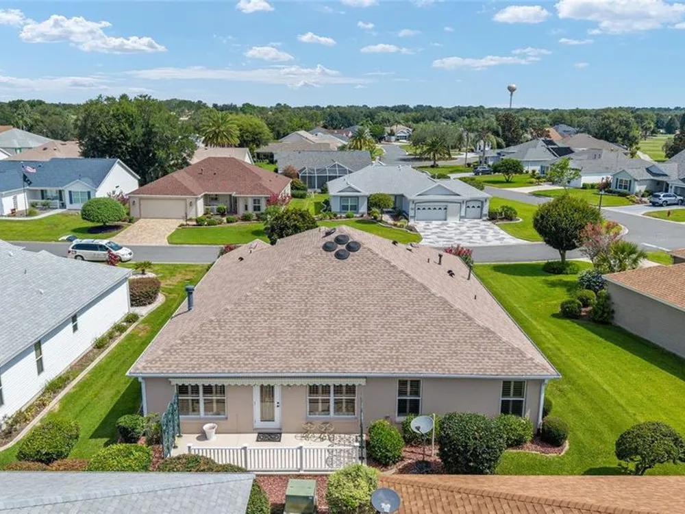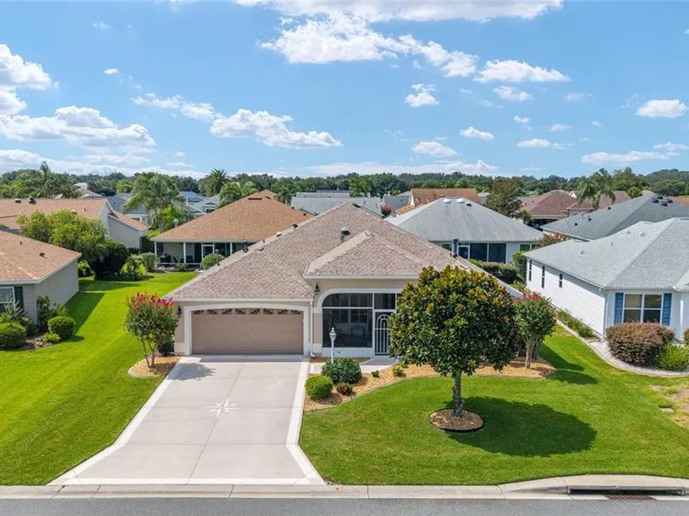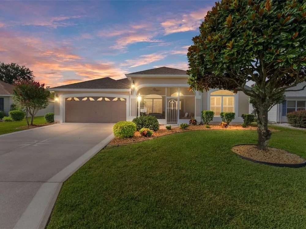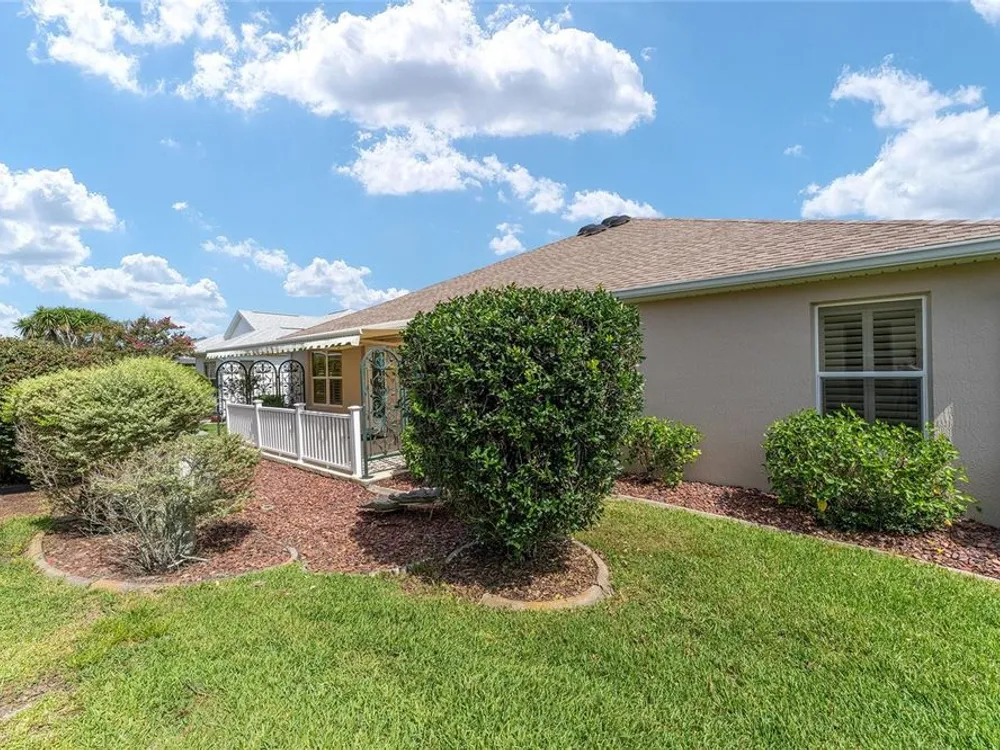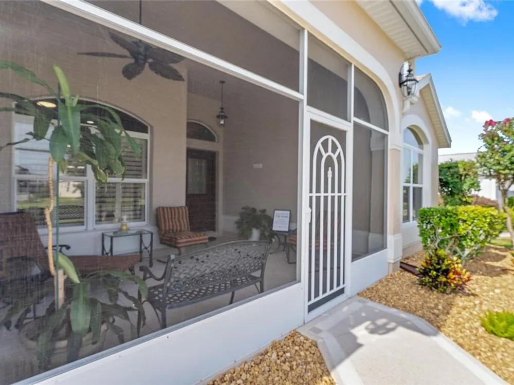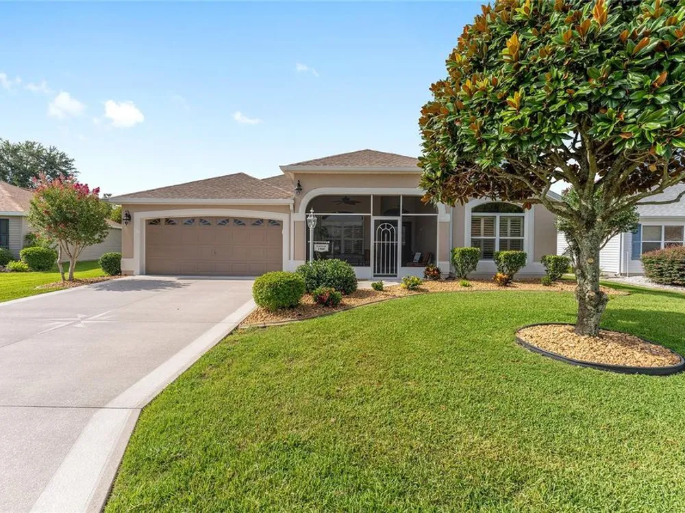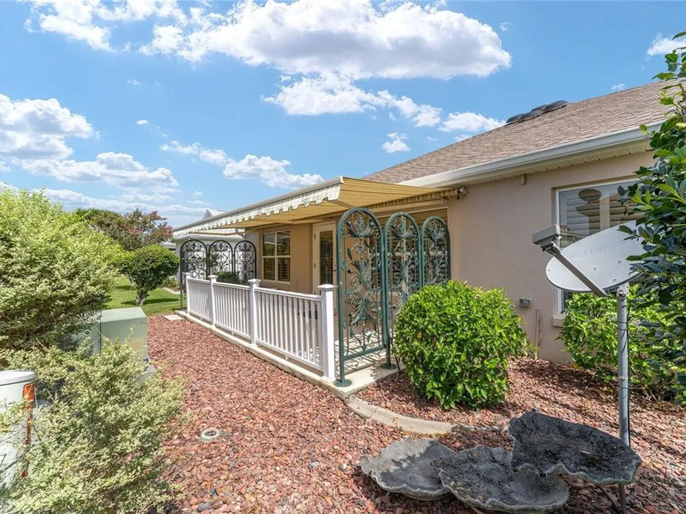 NO BOND - 1 YEAR American Home Shield Warranty offered – Close to Publix, COSTCO, Walmart, Restaurants & Banks. You've been looking for a Designer Model (Expanded GARDENIA) with Premiere upgrades and is priced to sell! Look no further as this desirable model in a very convenient location near LAKE SUMTER LANDING and Hwy 466! Updated and replaced - ROOF 2021, HVAC & WATER HEATER - 2019, and NO BOND!! Freshly painted inside and all tile has been professionally cleaned - MOVE IN READY and NO CARPET! Residents love the Gardenia for its open floor plan and split bedrooms for added privacy, and what makes this home UNIQUE is the LARGE FRONT SCREENED PORCH! The curb appeal is so inviting with a recently painted exterior/trim, painted driveway, and manicured trees and shrubs. You initially enter a large Screened Front Porch (165 sf) which allows for relaxation amidst the beautiful landscaping or entertaining guests. As you enter the home you'll notice the vaulted ceilings, round wall corners and other luxury upgrades. There is extensive CROWN MOULDING and PLANTATION SHUTTERS throughout this home. There are TWO SOLAR TUBES, updated Ceiling Fans and Fixtures and NO POPCORN CEILINGS. The kitchen boasts beautiful CORIAN countertops, updated Cabinets, and newer STAINLESS STEEL appliances. There is updated kitchen lighting and ROLL OUTS in the kitchen cabinets for easy access. As a bonus, there are GAS HOOK-UPs for the stove and the clothes dryer! The Dining/Living Room area is extra large for entertaining and comfortable seating with a gas fireplace for ambiance. The Primary Bedroom has beautiful laminate flooring, a vaulted ceiling, two walk-in closets and a large en-suite with an updated walk-in shower and DOUBLE SINKS. The guest room has an Oversized Closet and is very inviting and bright. The 3rd bedroom or den (no closet) is set up as an oice and has a Murphy Bed for additional guests. There is a convenient bathroom between these two bedrooms as well as a linen closet. Wait until you see the Florida Room, which provides extra space for whatever uses you may have as it seamlessly transitions from the living area and adds extra square footage. There is a door which leads out to the back porch with Privacy and an ELECTRIC AWNING for shade and comfort. The Laundry Room with a newer Washer (2024) & Dryer (2015) and laundry sink leads to the Garage which has storage, attic stairs with decking and a whole house water filtration/softening system. The Irrigation control in the garage has been recently replaced with WiFi accessibility and there is a whole house surge protector. This home has been so well maintained and has been recently updated and refreshed! It is on a quiet street and in a very socially active neighborhood that you will just love! This location is a mile from Lake Sumter Landing for entertainment and dining as well as two pools, golf, and nearby Pimlico recreation center. Look no further if you are searching for a move-in Ready Home in a Great Location in The Villages, Fl. I can't wait for you to see it!!