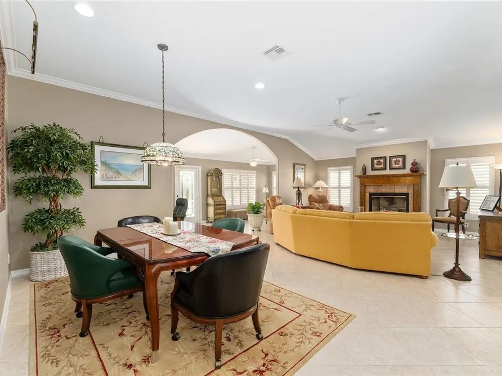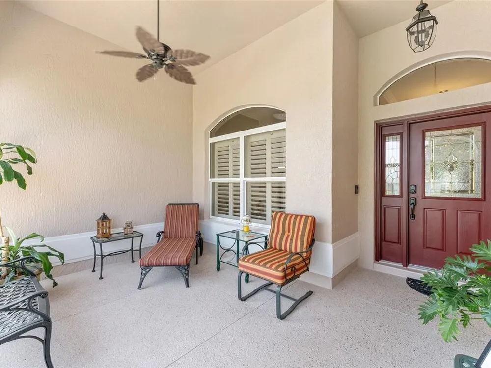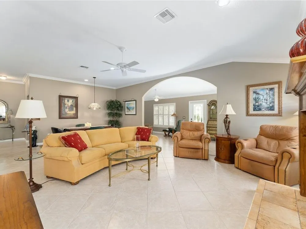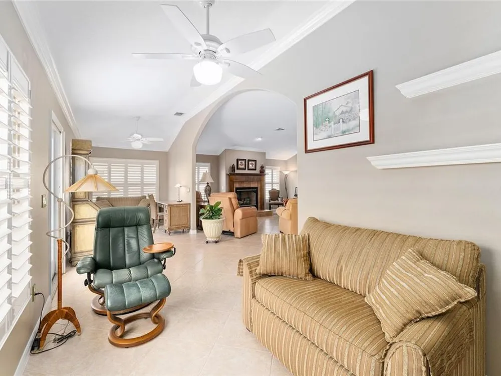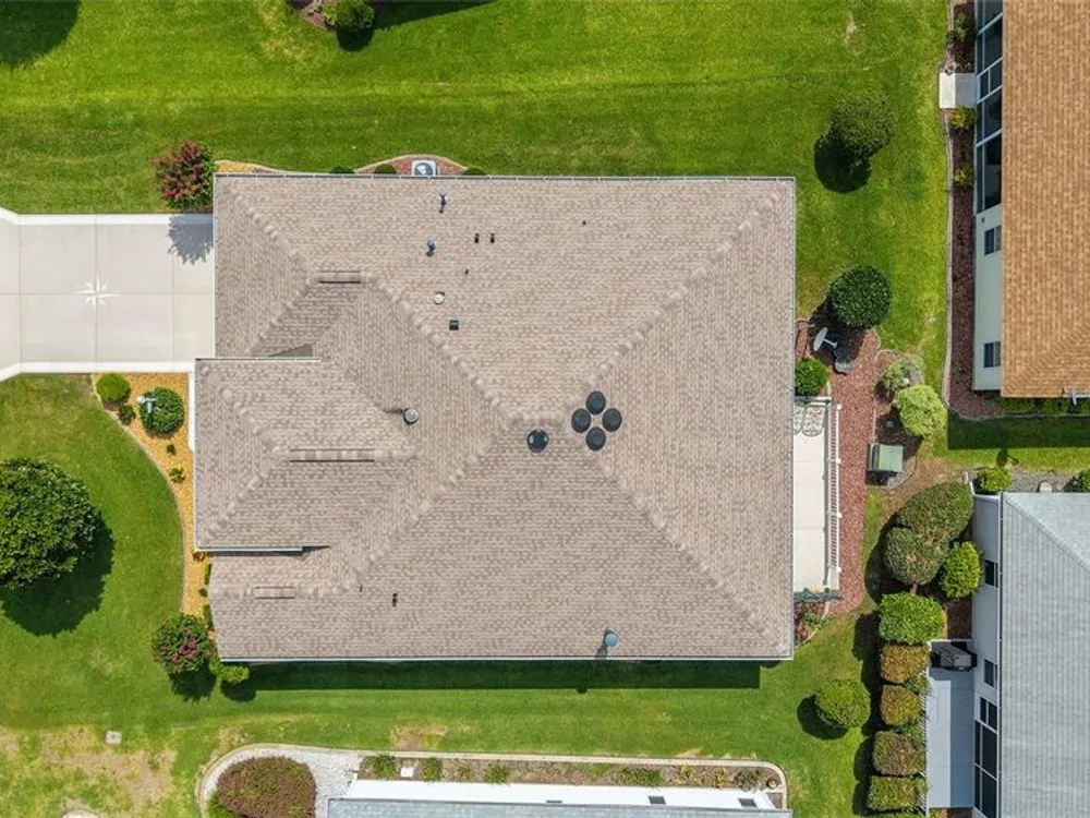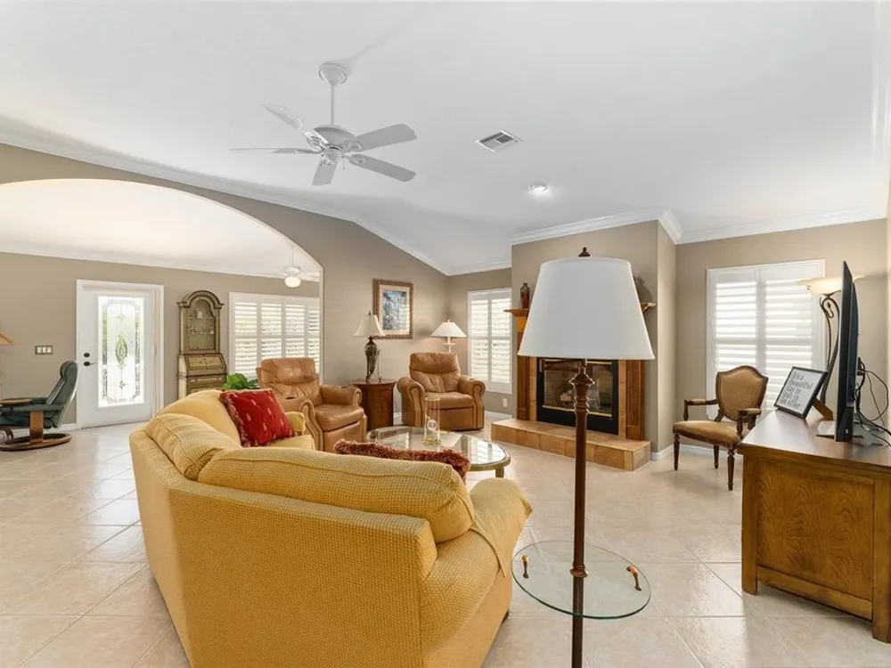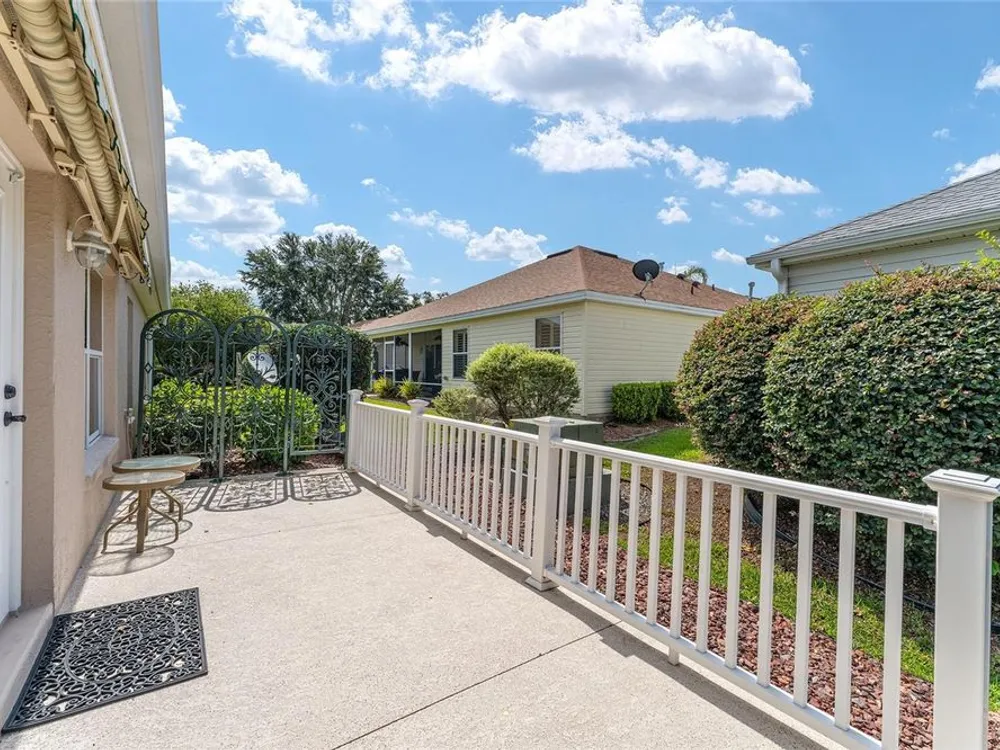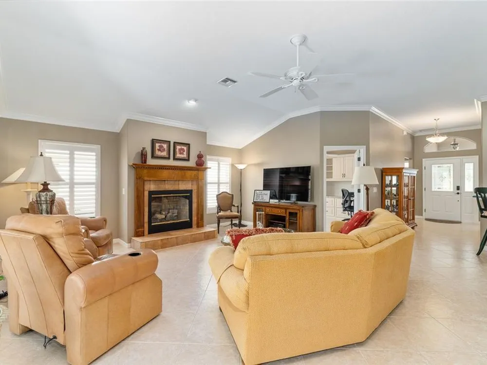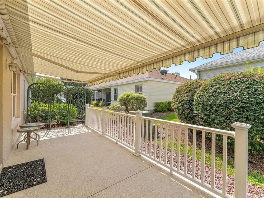 NO BOND - 1 YEAR American Home Shield Warranty offered – Close to Publix, COSTCO, Walmart, Restaurants & Banks. You've been looking for a Designer Model (Expanded GARDENIA) with Premiere upgrades and is priced to sell! Look no further as this desirable model in a very convenient location near LAKE SUMTER LANDING and Hwy 466! Updated and replaced - ROOF 2021, HVAC & WATER HEATER - 2019, and NO BOND!! Freshly painted inside and all tile has been professionally cleaned - MOVE IN READY and NO CARPET! Residents love the Gardenia for its open floor plan and split bedrooms for added privacy, and what makes this home UNIQUE is the LARGE FRONT SCREENED PORCH! The curb appeal is so inviting with a recently painted exterior/trim, painted driveway, and manicured trees and shrubs. You initially enter a large Screened Front Porch (165 sf) which allows for relaxation amidst the beautiful landscaping or entertaining guests. As you enter the home you'll notice the vaulted ceilings, round wall corners and other luxury upgrades. There is extensive CROWN MOULDING and PLANTATION SHUTTERS throughout this home. There are TWO SOLAR TUBES, updated Ceiling Fans and Fixtures and NO POPCORN CEILINGS. The kitchen boasts beautiful CORIAN countertops, updated Cabinets, and newer STAINLESS STEEL appliances. There is updated kitchen lighting and ROLL OUTS in the kitchen cabinets for easy access. As a bonus, there are GAS HOOK-UPs for the stove and the clothes dryer! The Dining/Living Room area is extra large for entertaining and comfortable seating with a gas fireplace for ambiance. The Primary Bedroom has beautiful laminate flooring, a vaulted ceiling, two walk-in closets and a large en-suite with an updated walk-in shower and DOUBLE SINKS. The guest room has an Oversized Closet and is very inviting and bright. The 3rd bedroom or den (no closet) is set up as an oice and has a Murphy Bed for additional guests. There is a convenient bathroom between these two bedrooms as well as a linen closet. Wait until you see the Florida Room, which provides extra space for whatever uses you may have as it seamlessly transitions from the living area and adds extra square footage. There is a door which leads out to the back porch with Privacy and an ELECTRIC AWNING for shade and comfort. The Laundry Room with a newer Washer (2024) & Dryer (2015) and laundry sink leads to the Garage which has storage, attic stairs with decking and a whole house water filtration/softening system. The Irrigation control in the garage has been recently replaced with WiFi accessibility and there is a whole house surge protector. This home has been so well maintained and has been recently updated and refreshed! It is on a quiet street and in a very socially active neighborhood that you will just love! This location is a mile from Lake Sumter Landing for entertainment and dining as well as two pools, golf, and nearby Pimlico recreation center. Look no further if you are searching for a move-in Ready Home in a Great Location in The Villages, Fl. I can't wait for you to see it!!