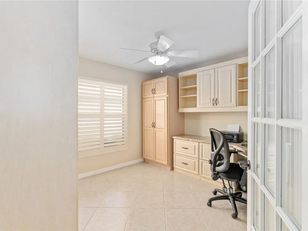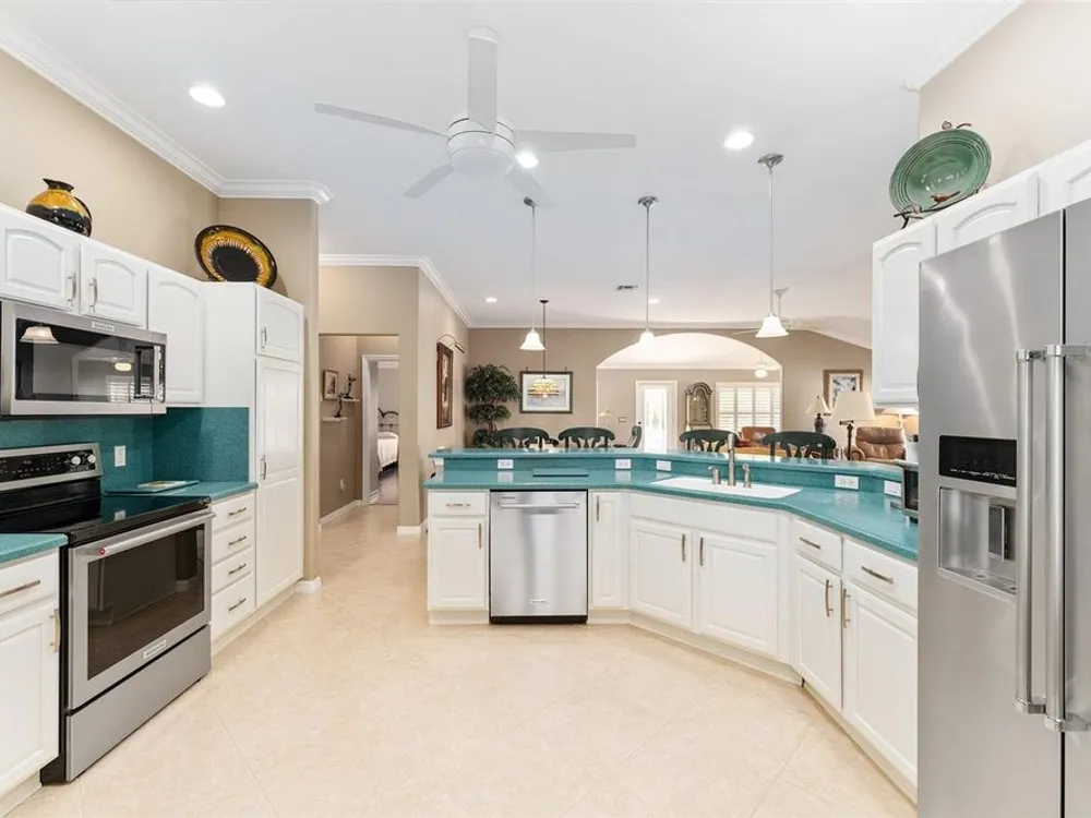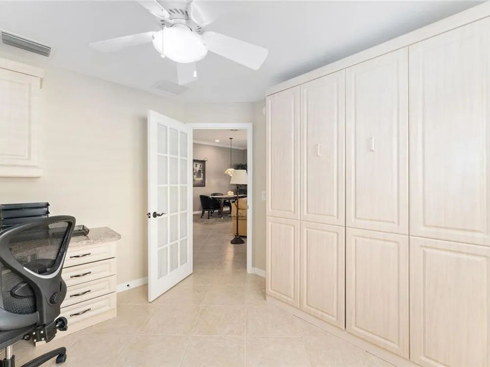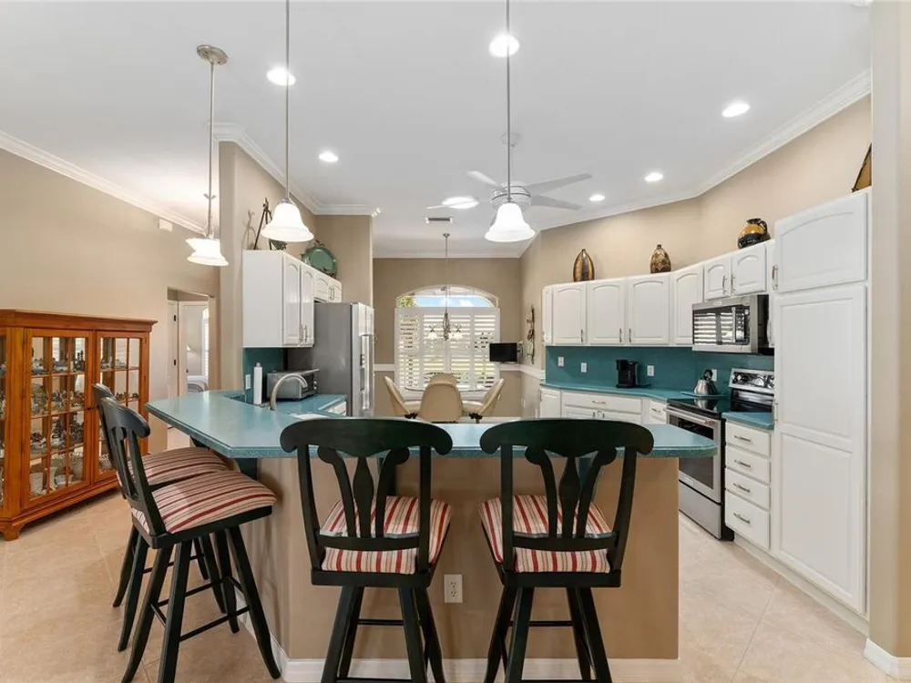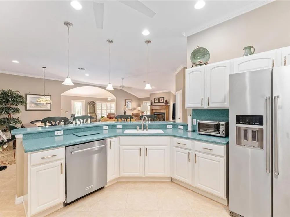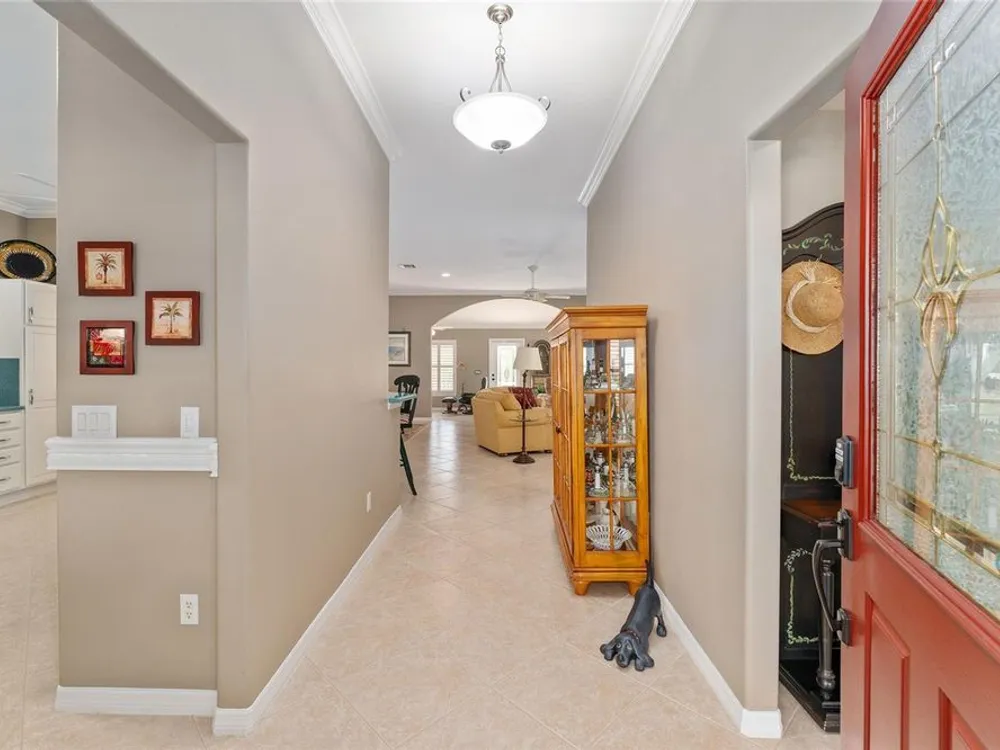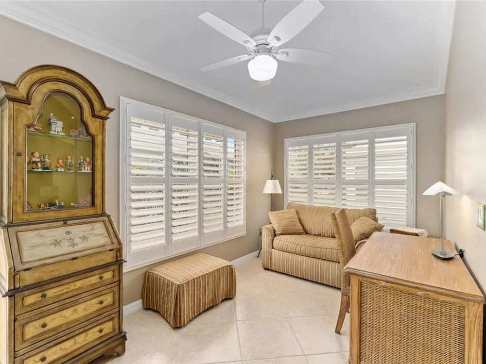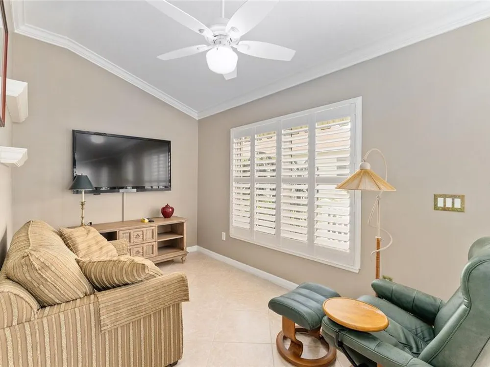 NO BOND - 1 YEAR American Home Shield Warranty offered – Close to Publix, COSTCO, Walmart, Restaurants & Banks. You've been looking for a Designer Model (Expanded GARDENIA) with Premiere upgrades and is priced to sell! Look no further as this desirable model in a very convenient location near LAKE SUMTER LANDING and Hwy 466! Updated and replaced - ROOF 2021, HVAC & WATER HEATER - 2019, and NO BOND!! Freshly painted inside and all tile has been professionally cleaned - MOVE IN READY and NO CARPET! Residents love the Gardenia for its open floor plan and split bedrooms for added privacy, and what makes this home UNIQUE is the LARGE FRONT SCREENED PORCH! The curb appeal is so inviting with a recently painted exterior/trim, painted driveway, and manicured trees and shrubs. You initially enter a large Screened Front Porch (165 sf) which allows for relaxation amidst the beautiful landscaping or entertaining guests. As you enter the home you'll notice the vaulted ceilings, round wall corners and other luxury upgrades. There is extensive CROWN MOULDING and PLANTATION SHUTTERS throughout this home. There are TWO SOLAR TUBES, updated Ceiling Fans and Fixtures and NO POPCORN CEILINGS. The kitchen boasts beautiful CORIAN countertops, updated Cabinets, and newer STAINLESS STEEL appliances. There is updated kitchen lighting and ROLL OUTS in the kitchen cabinets for easy access. As a bonus, there are GAS HOOK-UPs for the stove and the clothes dryer! The Dining/Living Room area is extra large for entertaining and comfortable seating with a gas fireplace for ambiance. The Primary Bedroom has beautiful laminate flooring, a vaulted ceiling, two walk-in closets and a large en-suite with an updated walk-in shower and DOUBLE SINKS. The guest room has an Oversized Closet and is very inviting and bright. The 3rd bedroom or den (no closet) is set up as an oice and has a Murphy Bed for additional guests. There is a convenient bathroom between these two bedrooms as well as a linen closet. Wait until you see the Florida Room, which provides extra space for whatever uses you may have as it seamlessly transitions from the living area and adds extra square footage. There is a door which leads out to the back porch with Privacy and an ELECTRIC AWNING for shade and comfort. The Laundry Room with a newer Washer (2024) & Dryer (2015) and laundry sink leads to the Garage which has storage, attic stairs with decking and a whole house water filtration/softening system. The Irrigation control in the garage has been recently replaced with WiFi accessibility and there is a whole house surge protector. This home has been so well maintained and has been recently updated and refreshed! It is on a quiet street and in a very socially active neighborhood that you will just love! This location is a mile from Lake Sumter Landing for entertainment and dining as well as two pools, golf, and nearby Pimlico recreation center. Look no further if you are searching for a move-in Ready Home in a Great Location in The Villages, Fl. I can't wait for you to see it!!
