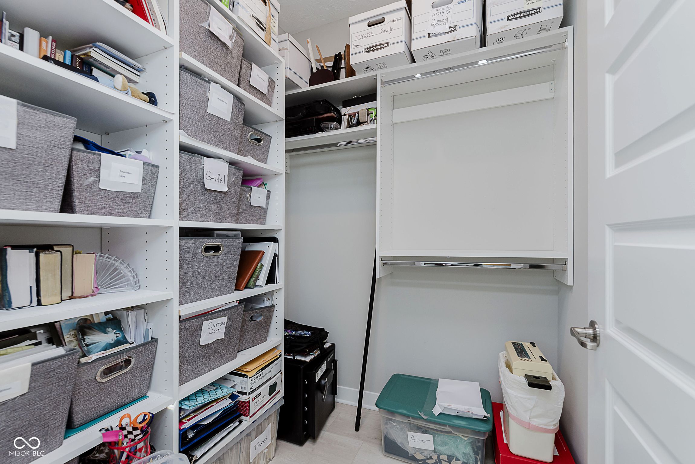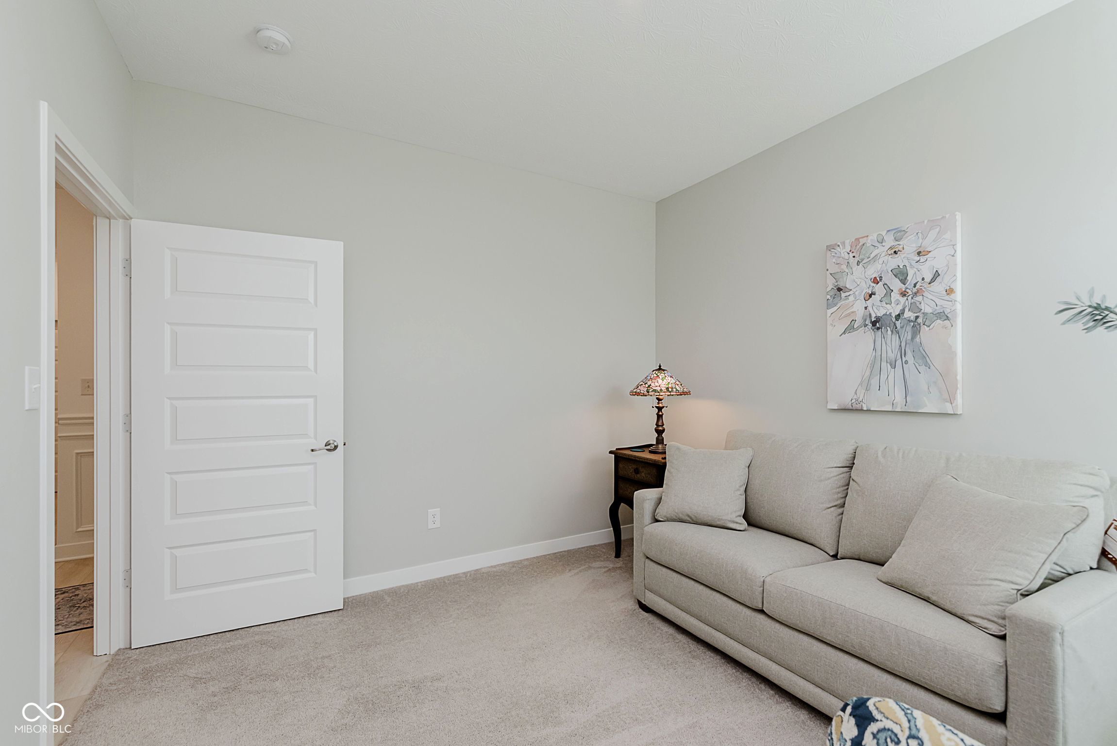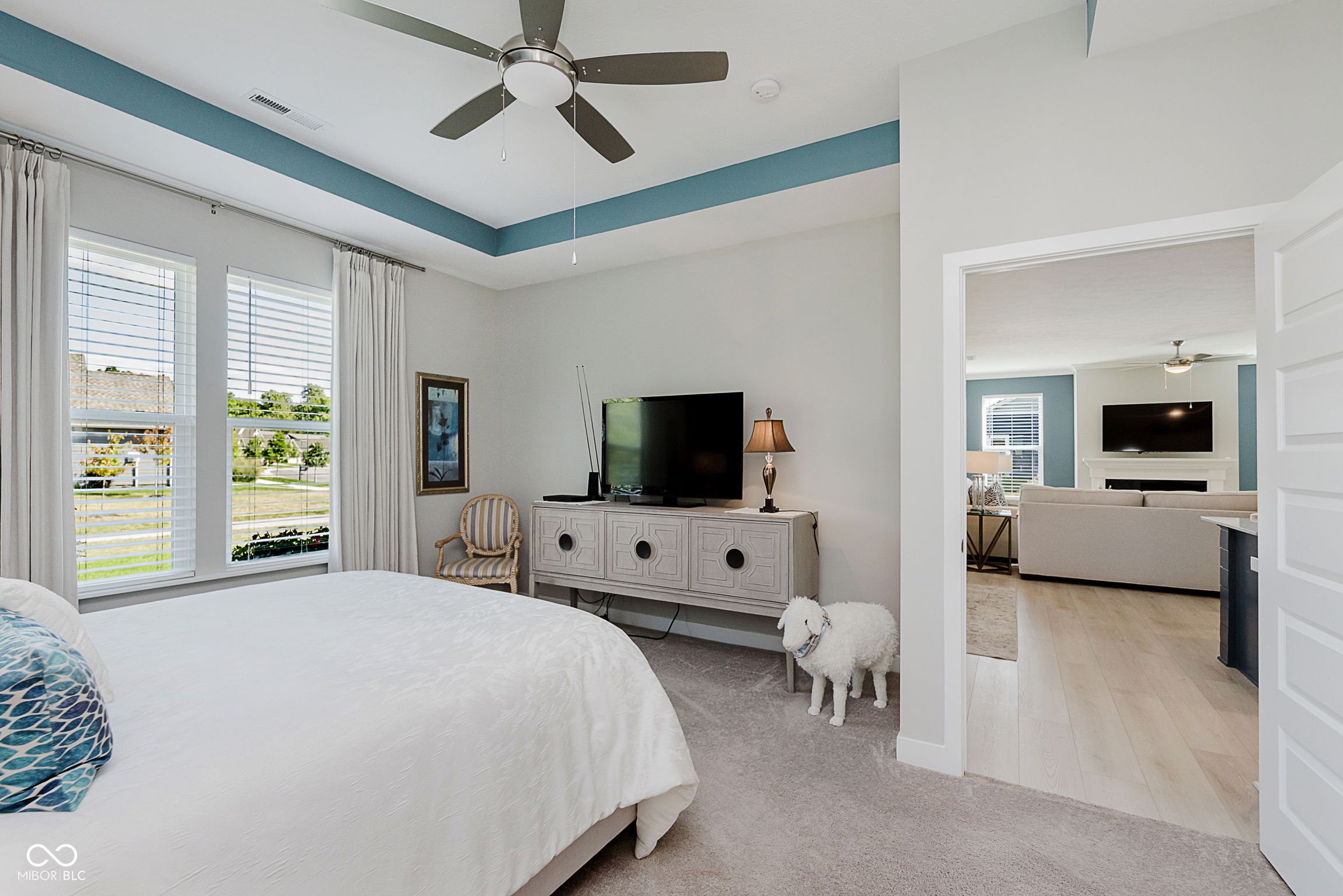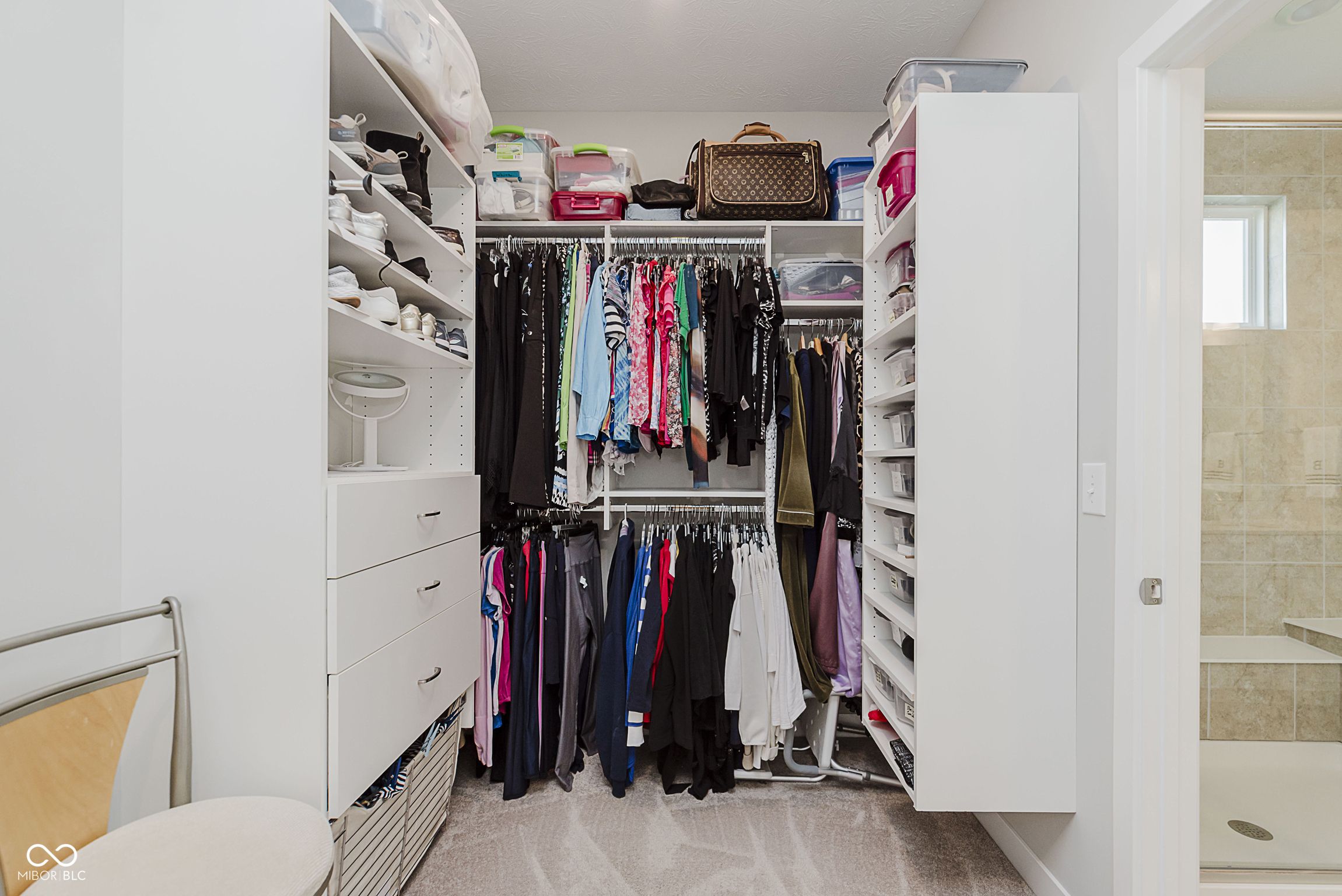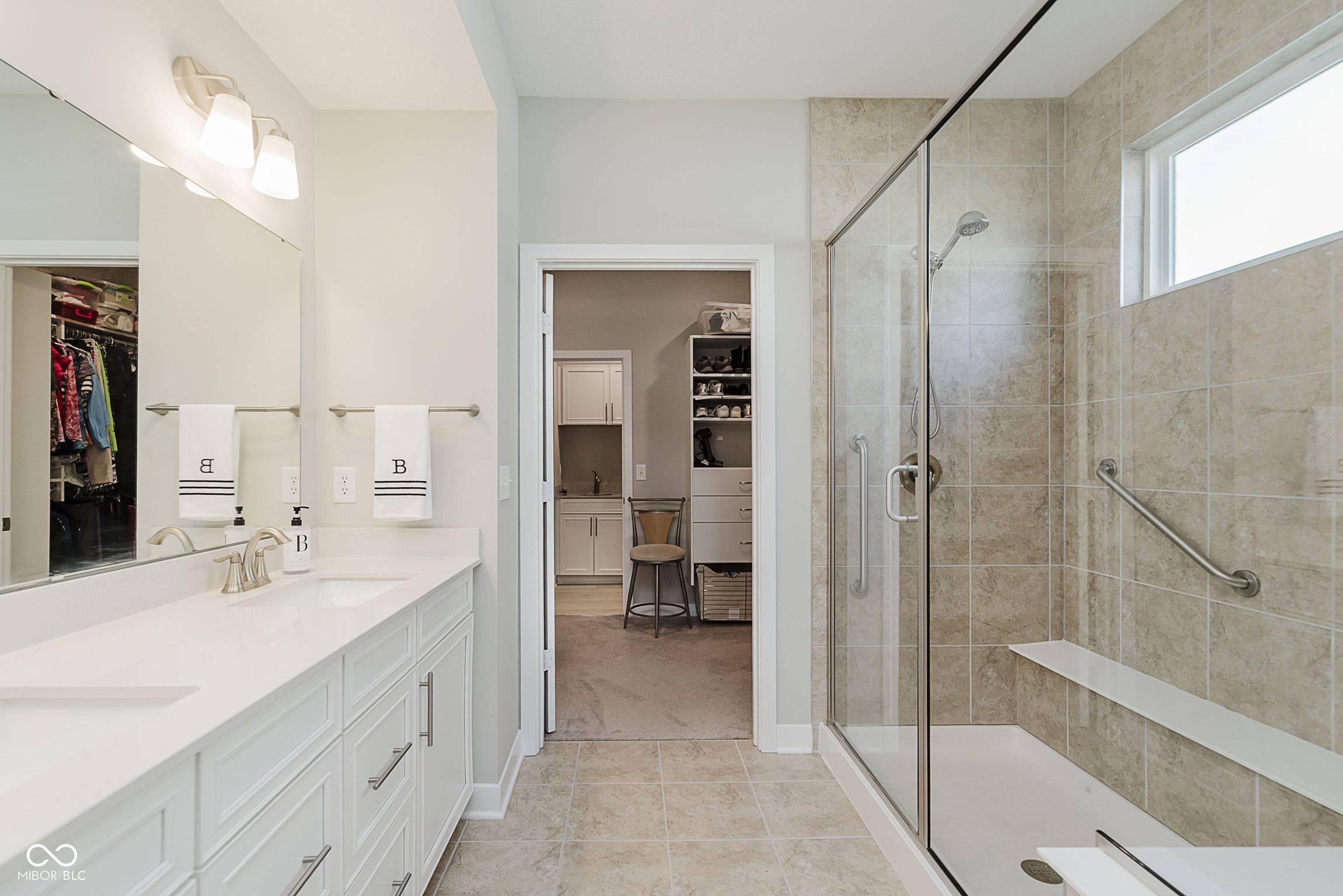 Westfield's 55+ community near Grand Park features two clubhouses, pools, fitness center, pickleball and tennis courts and 3 miles of scenic trails. Full lawn care and snow removal. This immaculate home is the popular Shafer floor plan. Step inside from the inviting covered front porch, to an elegant entry hall designed with wainscoting and tray ceilings. The home features newer luxury LVP flooring, accent walls, and a gas fireplace with black granite hearth. Truly a gourmet chef's kitchen with wall oven/microwave plus separate gas range and wall mount chimney hood. Third bedroom/ flex room with charming barn doors & plantation shutters. Storage galore w/ custom shelving in walk in closets and pantry. Built in bench & hooks for convenience are located just inside entry from the garage. Garage even offers a 4 foot bump out extension. Tranquil Master suite includes tray ceilings, luxurious walk in shower. Adjoining laundry room with washer/dryer included. Enjoy the outdoor living spaces, from screened in porch to extended patio, located by walking paths. Upgraded features include: Tankless water heater, chlorine filter, water softener, Smart home with Schlage smart lock and Ruckus wireless zone flex Wi-Fi access and ring doorbell. Handicap accessible