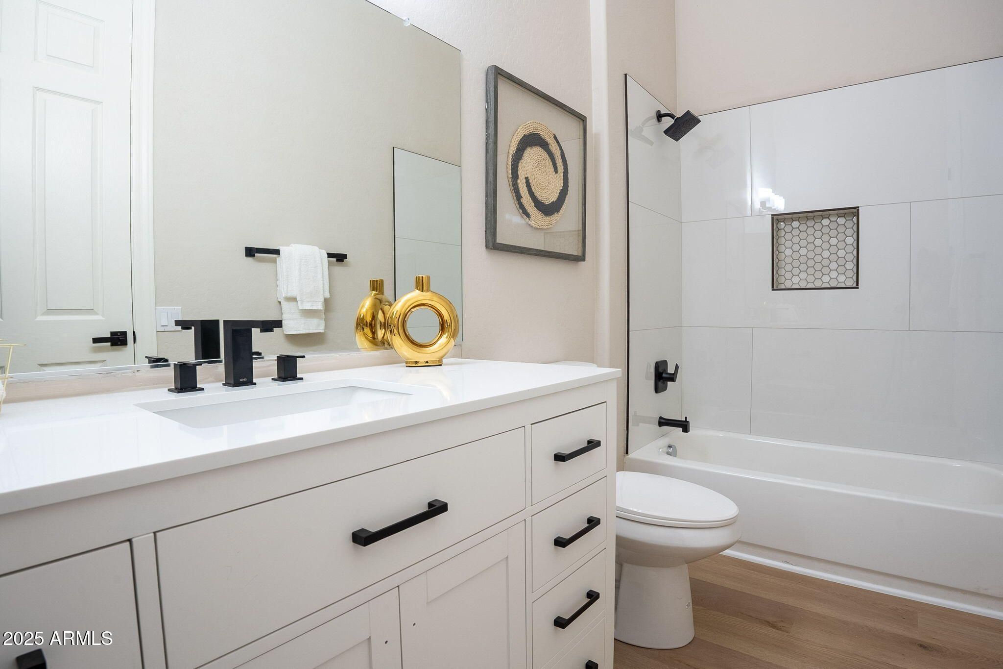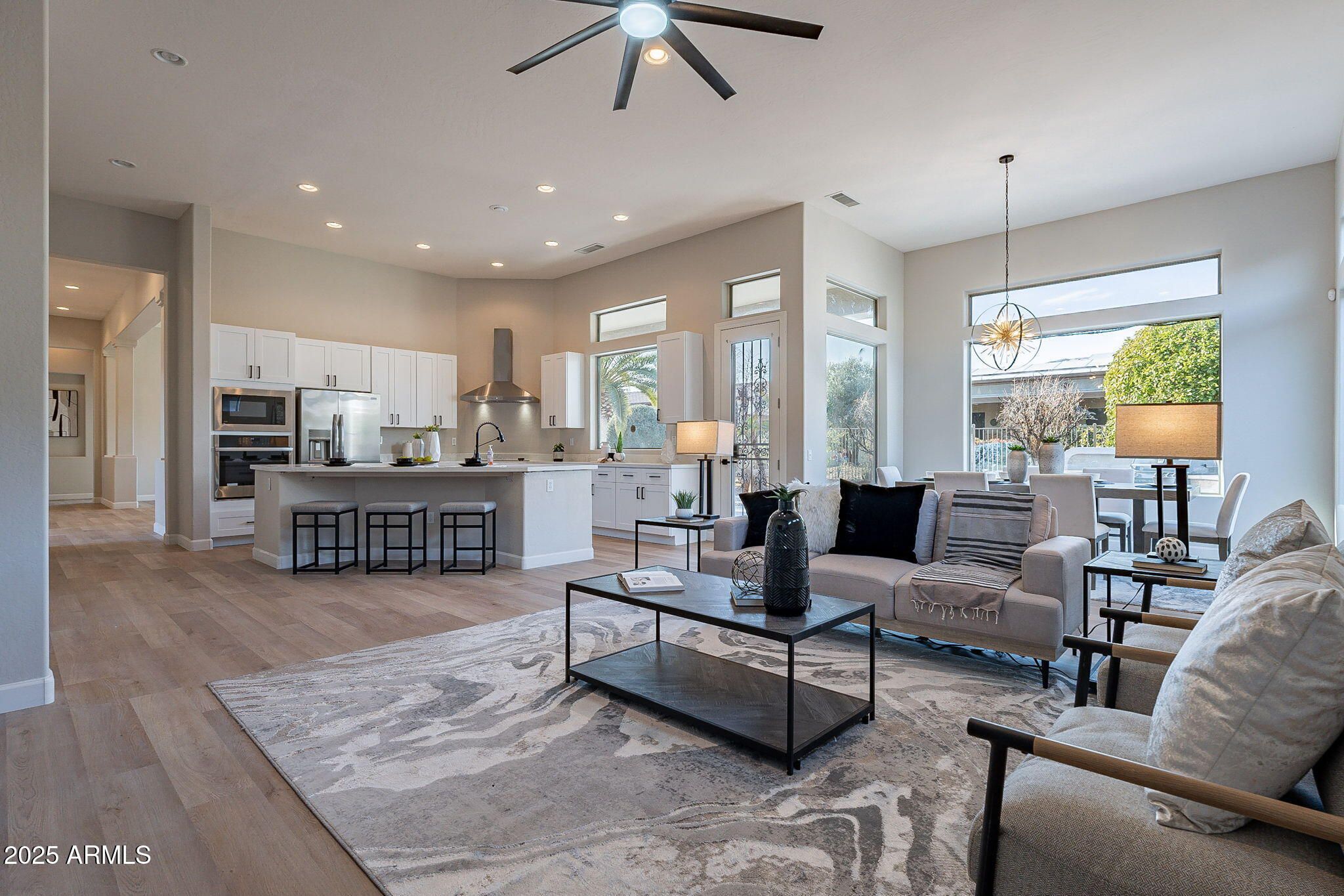 Welcome to this beautifully remodeled Kensington floor plan with an over-height and extended length 3 car garage! Open kitchen family room floor plan. The kitchen is a true showstopper with new crisp white Shaker cabinetry, elegant quartz counter tops, new stainless steel hood and appliances, and a breakfast bar for intimate gatherings. Large casual dining area off kitchen. Exit the family room/kitchen to a generous covered back patio and mature landscape - the perfect spot for morning coffee or evening get-togethers beneath the stars. The luxurious primary suite is a sanctuary you won't want to leave! A large bay window with sitting/reading area looks out to the back yard; two walk in closets, dual vanities, standalone bathtub, and a stunning walk in shower with custom glass enclosure. 'Third bedroom' is currently a large den/office that can easily be converted to a bedroom and seller is willing to do so upon request for the right offer terms. Bathrooms were remodeled with new vanities with quartz counter tops, new sinks, faucets, fixtures, toilets and tile surrounds in the showers. New vanity in the powder room. Multiple closets and linen cabinets for extra storage. Recessed lighting and upgraded light fixtures and ceiling fans throughout. Upgraded LVP plank flooring throughout. No carpet in the home! New exterior paint. 17 window panes have been replaced! Close proximity to the golf course! Enjoy quiet evenings and gorgeous sunsets from the back patio, and the active lifestyle of beautiful Sun City Grand and its unsurpassed community amenities! All facts and figures to be verified by buyer or buyer's representative.