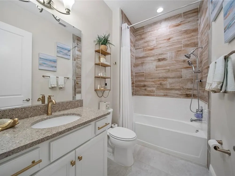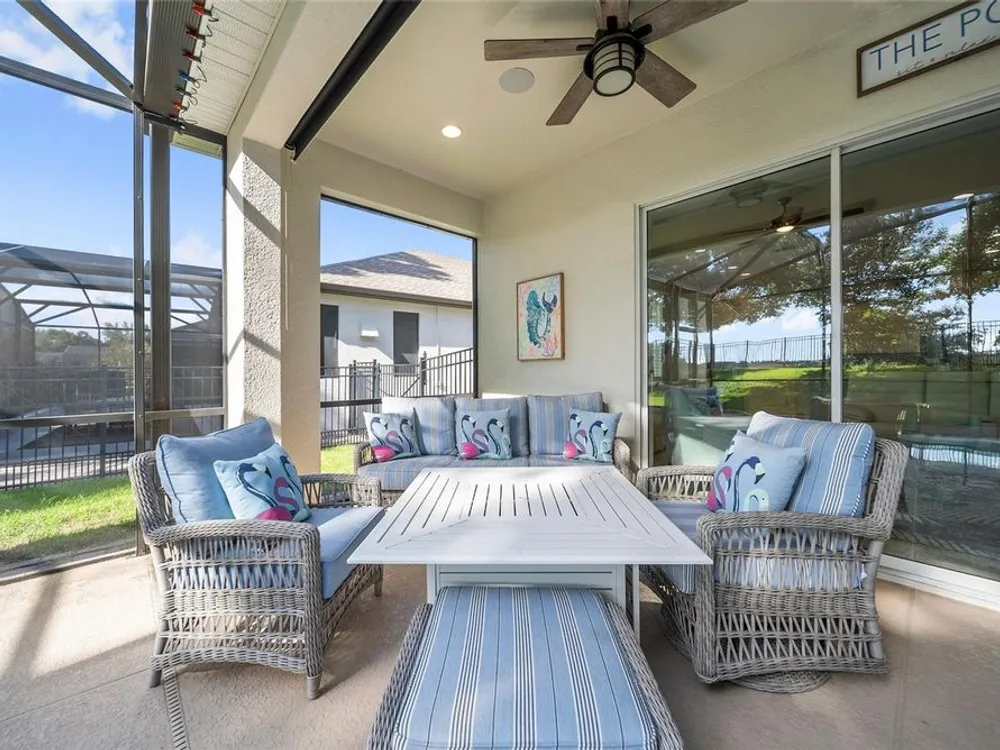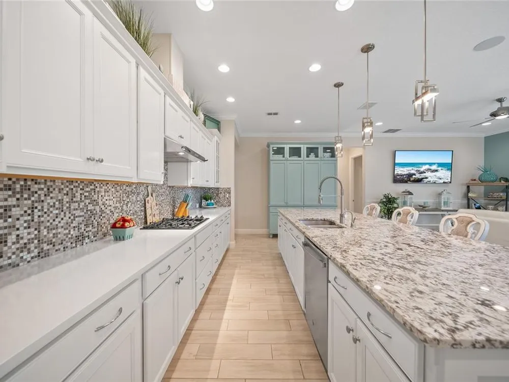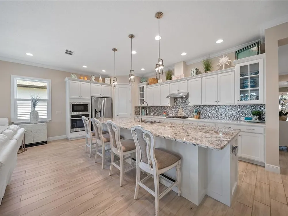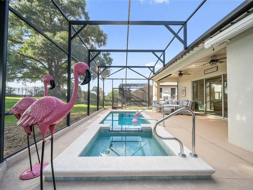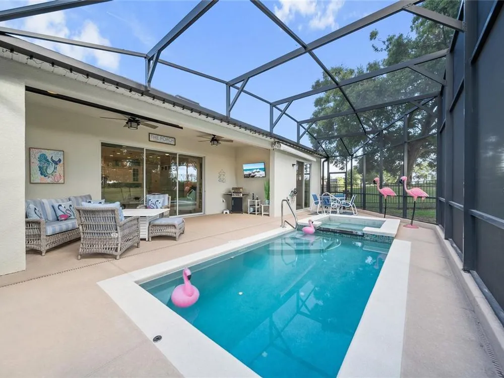Discover this beautiful 4-bedroom, 3-bathroom home, offering the perfect blend of comfort and convenience. This property features an open floor plan with tile flooring throughout, creating a seamless flow between living spaces. The heart of the home showcases a modern kitchen equipped with a gas stove, stainless steel appliances, and a large island with seating. A walk-in pantry provides ample storage, while the open design offers lovely views of the backyard and pool area. The primary suite overlooks the sparkling pool and spa and includes a custom walk-in closet and bathroom with a stand-up shower, quartz countertops, and double sinks. An additional highlight is the separate in-law suite with its own entry door and laundry hookup, perfect for guests or extended family. Outside, the lanai provides space for relaxation while enjoying the pool, spa, and golf course views. Practical features include a garage with epoxy floors, inside laundry with sink, plantation shutters, and a custom built in mudroom entrance. Located just minutes from Walt Disney World, shopping, and dining, this home sits within a guard-gated community offering extensive amenities including pools, pickleball, tennis, fitness center, and social activities. Convenient access to Publix Super Market at Celebration Pointe ensures easy grocery shopping. This property combines modern living with resort-style amenities in an ideal Central Florida location.