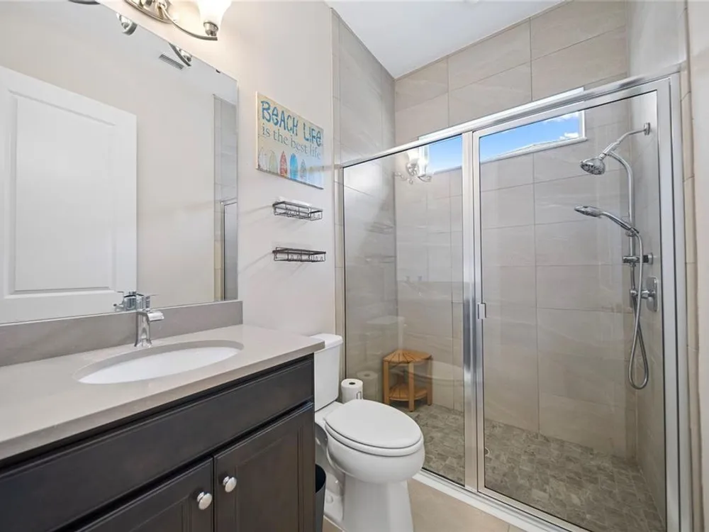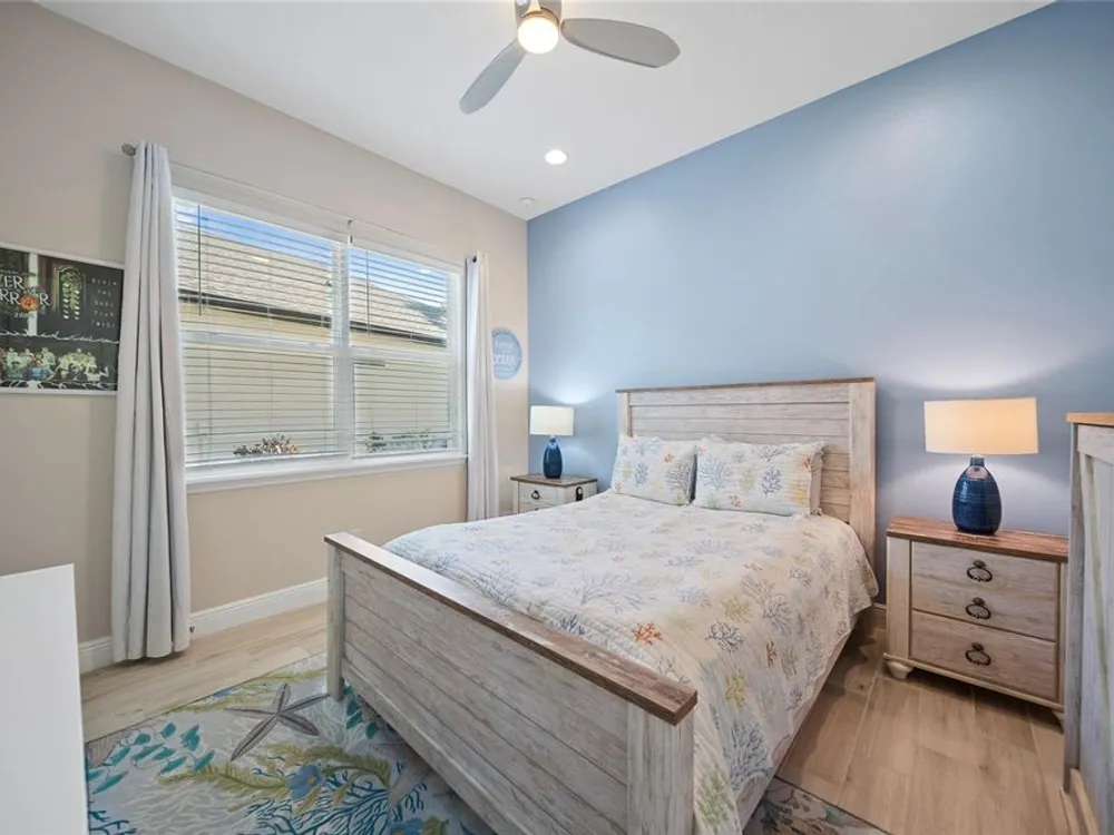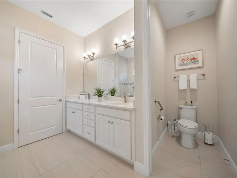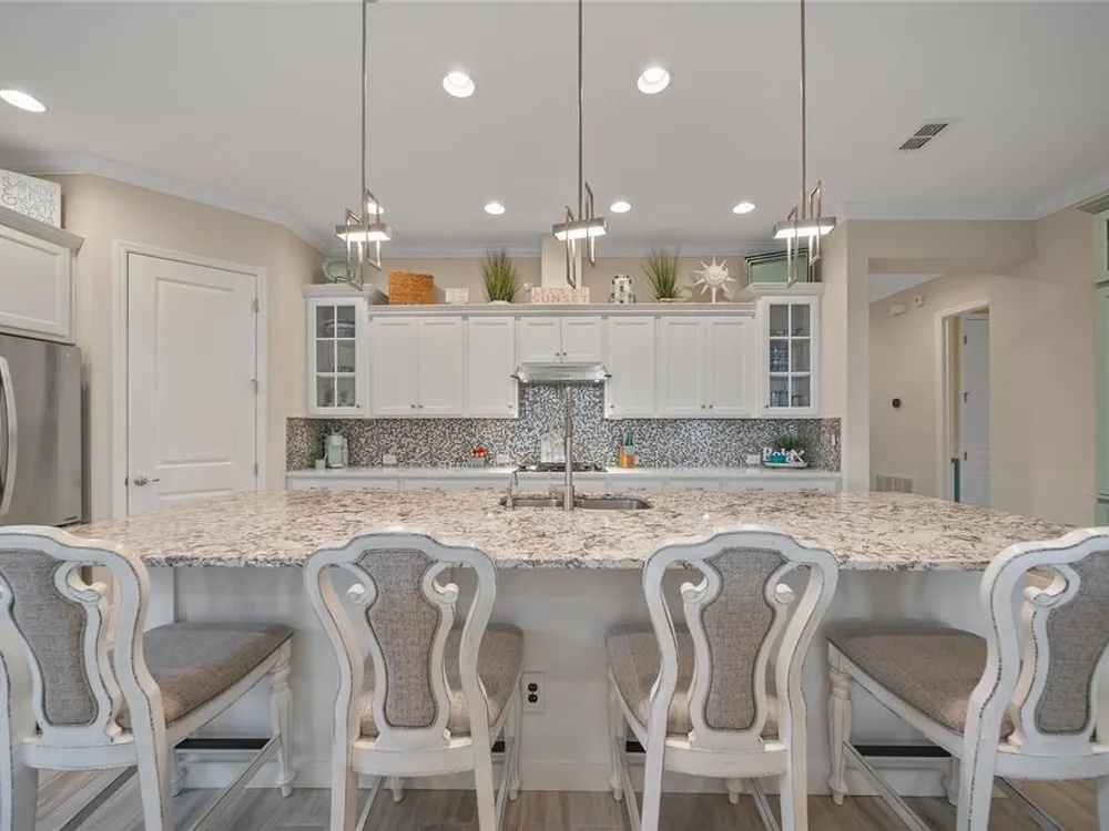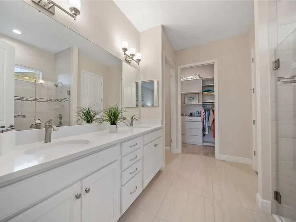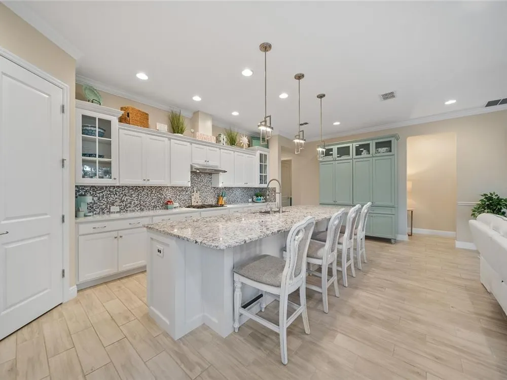 Discover this beautiful 4-bedroom, 3-bathroom home, offering the perfect blend of comfort and convenience. This property features an open floor plan with tile flooring throughout, creating a seamless flow between living spaces. The heart of the home showcases a modern kitchen equipped with a gas stove, stainless steel appliances, and a large island with seating. A walk-in pantry provides ample storage, while the open design offers lovely views of the backyard and pool area. The primary suite overlooks the sparkling pool and spa and includes a custom walk-in closet and bathroom with a stand-up shower, quartz countertops, and double sinks. An additional highlight is the separate in-law suite with its own entry door and laundry hookup, perfect for guests or extended family. Outside, the lanai provides space for relaxation while enjoying the pool, spa, and golf course views. Practical features include a garage with epoxy floors, inside laundry with sink, plantation shutters, and a custom built in mudroom entrance. Located just minutes from Walt Disney World, shopping, and dining, this home sits within a guard-gated community offering extensive amenities including pools, pickleball, tennis, fitness center, and social activities. Convenient access to Publix Super Market at Celebration Pointe ensures easy grocery shopping. This property combines modern living with resort-style amenities in an ideal Central Florida location.