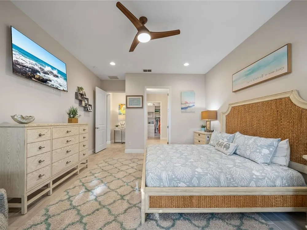 - Ceiling Fan(s), Kitchen/Family Room Combo, Open Floorplan, Main Level Primary, Solid Surface Counters, Solid-Wood Cabinets, Split Bedrooms, Stone Counters, Thermostat, Window Treatments