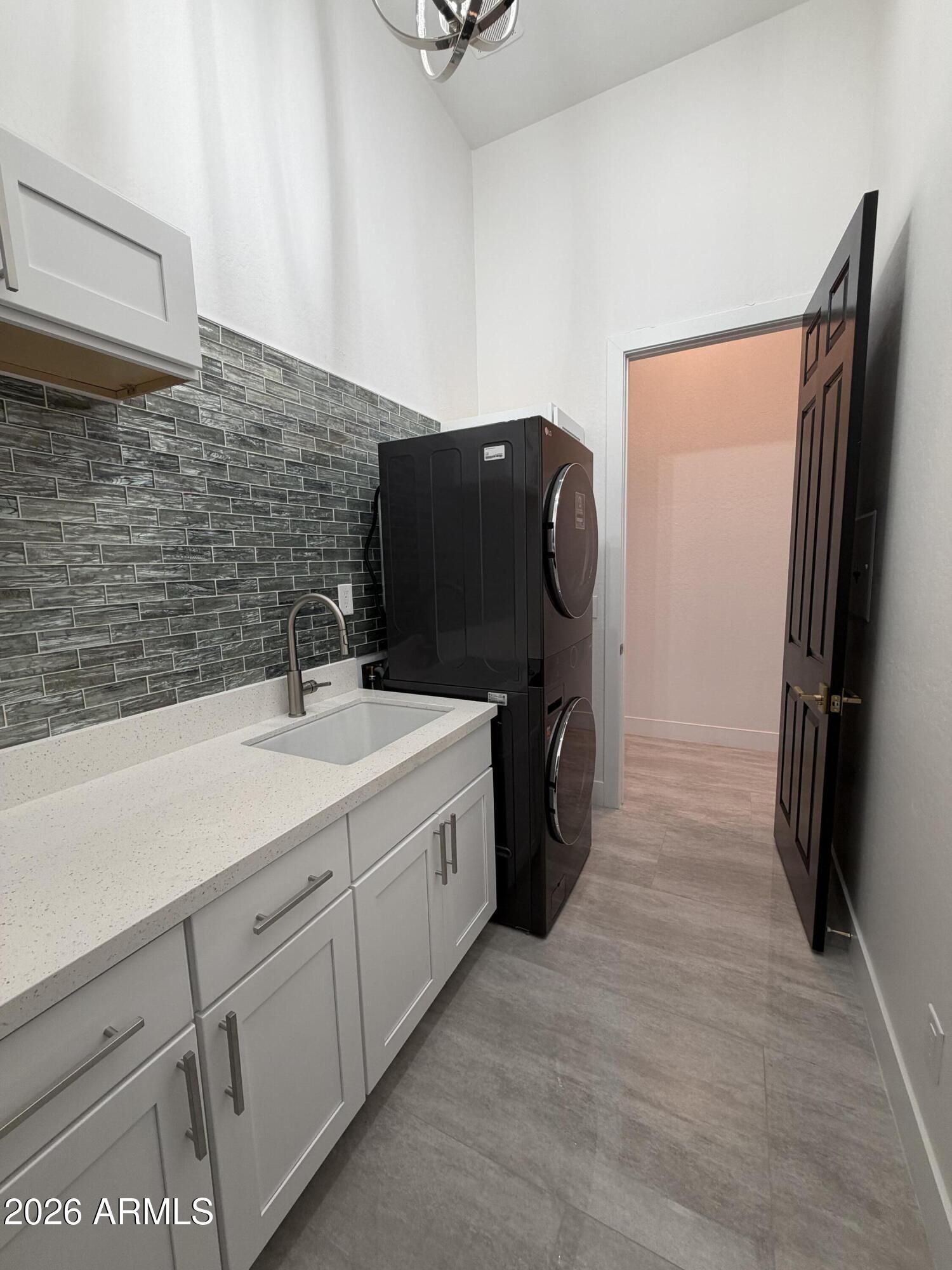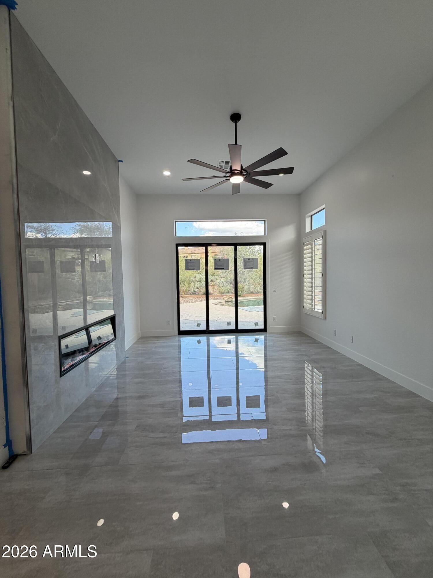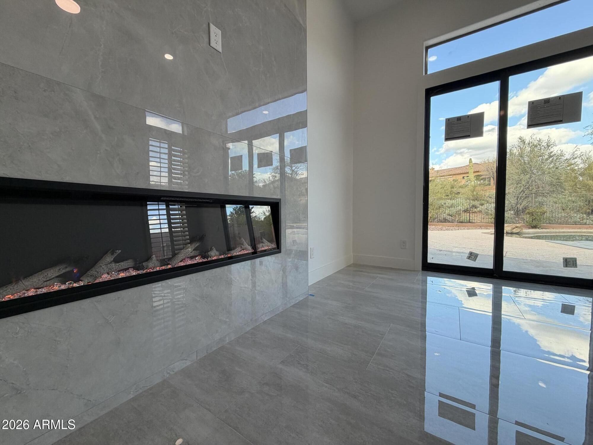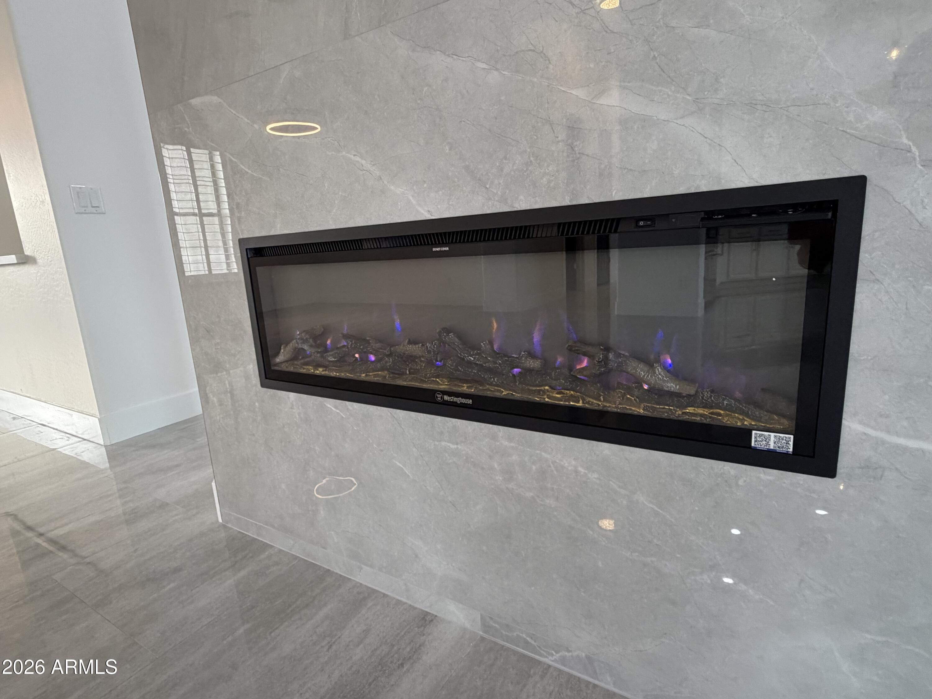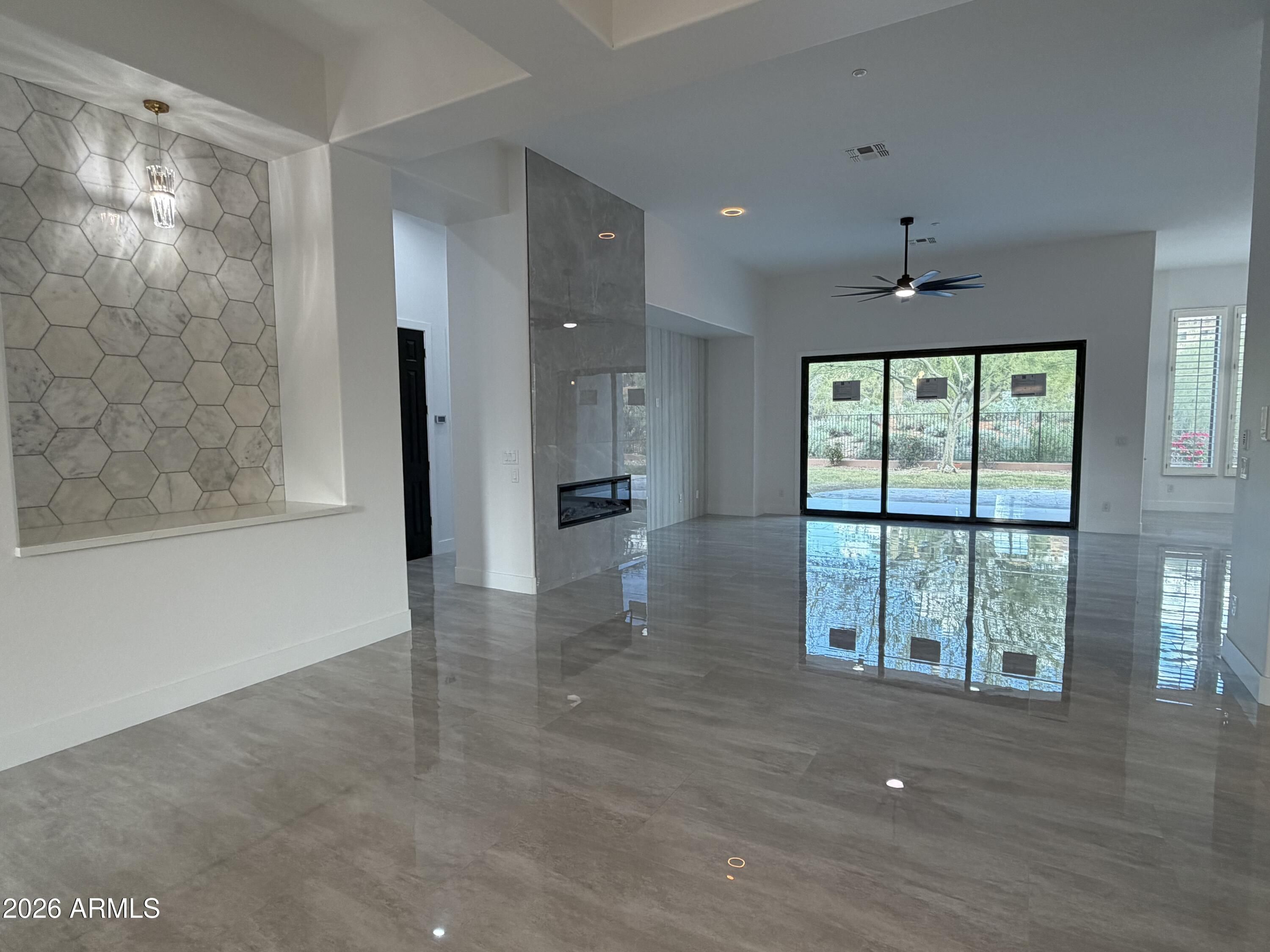Completely renovated with exceptional, high-end upgrades, this stunning home offers a sleek contemporary design with an open, split floor-plan ideal for modern living. Porcelain tile flooring flows throughout, complemented by a striking stone porcelain accent wall and two elegant electric fireplaces. The chef's kitchen features granite countertops, while the spa-inspired bathrooms showcase marble vanities with a clean, modern aesthetic. A well-appointed laundry room includes a sink and stacked washer and dryer. The garage is upgraded with an epoxy floor and powerful LED lighting. Step outside to a refreshing natural view and natural stone tile backyard refreshing pool—perfect for enjoying hot summer days in style.