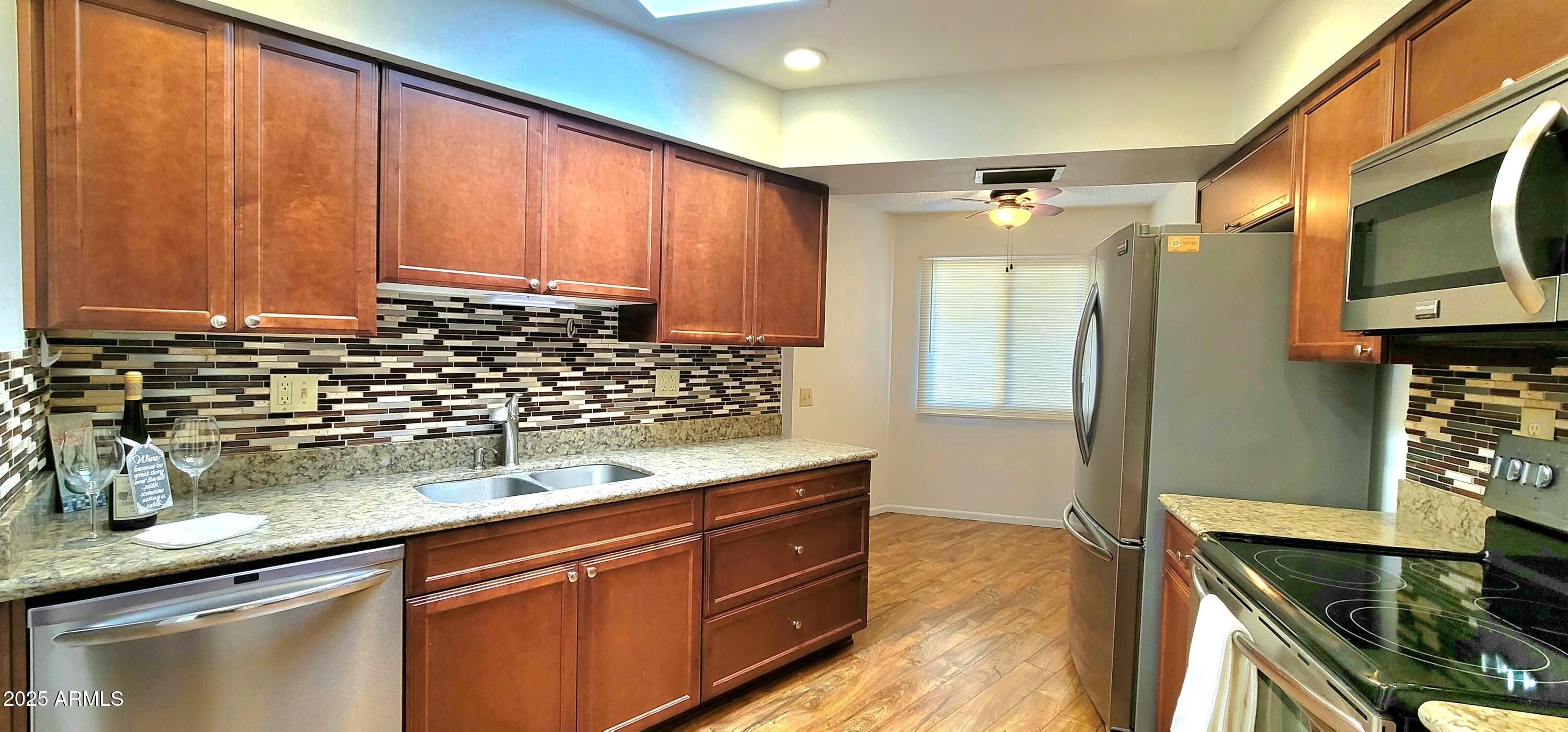 Welcome to this charming 1-bedroom, 1-bath condo in the heart of Sun City West—completely move-in ready! Step inside the spacious eat-in kitchen features granite countertops and stainless steel appliances, perfect for everyday meals or entertaining. The living room offers plenty of space to relax with friends, while the bonus den is ideal for a home office, reading nook, or hobby room. Just a short stroll to Hillcrest Golf Course and close to shopping, dining, and recreation. Whether you're a golf lover, seasonal visitor, or looking to downsize, this condo is the perfect fit. Don't miss the opportunity to make it yours!