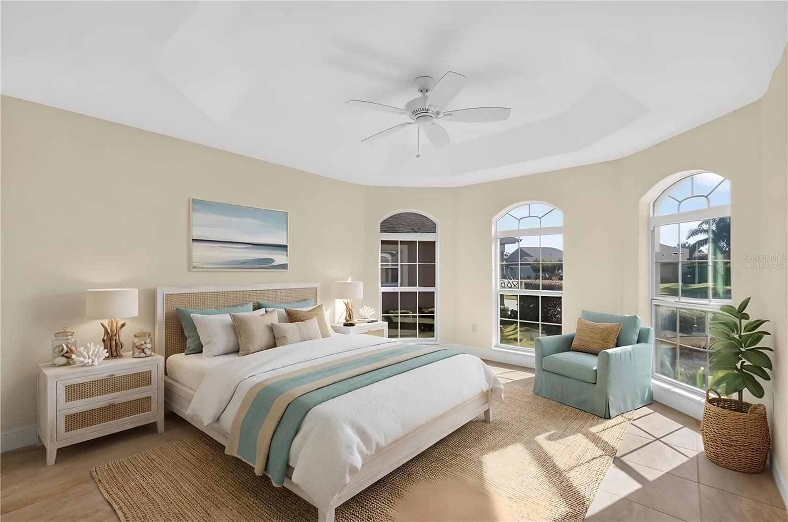 - Ceiling Fan(s), Eat-in Kitchen, High Ceilings, Living/Dining Room, Open Floorplan, Main Level Primary, Split Bedrooms, Stone Counters, Thermostat, Tray Ceiling(s), Vaulted Ceiling(s), Walk-In Closet(s)