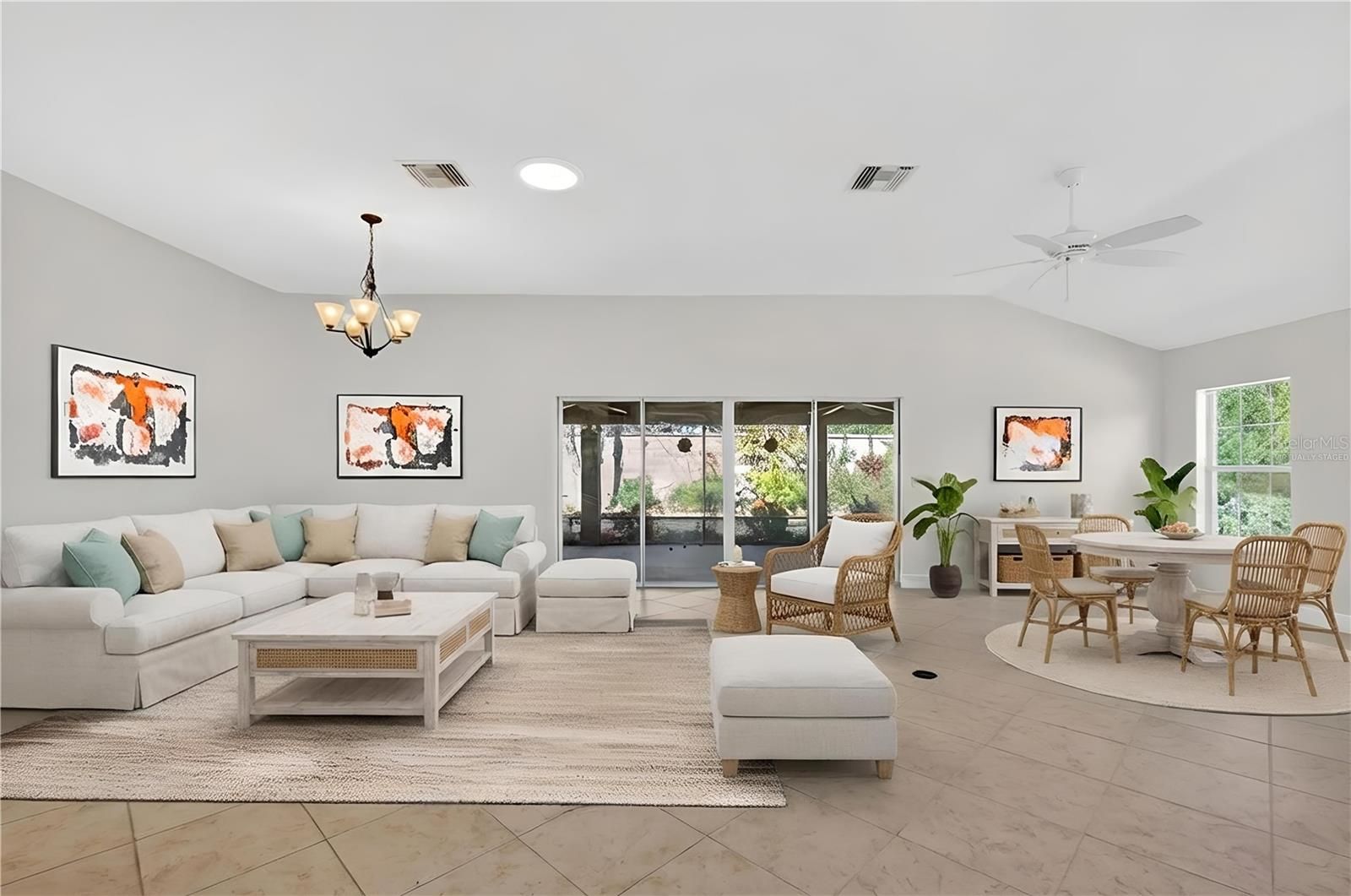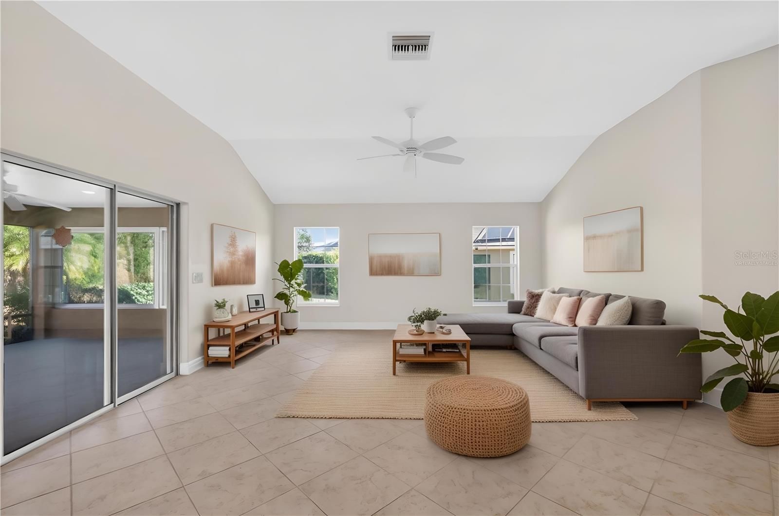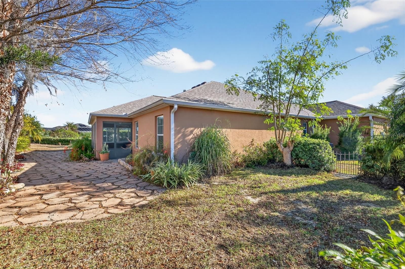 One or more photo(s) has been virtually staged. Nestled within a quiet CUL-DE-SAC in the highly coveted village of LAKE DEATON, this SPECTACULAR 3/2 BLOCK and STUCCO Gardenia model boasting an IMMENSE 30’x15’ SCREENED LANAI with adjoining STONE PATIO, LARGE REAR YARD with PRIVACY WALL and ROOM FOR A POOL, and an EXPANSIVE, OVERSIZED 583SF TWO CAR + GOLF CART garage is a MUST SEE! NEW ROOF (2025) and HVAC (2025)! TROPICAL landscaping with PAVER-edged beds, PAINTED drive and walkway, SCREENED entry, and a LEADED-GLASS door with sidelight and transom window welcome you in to a well-lit and GENEROUS foyer. UPGRADES include THREE SOLAR TUBES and HIGH baseboards throughout. The EXPANSIVE OPEN CONCEPT living, dining, kitchen, and dinette features GORGEOUS diagonally TILED flooring and HIGH VAULTED CEILINGS creating a SPACIOUS and voluminous main living area. The STUNNING kitchen showcases staggered, cinnamon-toned, WOOD cabinetry; GRANITE countertops; STAINLESS appliances; and UNDER-CABINET lighting. A built-in PANTRY with ROLL-OUTS and a convenient EAT-IN breakfast bar complete this culinary haven. For casual dining, the dinette area, sits adjacent to the kitchen with DOUBLE windows and transom inviting plenty of NATURAL LIGHT. A DOUBLE SET of sliding glass doors, from the living and dining rooms, opens to an IMMENSE 30’ x 15’ screened lanai. This EXCEPTIONAL outdoor living space features a painted floor, two ceiling fans, side GLASS windows, and an exterior door leading to the REAR STONE PATIO and LARGE backyard, ideal for gardening and outdoor enjoyment. This AMAZING space offers a REAR PRIVACY WALL and ample room for a FUTURE SWIMMING POOL, creating a truly FABULOUS setting for relaxation and entertaining! Back inside, the luxurious primary bedroom boasting a TRAY ceiling, TILE flooring, and TWO CUSTOMIZED WALK-IN closets. Its en-suite bathroom is a retreat in itself, featuring TILE flooring, TWO separate WOOD vanities with GRANITE tops, TILE ROMAN-STYLE WALK-IN shower, built-in LINEN closet with a hamper, and a separate water closet. Two additional bedrooms and a second bathroom are conveniently located near the front of the home, ensuring plenty of PRIVACY for guests or a quiet home office. Bedroom two features TILE flooring, a TRAY ceiling, and a large BAY window. The second bathroom is well-appointed with TILE floors, WOOD cabinetry, GRANITE countertop, TILED tub and shower combination, and a hallway linen closet. The third bedroom boasts a VAULTED ceiling and a built-in closet. A generous INTERIOR laundry room features TILE floors, a BUILT-IN utility sink with GRANITE top, shelving, and WOOD cabinetry for extra storage needs. The EXPANSIVE, OVERSIZED 29'x24' TWO-CAR + GOLF CART GARAGE offers EPOXIED flooring, WHITE STORAGE cabinets, attic insulation above, and a whole-house Nova water filtration system. DON’T MISS YOUR OPPORTUNITY TO MAKE THIS INCREDIBLE HOME YOUR OWN! The Village of Lake Deaton is conveniently located close to Brownwood Paddock Square, Evans Prairie Golf and Country Club, Bonifay Golf and Country Club, Belle Glade Golf and Country Club, Lake Deaton Pool and Recreation Center, Lake Okahumpka Park, Lake Deaton Plaza, Freedom Plaza, Colony Plaza, and an abundance of shopping, restaurants, banks, medical, and more! PLEASE WATCH OUR WALKTHROUGH VIDEO OF THIS MAGNIFICENT HOME with ROOM FOR A POOL and call today to schedule your Private Showing or Virtual Tour!