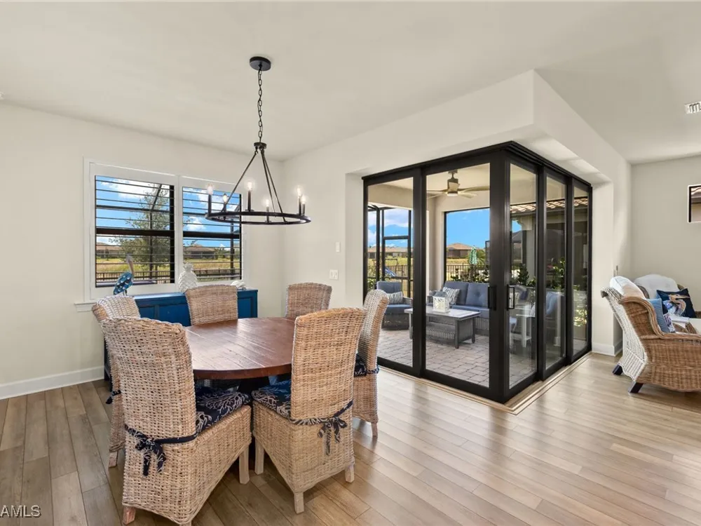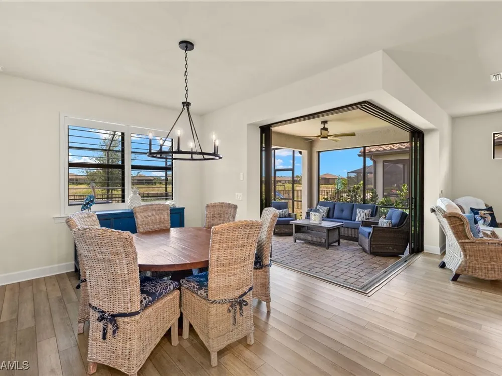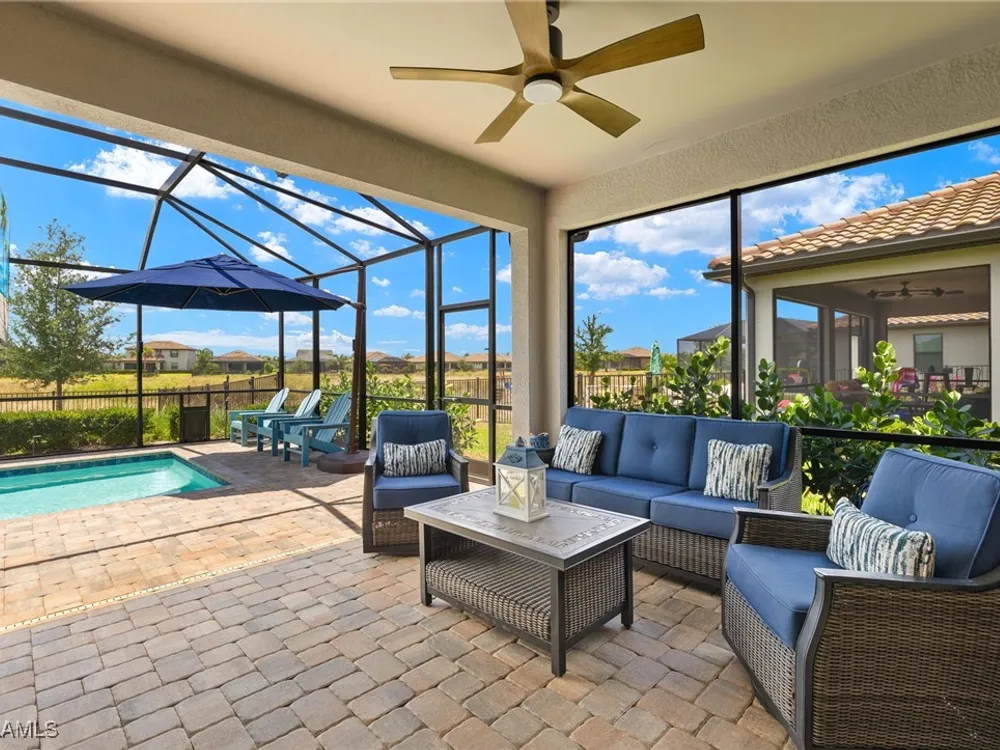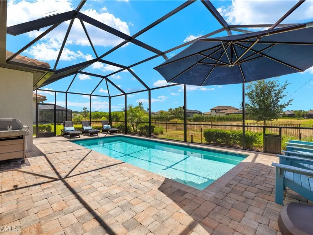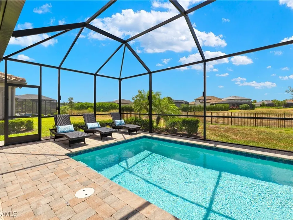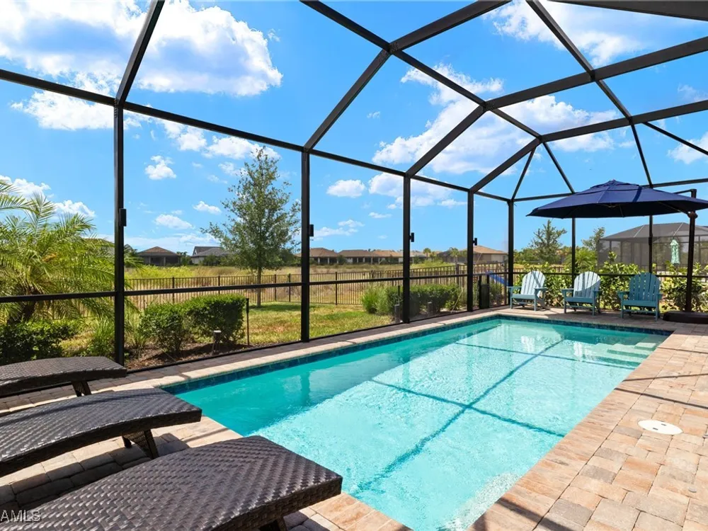 Welcome to your new southwest florida oasis! This beautiful POOL home is located in the highly sought-after community- The Place at Corkscrew. This residence features three bedrooms and two bathrooms, each thoughtfully decorated to give you a year round coastal vacation feel. The spacious kitchen boasts a large center island that overlooks the gathering room, ideal for entertaining. The open-concept living space, enhanced by 8-foot doors and upgraded baseboards creates a sophisticated ambiance that is enhanced by the upgraded ZERO-CORNER sliding glass doors. The sliders pocket behind the exterior walls, seamlessly merging indoor and outdoor living and offering a huge wow factor! Outside, you'll discover a heated pool within a screened enclosure, complete with automatic lighting for evening enjoyment. The desirable southwestern rear exposure ensures plenty of sunshine and beautiful sunsets. The backyard is also fully FENCED, providing both privacy and security. Entering into the owner's suite you will find a cozy space that opens to the owner’s bathroom- including dual sinks, a frameless glass shower, and a walk-in closet. This gorgeous home has so many extras! Plantation shutters add an elegant touch throughout the home. For your peace of mind, the property is equipped with a screened entryway and IMPACT WINDOWS. Additionally, the property features a 2.5-car garage with an epoxy floor, offering ample space for vehicles and storage. Residents of The Place at Corkscrew enjoy a wealth of resort-style amenities, including a stunning pool complete with a 100-foot waterslide, a large hot tub, splash pads, the Barefoot Bar & Grille, the Bourbon Bar, a café, a 24-hour gym, a movement studio, a children's play area, a playground, a dog park, bocce ball, basketball, pickleball, tennis courts, and a tennis pro shop. The community also hosts numerous events, clubs, and gatherings, fostering a vibrant social atmosphere. Don't miss this incredible chance to own a meticulously maintained home in The Place at Corkscrew. Schedule your private tour today to experience all that this exceptional property has to offer!