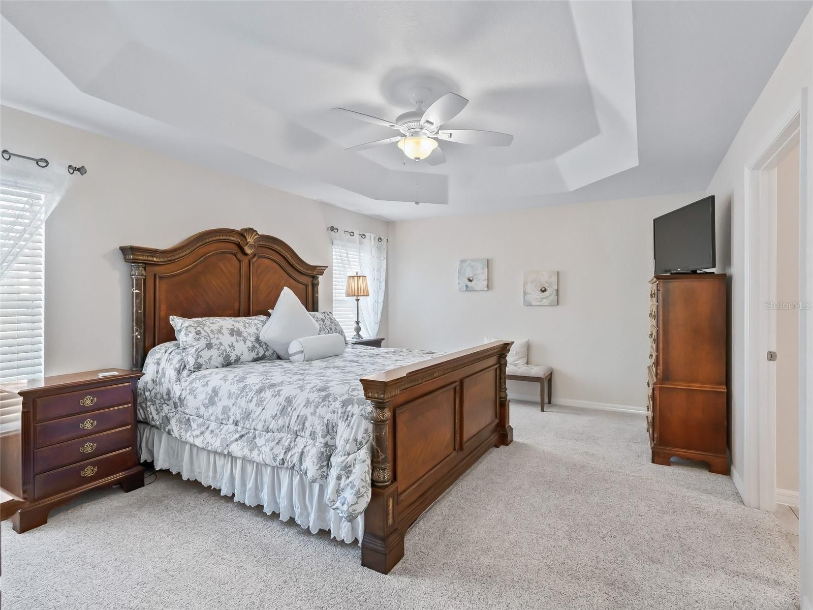 - Ceiling Fan(s), Crown Molding, Eat-in Kitchen, High Ceilings, Kitchen/Family Room Combo, Living/Dining Room, Open Floorplan, Main Level Primary, Solid Surface Counters, Split Bedrooms, Stone Counters, Thermostat, Tray Ceiling(s), Walk-In Closet(s), Window Treatments