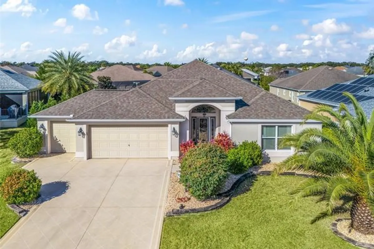 This custom Zinnia model home has so many upgrades! A rare find with 3 bedrooms and 3 baths... and... All new crown molding was added by owner, new appliances, All new custom flooring installed, Granite counter tops throughout, double primary bedroom suites with ensuite baths and a private 3rd bedroom with 3rd bath. In the kitchen, roll out shelving has been added in lower cabinets and the double closet pantry. Trayed ceilings in the double primary bedrooms plus enhanced ceiling in the 3rd guest bedroom (with a separate bath). The utility room with laundry sink and newer washer & dryer and storage cupboards. Custom Leaded glass entry door with leaded side window. The open Formal dining area is expandable. There's also a breakfast nook and breakfast bar island. All new fixtures added. The living area opens to the 3 season glassed in Florida room with slider windows and exit door to the back yard. Primary bath has a water closet, and Roman shower with built in shower bench. This gorgeous home sits among other fine homes in the Village of Hillsborough. The flooring has been recently sealed in the Spacious 2 car garage with an open golf cart garage complete with pull down stairs to the lighted attic storage area! New Lush landscaping was recently enhanced. Located between Brownwood or Sumter Landing Squares. All furnishings included in the sale. Low bond balance of 17,376.34. This one is ready for it's new owner and a 'turn-key' price.