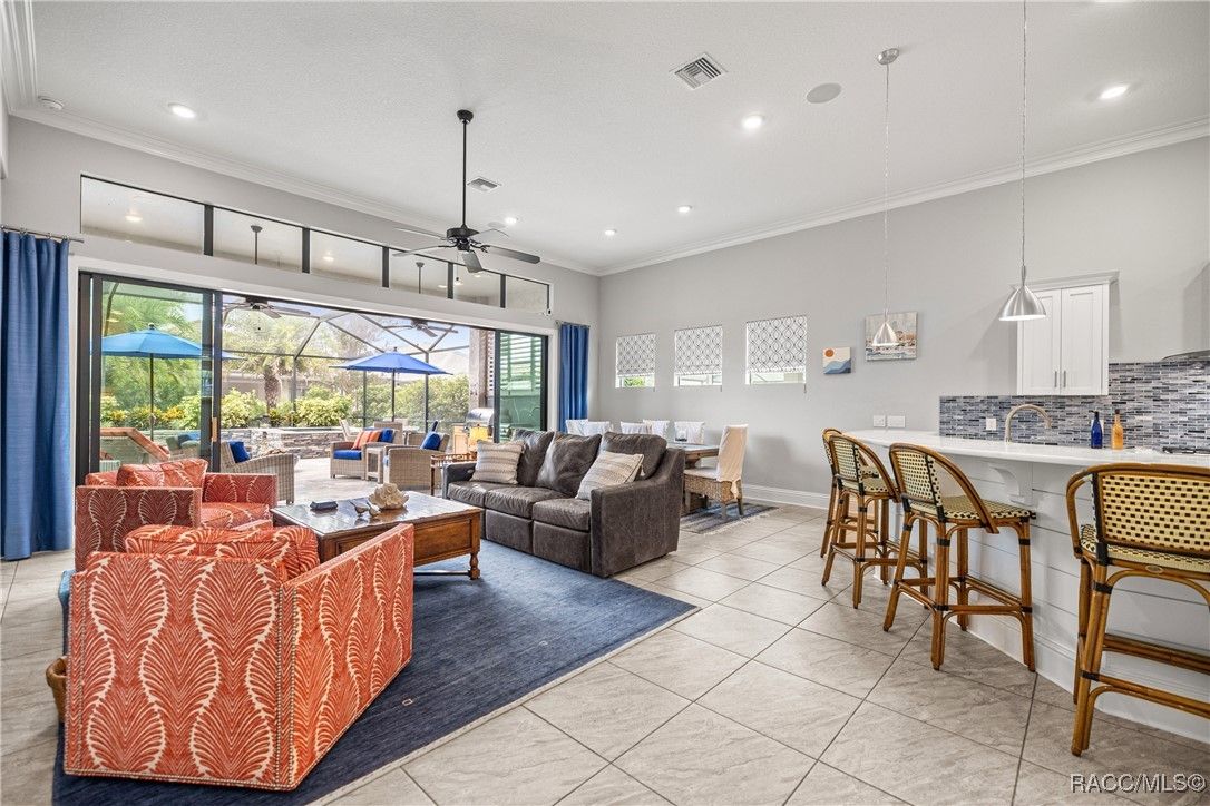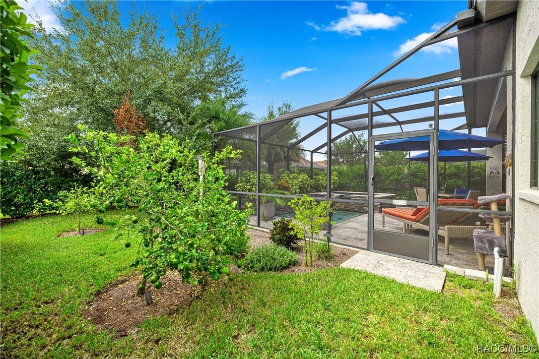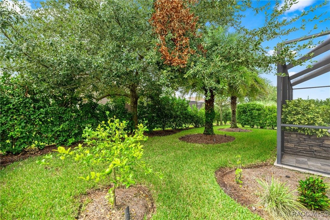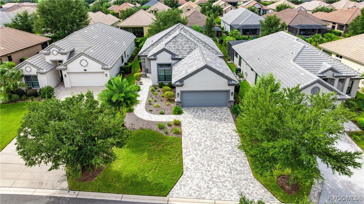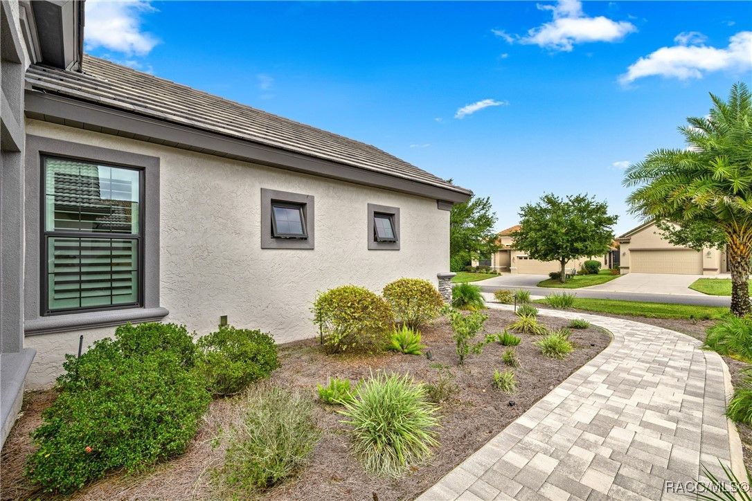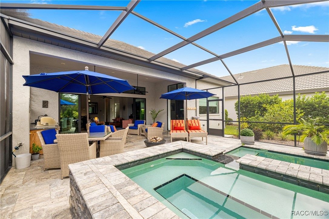 Tropical Paradise Living in Terra Vista! Step into your own private paradise as you gaze through the impressive 18-foot-wide sliding glass doors—opening to a lush tropical retreat with a sparkling saltwater pool and spa encased in beautiful stone. This stunning Carefree St. Thomas Style Home, set at 105 feet above sea level in the sought-after Westford Villas of Terra Vista, offers resort-style living at its finest. From the moment you arrive, you’ll be captivated by the elegant paver driveway in sophisticated gray tones, the slate tile roof, and the charming side-entry doorway that welcomes you into a bright, open living space designed for both relaxation and entertaining. Sellers are offering their Golf Cart to the Buyer with an executed contract that has a successful closing date. The gourmet kitchen features striking stone countertops, top-of-the-line appliances, and custom cabinetry, seamlessly flowing into the spacious great room—perfect for your favorite furnishings and gatherings. Throughout the home, enjoy upgraded tile flooring, plantation shutters, crown molding, and 7¼" base trim for a refined finish. Step out to the expansive travertine lanai—your ultimate outdoor oasis. Savor the soothing sounds of the planter waterfall, cook in the summer kitchen with grill, stove, sink, and refrigerator, or unwind by the outdoor fire pit under ambient decorative lighting that enhances the tropical ambiance. This home was built with quality and comfort in mind—featuring foam-core block walls, radiant barrier roof decking, and natural gas throughout, including the heated saltwater pool and spa. Technology and convenience abound with a Ring Doorbell and cameras, SONOS sound system, and 18-foot garage door. Live the resort lifestyle with Terra Vista’s world-class amenities—Tiki Bar, restaurants, three pools, pickleball, cycling, spa and fitness center, dog park, and over eight miles of scenic walking trails.