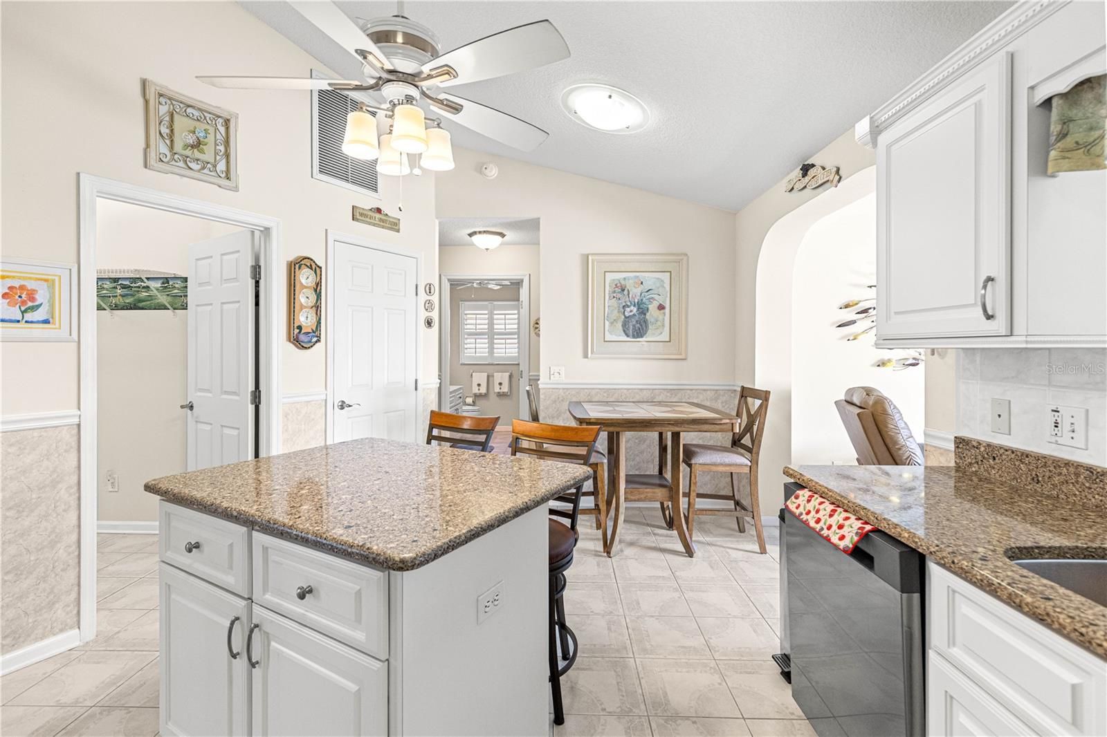 - Ceiling Fan(s), Eat-in Kitchen, High Ceilings, Kitchen/Family Room Combo, Split Bedrooms, Stone Counters, Thermostat, Walk-In Closet(s)