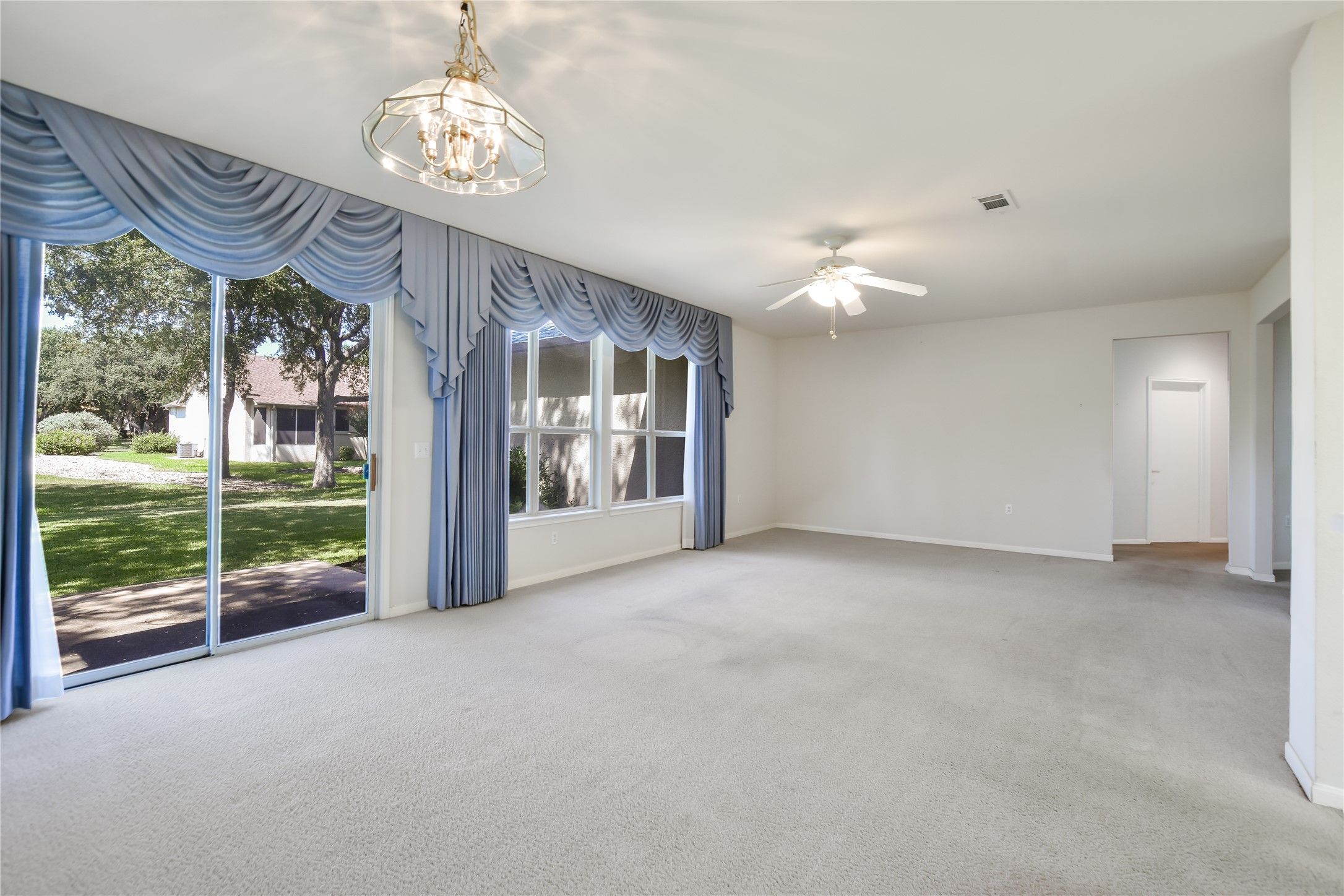 Come see now that the interior has been painted with Sherwin Williams Alabaster(walls) and Pure White (trim). Heavy drapes removed to allow a a more light and bright interior. MOTIVATED SELLER WILLING TO CONSIDER BUYER INCENTIVES AND FLOORING ALLOWANCE. The scenic drive through this gorgeous 55+ neighborhood will relax you the closer you are to this lovely home. The expansive, landscaped yard adds to the curb appeal as you approach. Inside you’ll find 2 beds, 2 baths and a dedicated study with custom built-in bookshelves and desk, as well as plantation shutters. The expansive living & dining room is full of natural light, both from the wall of windows at the back and the transom windows in the dining area. There are full sheers and drapes that grace the view of the shaded back yard. You can step into the kitchen from here and enjoy the bay window for your 2nd dining area. The guest bedroom and bath are separated from the primary with en suite for added privacy when you’re having guests. SUN CITY GEORGETOWN is a highly acclaimed community with multiple amenities (including a golf course, pools, tennis and pickleball courts, fishing ponds, and walking trails) that are sure to keep you as active as you desire or as relaxed as you want to be. The historic downtown area of Georgetown is a quick drive, as is retail and grocery shopping. Great restaurants and entertainment venues abound in Georgetown; come check the area out when you visit this home!