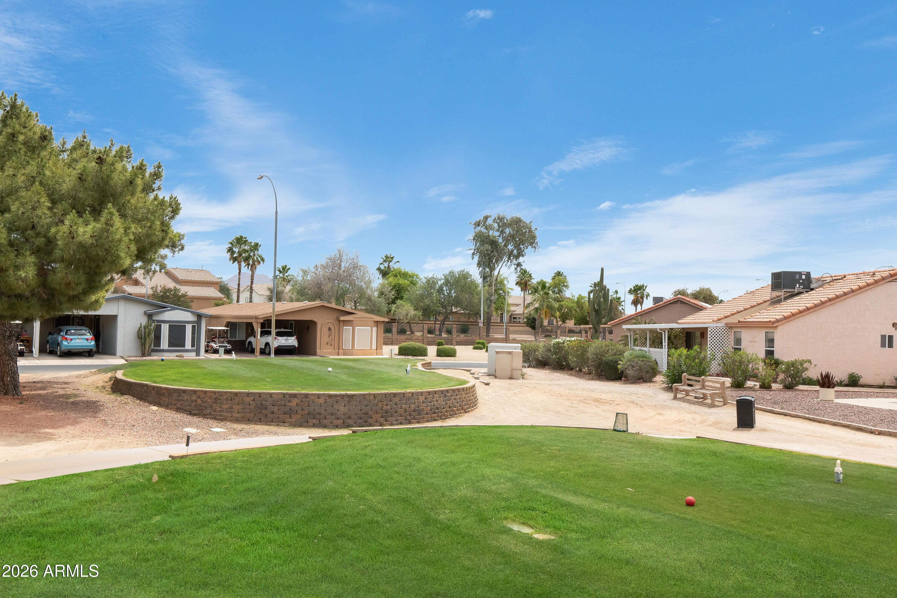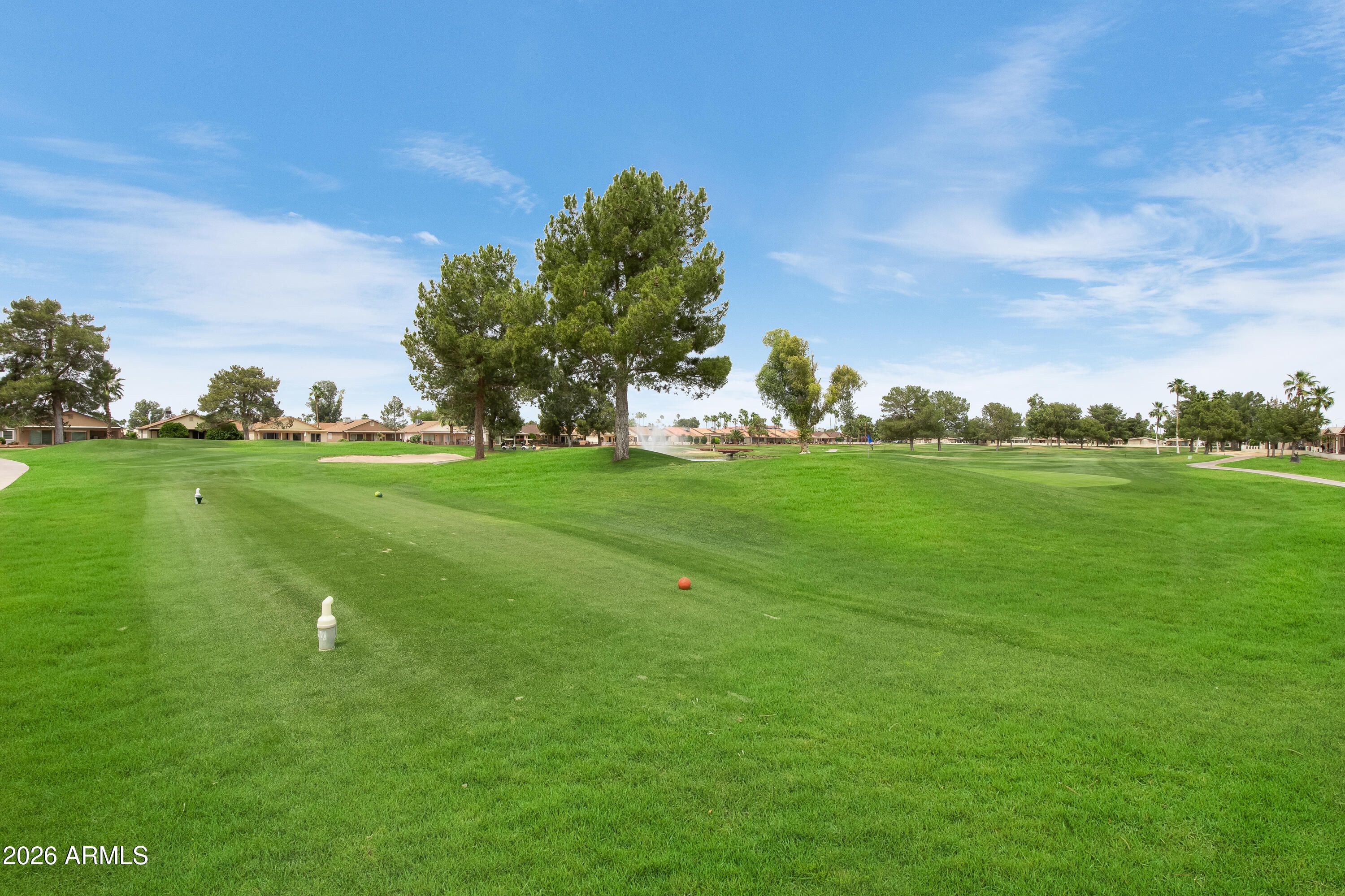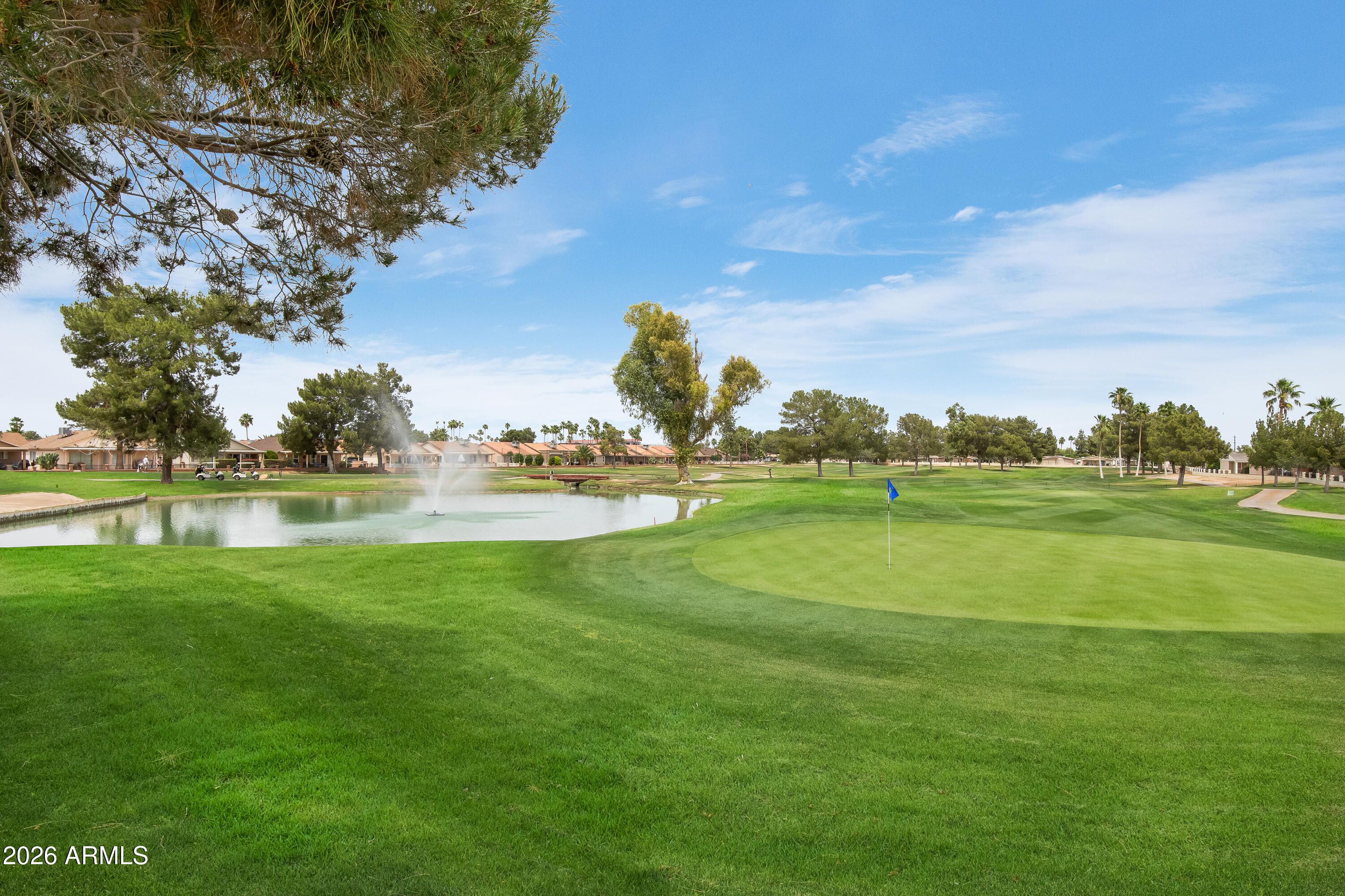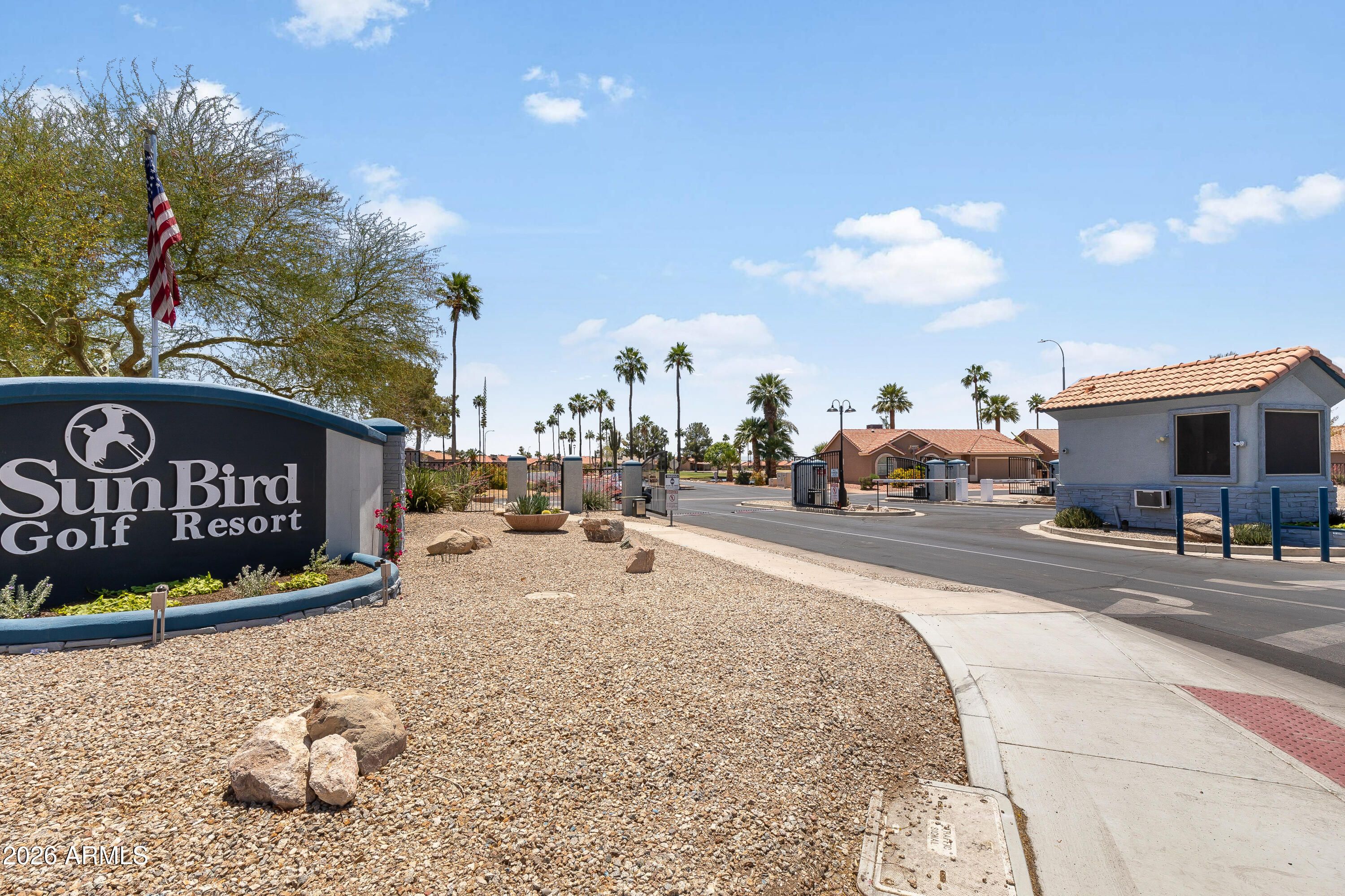 Welcome to Sunbird Golf Resort! Step into this inviting Extended Santa Barbara model, perfectly positioned on the 17th tee box with beautiful golf-course views. A charming front patio welcomes you inside, where you'll find an open floor plan with an extended living room and stylish LVP flooring. The kitchen offers excellent storage with added drawers, built-ins, Formica countertops, and an updated ss dishwasher. The primary bedroom features solar blinds and a walk-in closet. The guest bedroom includes a convenient Murphy bed, creating flexible space for a home office or hobby room. Out back, the patio provides just the right amount of privacy while still capturing those relaxing golf-course views. This corner lot offers fruit trees on the east side of the home and low maintenance desert landscaping. The attic area over the garage offers additional storage space. Sunbird's amenities include a Clubhouse, the Horizon Room restaurant, two pools, fitness center, library, tennis, pickleball, bocce ball, and a full calendar of activities.