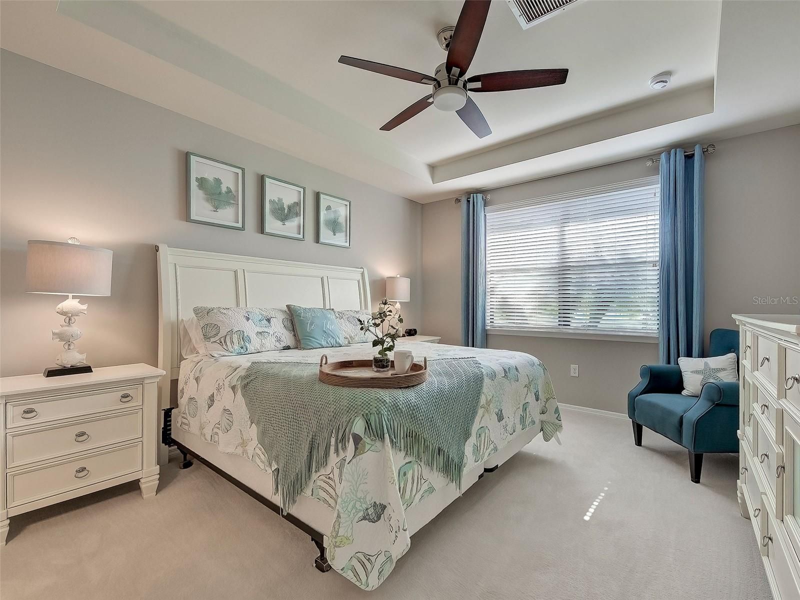 - Ceiling Fan(s), Open Floorplan, In-Wall Pest Control, Main Level Primary, Solid Surface Counters, Split Bedrooms, Stone Counters, Thermostat, Tray Ceiling(s), Walk-In Closet(s), Window Treatments