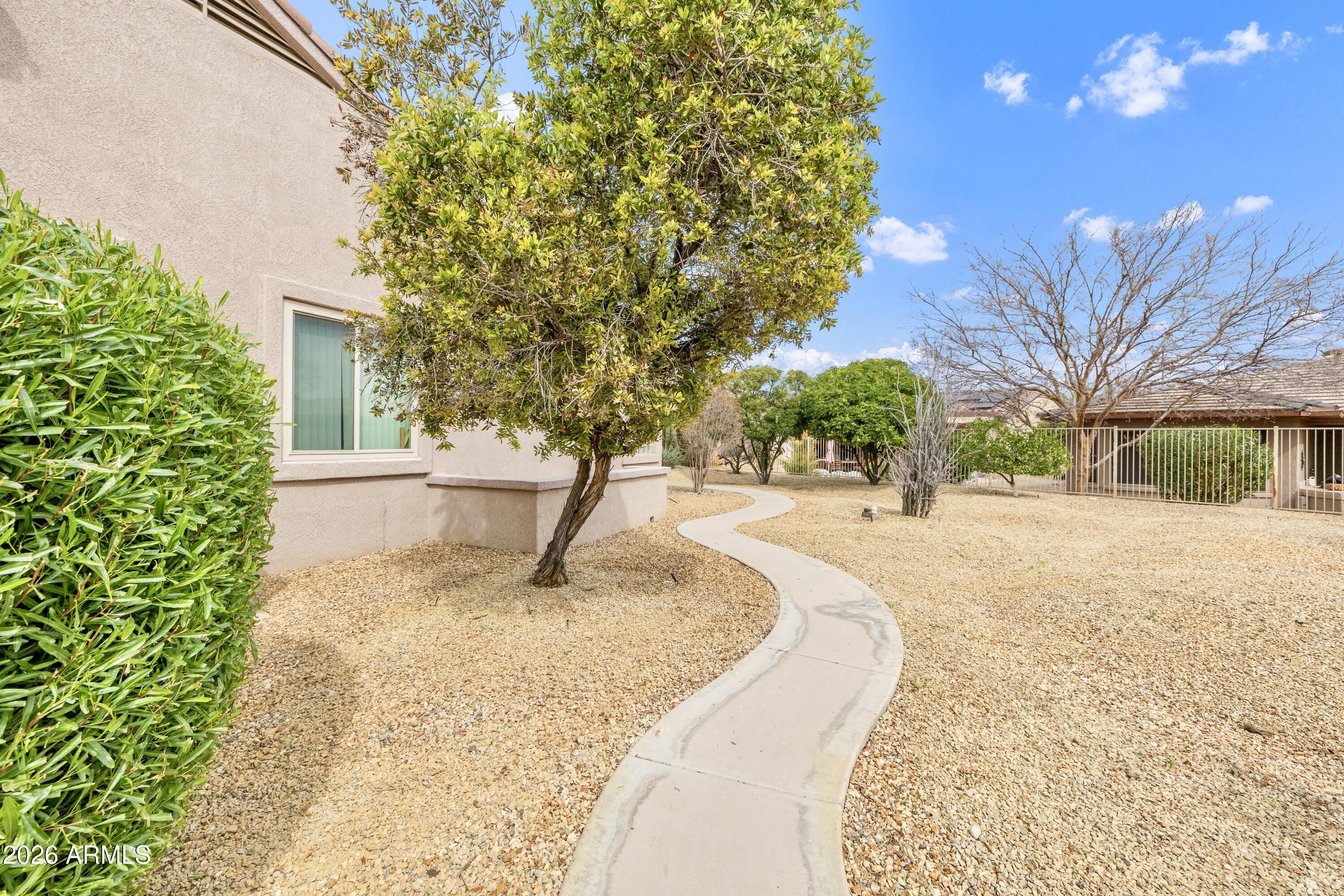 Tucked away at the end of a quiet cul-de-sac in The Grand, this beautifully maintained single-story home offers comfort, lots of space, natural light and effortless Arizona living. Situated on a large lot with a 3-car garage, it provides both privacy and flexibility. The versatile floor plan features either three bedrooms or a two-bedroom plus den setup, perfect for a home office or guest space. This well cared for home has a new roof, newer HVAC, new water heater, and an H2O Concepts whole-home water purification system. The inviting layout is ideal for entertaining and everyday living. Step outside to a spacious backyard filled with a variety of mature fruit trees, creating a peaceful retreat perfect for relaxing, gathering, and enjoying the Arizona lifestyle.