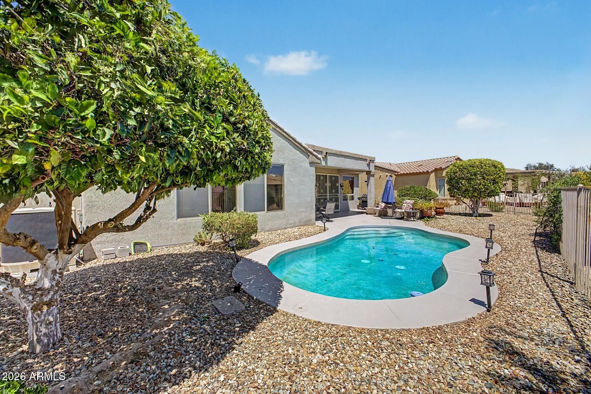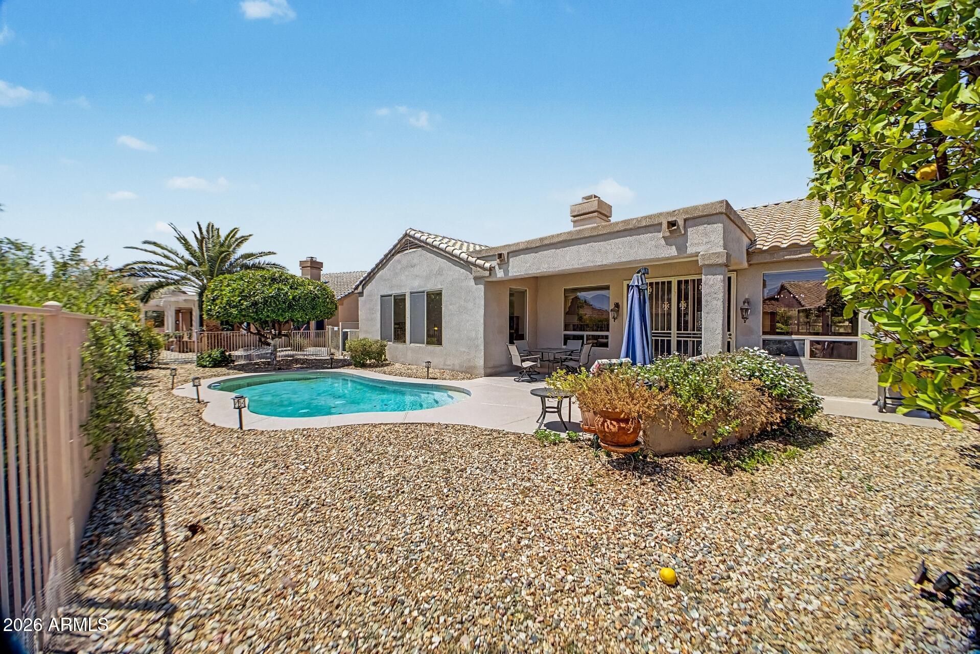 Beautifully maintained single-story home in Sun City Grand! Popular Coronado floorplan featuring 2 bedrooms, 2 bathrooms plus a versatile den/office. Bright eat-in kitchen with bay window, stainless steel appliances, and plenty of cabinet space. Spacious primary suite includes a sitting area, walk-in closet, and views of the backyard. Enjoy Arizona living with a private pool, covered patio, and large 9,000+ sq ft lot with mature landscaping and fruit trees. Recent updates include a new HVAC system (2022). Located in a sought-after active adult community with golf, pickleball, tennis, and more. Move-in ready! All furniture pictured conveys with the property. Buyer to verify all facts and figures.
