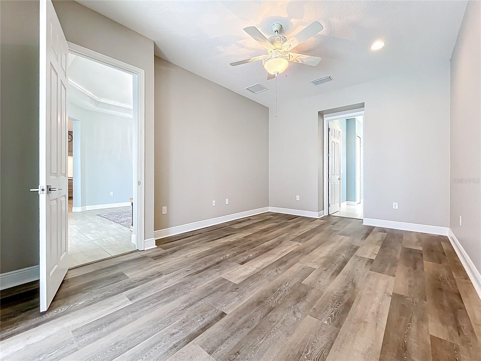 - Ceiling Fan(s), Crown Molding, High Ceilings, In-Wall Pest Control, Kitchen/Family Room Combo, L-Shaped Dining Room, Open Floorplan, Main Level Primary, Solid Surface Counters, Split Bedrooms, Thermostat, Tray Ceiling(s), Walk-In Closet(s), Window Treatments