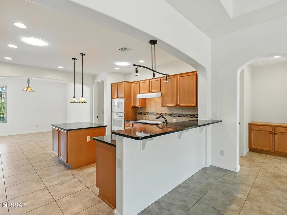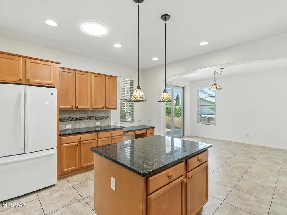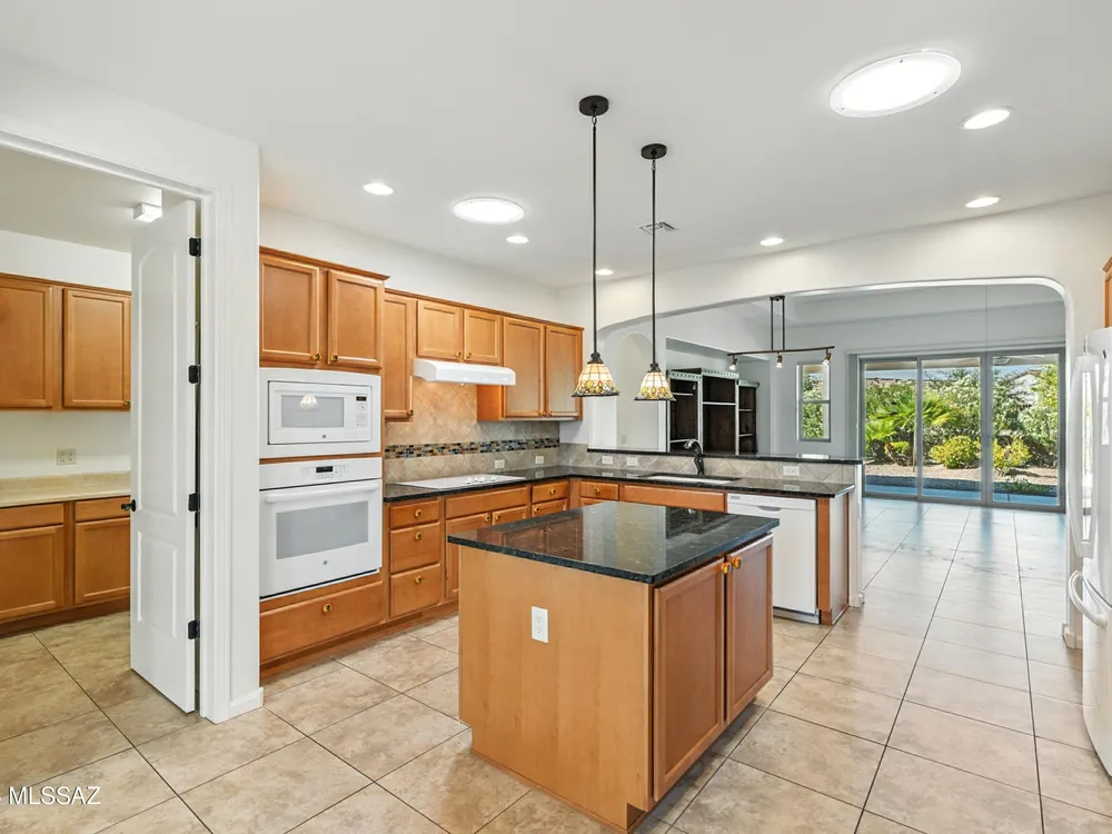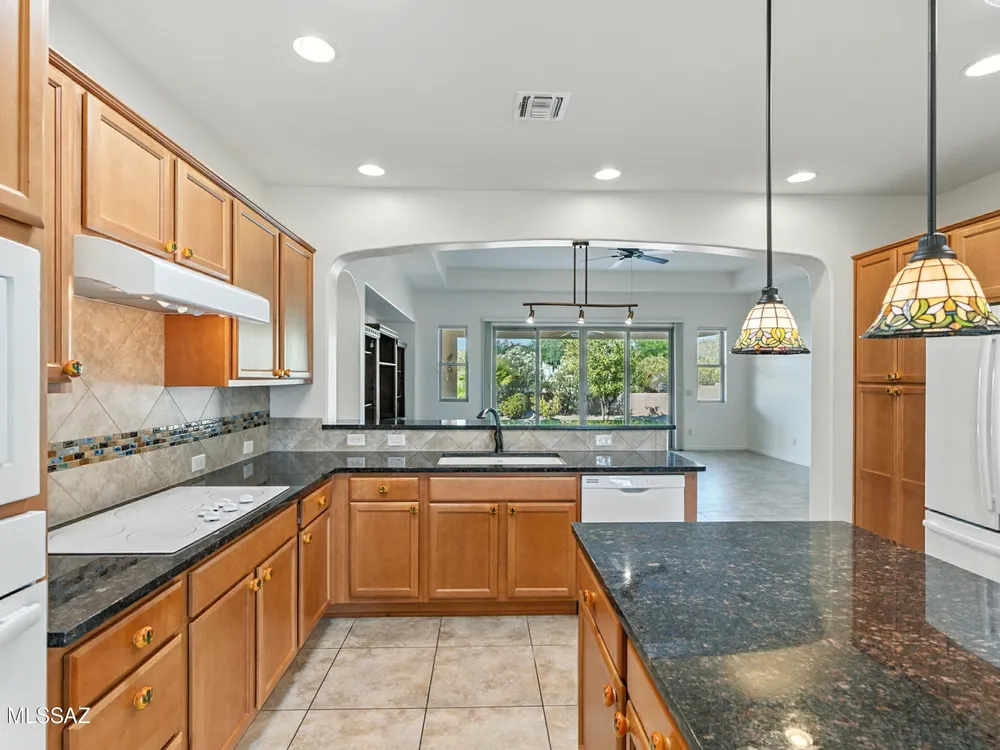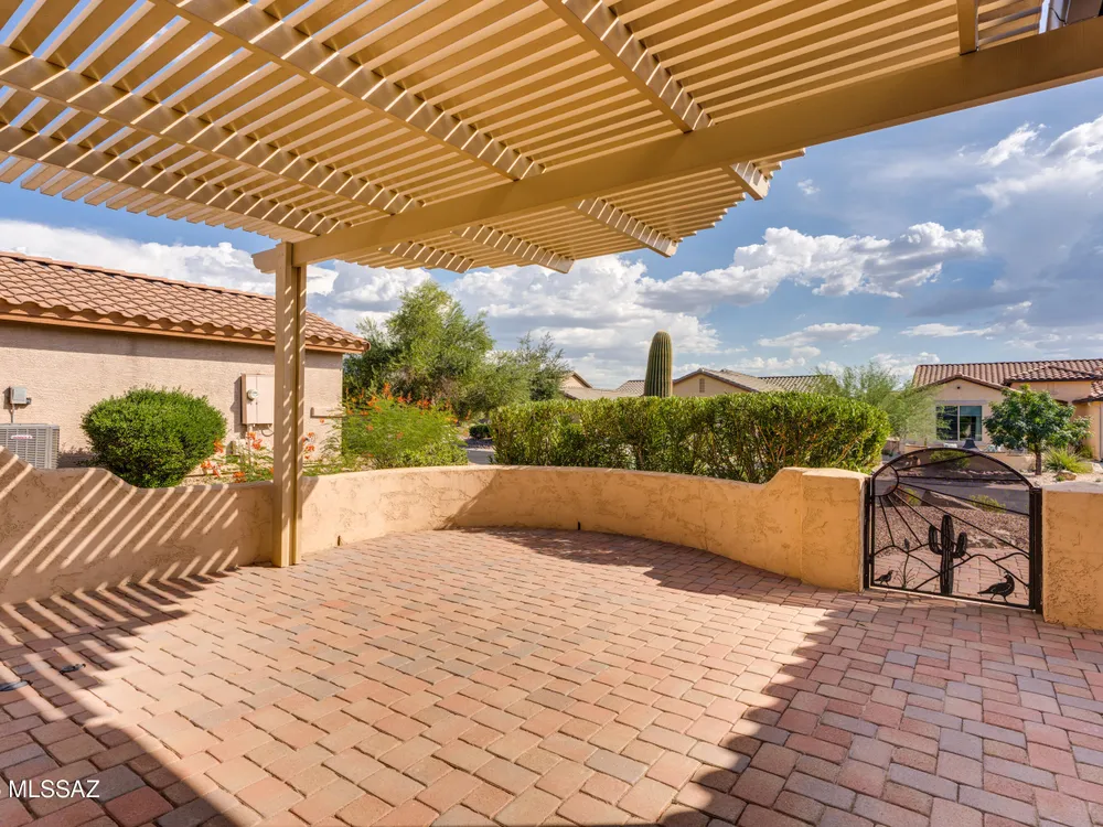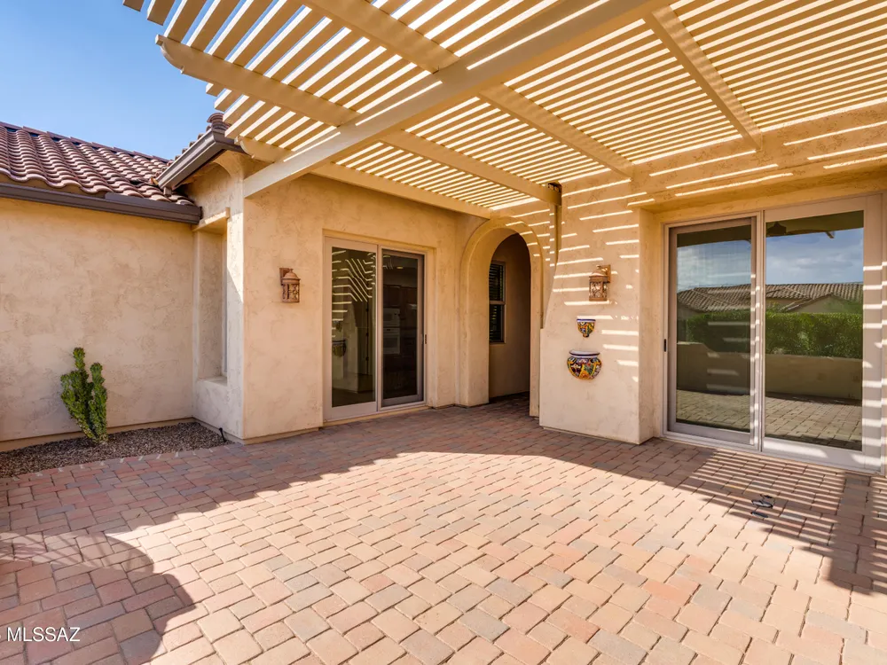 Light, bright and move-in ready! This 2,132 sq.ft. well designed Medina model has 2 BR, 2.5 BA, a large Den, tile floors throughout, and beautiful outdoor spaces to enjoy the warm Arizona climate. Enter via the welcoming front paver courtyard with a pergola for added shade. Spacious great room has 4-panel center-open slider and windows for an abundance of natural light. Upgraded kitchen w/ breakfast bar, center island, granite counters. Dining off kitchen and large Den, both w/ sliders to front courtyard. Owner's suite w/ dual vanity bath, soaking tub, tile shower and walk-in closet. Guest BR has en suite bath. Laundry w/ added store, separate powder room. Out back rear covered patio with NE orientation offers afternoon shade to enjoy the lush backyard landscape. 2-car + Golf Cart garage!