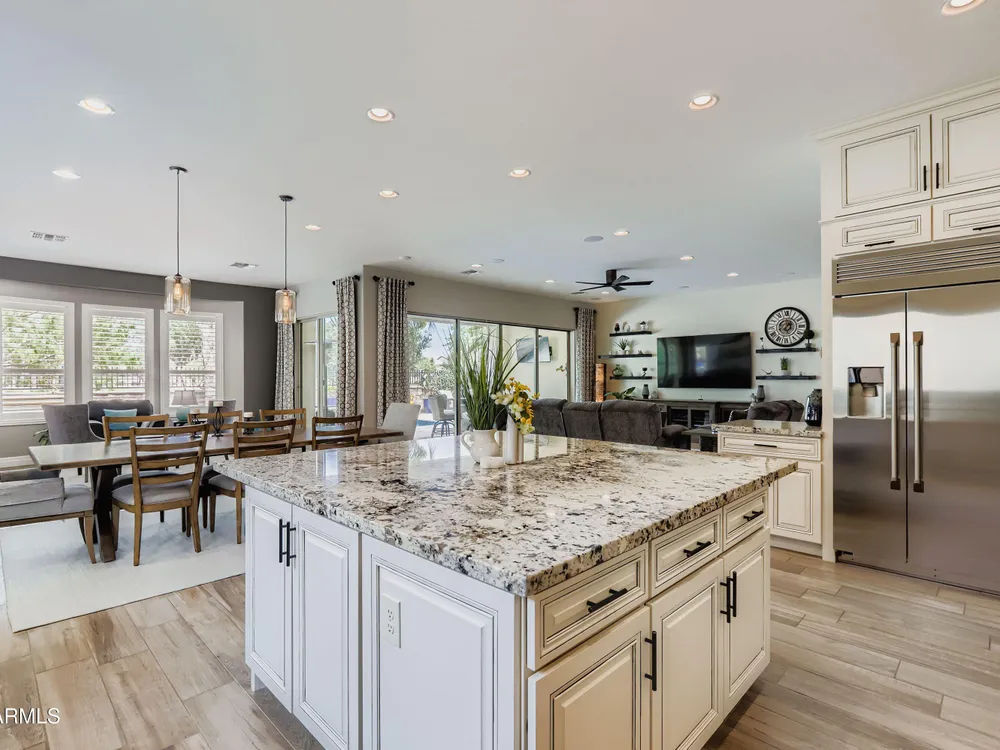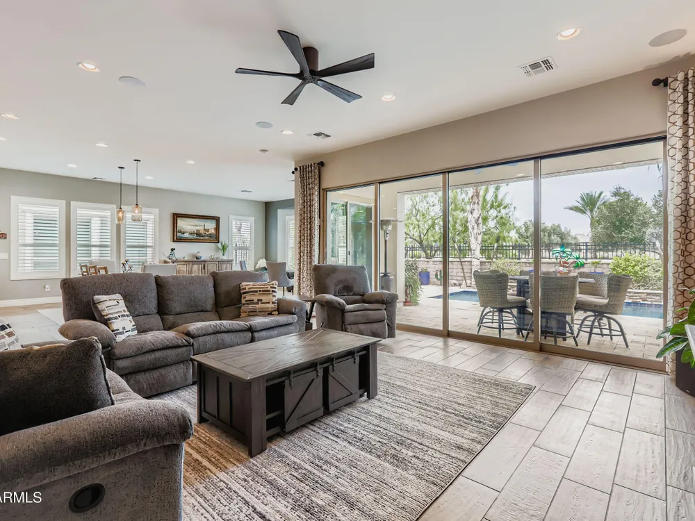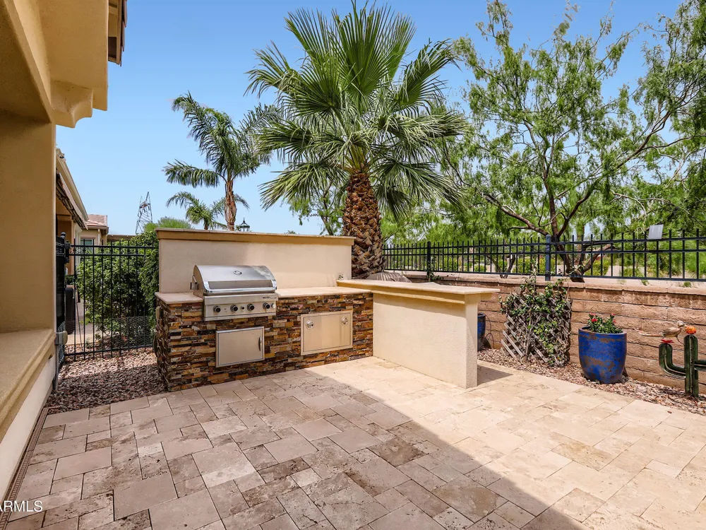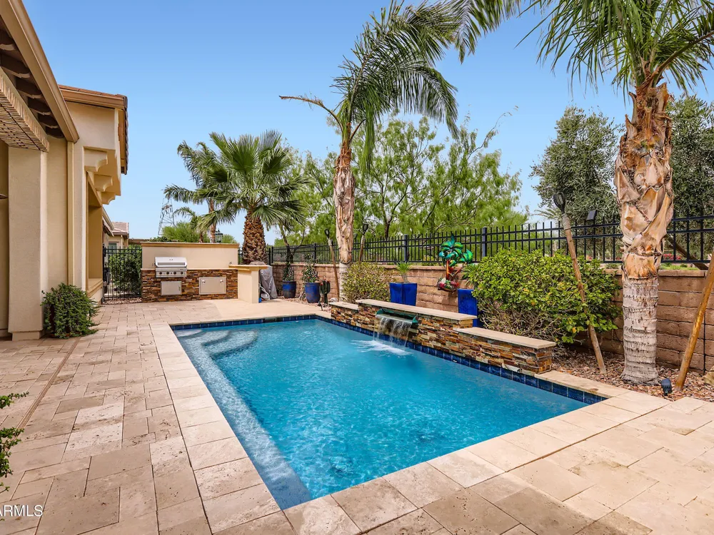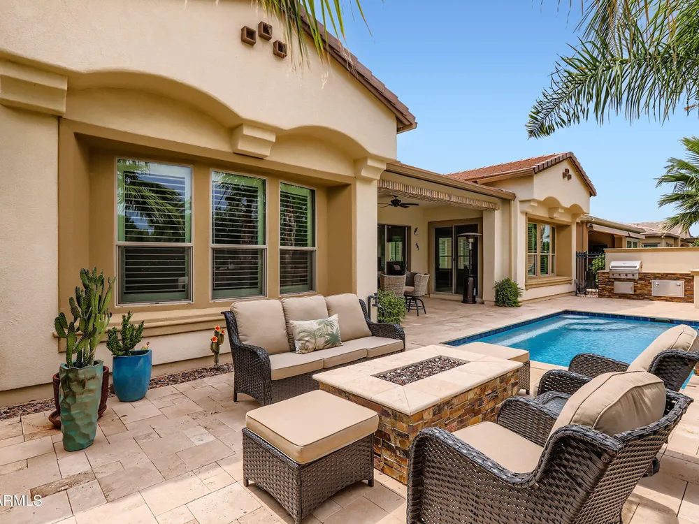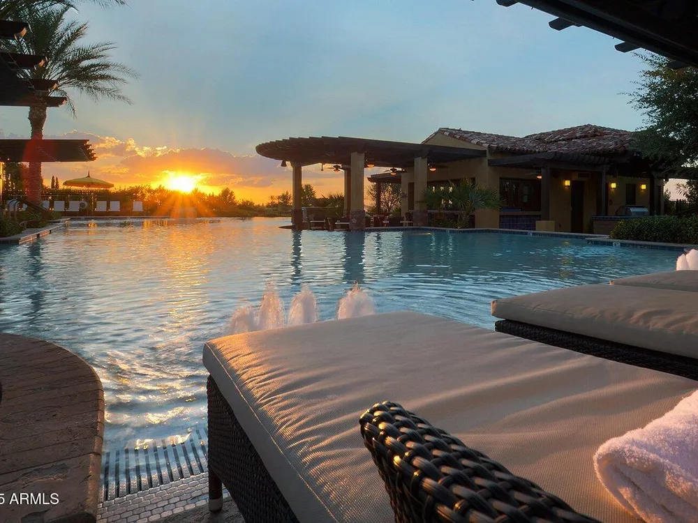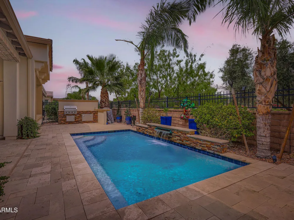 This Stunning and Highly Upgraded Alora model home boasts countless Upgrades and Timeless Style. From the Cobblestone Drive and Courtyard, you enter the Beautiful Canterra Iron Door and are immersed in Luxury Finishes and warm tones. The vast Chef's Gourmet Kitchen will spoil you with Floor-to-Ceiling Custom Cabinets, Premium Built-in SS Appliances and Gas Range, a Huge Stone Island, Cabinet Pullouts and a Massive Pantry, while the 10' Ceilings and Spacious Great Room make a wonderful place to Socialize and Entertain. Shutters, Wood-Look Tile and Custom Paint throughout complement the 8' Stacking Patio Sliders, Extended Bay Windows, Coffered Ceilings, Custom Lighting, Designer Showers and Fabulous Smart Space/Laundry Room. There are speakers throughout the home and patio and each bedroom has its own private ensuite. But maybe you will prefer to be outside with the Pebbletech Pool, Built-in BBQ Island, oversized Firepit and Designer Landscaping in a Beautiful yard with no neighbors behind and Sunset views. If you venture out to the Clubhouse, you have endless clubs and social engagements to embrace, and indulge in the Explorations Cafe, Apps & Apres, La Palma Kitchen & Tap, and Bistro 1528. Experience a Private Golf Club, Indoor and Outdoor Pools, a Newly Renovated Gym, Pickleball, Tennis, Bocce Ball and some Adult Libations at the Algarve Pool & Bar. Imagine Yourself in this Fabulous Lifestyle, this meticulous and very special home will not disappoint.