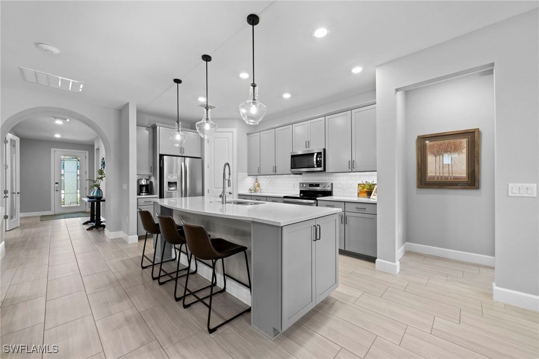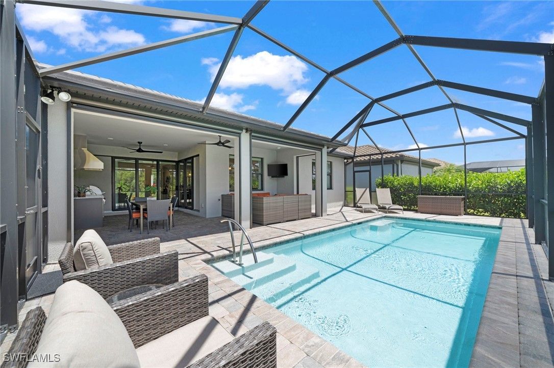 The oversized den, equal in size to bedroom two, offers flexibility as an office, media room, or easy conversion to a third bedroom. Step outside to a private pool and outdoor kitchen overlooking a peaceful natural preserve—perfect for entertaining or relaxing. Freshly painted and move-in ready, this home features hurricane impact windows and doors, a whole-home Generac generator, and an extended climate-controlled tandem garage with cabinets, mini-split, and epoxy floors. Inside, enjoy open living with volume ceilings, zero-corner sliders, motorized shades, and designer lighting. The kitchen shines with 42-inch cabinets, stainless appliances, and a large island, while the primary suite offers a spa-style shower, double vanity, and walk-in closet. Located in The Place at Corkscrew, residents enjoy resort-style amenities including a pool with 100-foot slide, pickleball, tennis, bocce, fitness center, spa, restaurant, and bourbon bar.