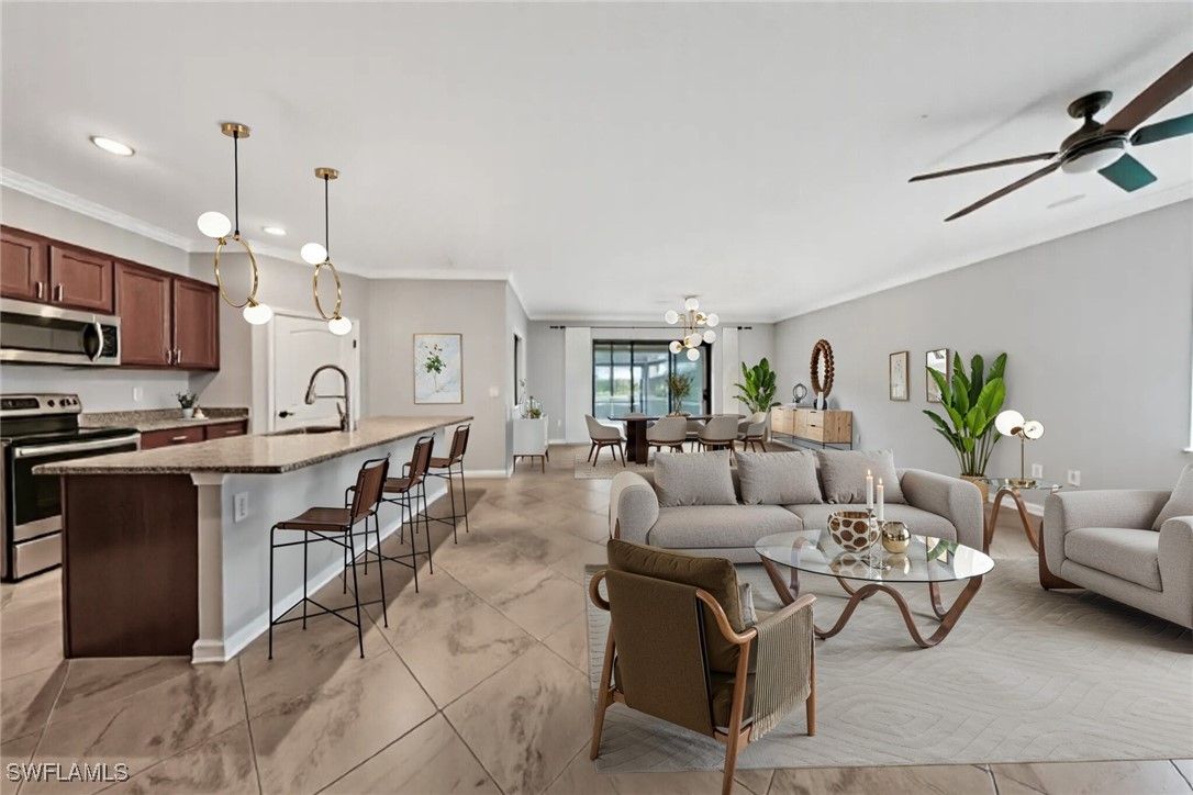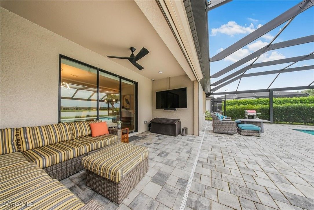 NORTHWEST LAKEFRONT VIEWS, CUSTOM POOL & SPA, WHOLE HOME GENERAC GENERATOR, ATTACHED ACCORDIAN HURRICANE SHUTTERS, STORM SMART HURRICANE SCREENS ON THE LANAI- this home is FULLY LOADED WITH HIGH END UPGRADES!!! Offering 3 BEDROOMS + DEN, 3 FULL BATHS, AND 2,032 SQFT of interior living space this stunning home blends the best of SW Florida living with peace of mind. Additional UPGRADES include TILE FLOORING THROUGHOUT, BOSCH KITCHEN APPLIANCES, SURROUND SOUND SPEAKER SYSTEM, CUSTOM WOOD PANTRY SHELVING, and a WHOLE HOME REVERSE OSMOSIS SYSTEM. The primary suite offers DUAL WALK-IN CLOSETS WITH CUSTOM SHELVING (one with a built-in ironing board), a soaking TUB, and frameless glass shower. The GARAGE is INSULATED & AIR-CONDITIONED WITH EPOXY FLOORS, OVERHEAD RACKS, & ATTIC STORAGE—ideal for hobbies or valuables. Step outside to your private oasis: a 3-SIDED PANORAMIC SCREEN ENCLOSURE, no-see-um screening, a HEATED POOL & SPA, additional lanai privacy screens, plus the OUTDOOR FURNITURE & TV IS INCLUDED —perfect for entertaining on day one! Located in the highly sought after resort style community - THE PLACE AT CORKSCREW - where you will enjoy WORLD-CLASS AMENITIES: a resort-style pool with 100’ WATERSLIDE & SPLASH PAD, poolside RESTAURANT & BAR, 2-story FITNESS CENTER, movement studio with daily classes, TENNIS, PICKLEBALL, BOCCE, BASKETBALL, VOLLEYBALL, CAFÉ, BOURBON BAR, DOG PARK, and more. Just 10 minutes to shopping, dining at Miromar Outlets and Gulf Coast Town Center, 15 mins to RSW AIRPORT, and 40 mins to Southwest Florida’s top beaches. All the projects are DONE! Just move in and start enjoying a low maintenance and stress free lifestyle!