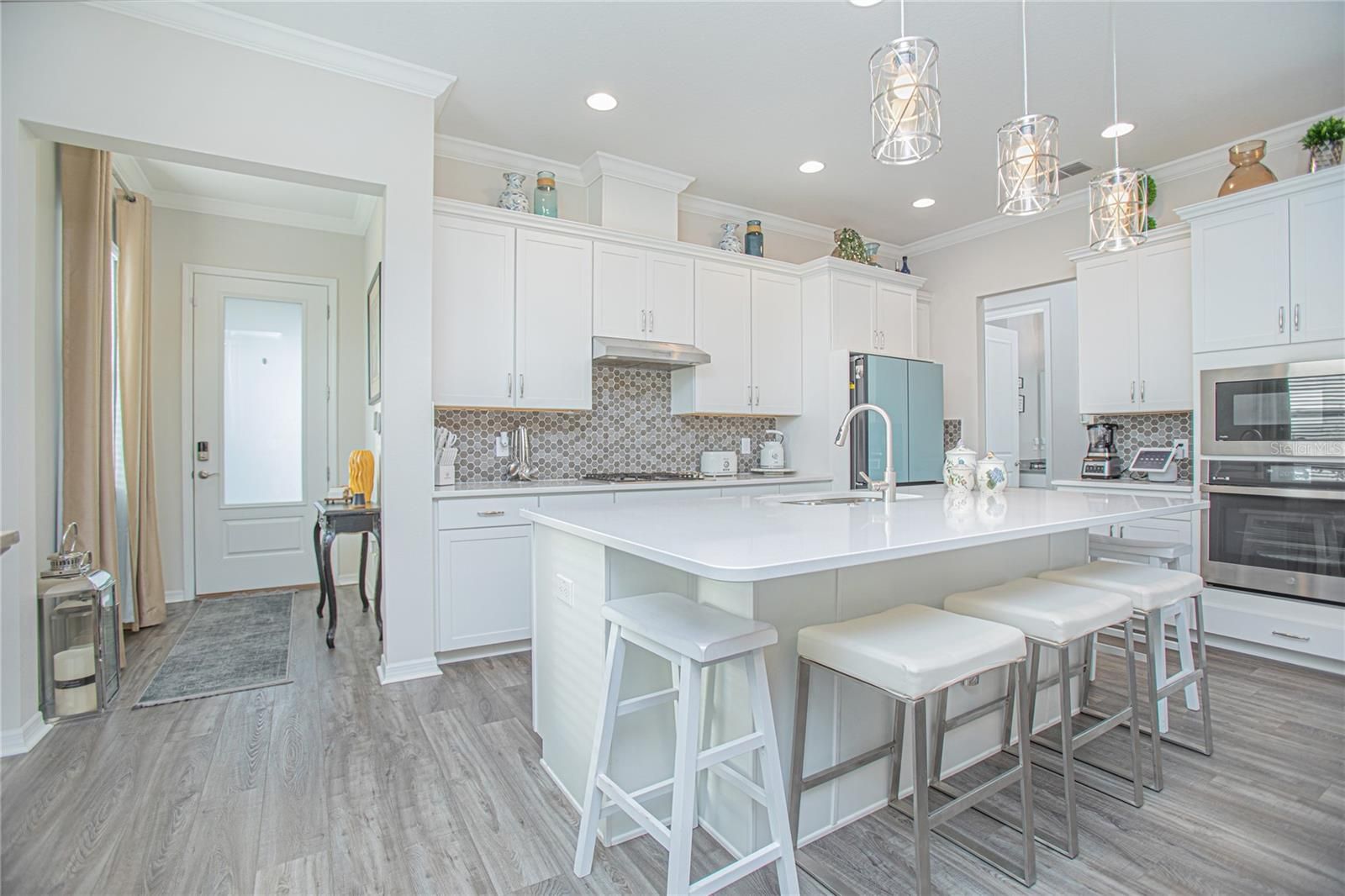 Experience resort-style living in the highly desirable 55+ community of Four Seasons at Orlando! This beautifully appointed 2-bedroom, 2-bath villa showcases 1,437 sqft of open, light-filled space with stylish upgrades throughout. The gourmet kitchen is equipped with quartz countertops, a gas cooktop, a spacious island, and abundant cabinetry, perfect for everyday living or entertaining. Step outside to your own private oasis: a screened lanai with a custom summer kitchen and extended pavers, ideal for relaxing or hosting guests. A privacy wall creates a secluded ambiance, while the screened front porch is the perfect spot to enjoy Florida’s breezes. Enjoy the elegant touches of laminate flooring, a tray ceiling in the living area, and thoughtfully designed finishes in every room. The primary suite features dual sinks and a walk-in shower with a built-in bench for added comfort. Situated in the heart of the Celebration area, you’ll be minutes from world-class dining, shopping, and all the excitement of the Disney attractions. Residents of Four Seasons enjoy exclusive access to a 12,000 sqft clubhouse, two pools, pickleball, tennis, bocce courts, and the Mystic Dunes Golf Course. This exceptional villa blends luxury, convenience, and a vibrant community lifestyle. Schedule your private showing today and discover why this is one of the best opportunities in Four Seasons at Orlando!