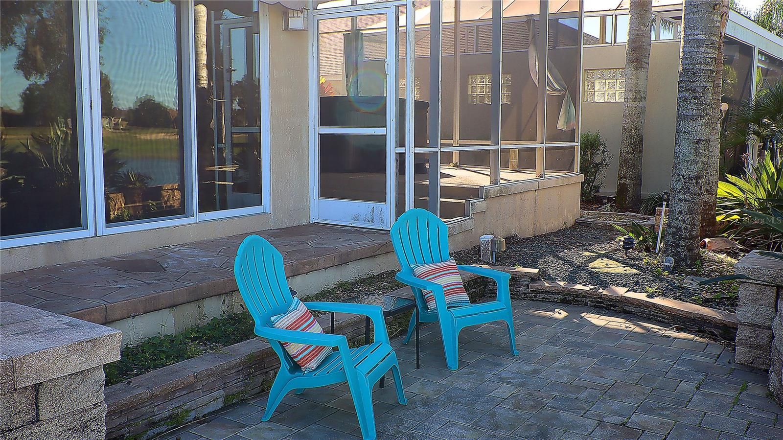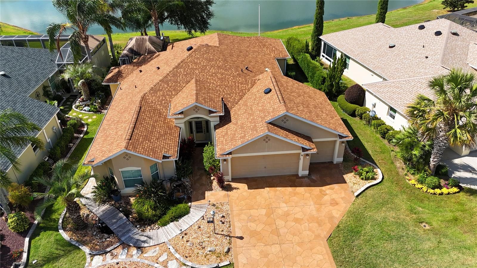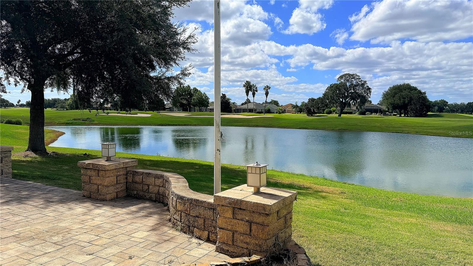 This gorgeous Lantana is located in the Village of Saint Charles, close to Sumter Landing, Cane garden and golf courses and lots of shopping and dining. It has been professionally staged. This is a 3/2 stretched Lantana with a fantastic pond and golf course view from the large Florida room which is all glassed all across the back. There is granite on the counter top and the large tv is staying with the home. The floor in this room is tile as are the living room and dining room and kitchen. There is a wonderful tiered back patio for leisurely viewing of the pond. Off of the Florida Room is a step up into a large hot tub (ASIS). This room is screened in for maximum comfort while soaking and watching the world go by. In the front of the home is a unique waterfall and walk way over a bridge. The water flows under the bridge. This home has a two car garage and a golf cart garage. Enter through the leaded glass front door and you will look through the house and see the view. The kitchen has granite counters, a nice tiled backsplash and stainless appliances. Off of the kitchen are more cabinets and storage and granite counters. The washer and dryer were moved to the garage to create more space in the pantry area. The seller also added an office off of the kitchen. The office can stay or will be moved. The Primary bedroom has plantation shutters and a large walk-in closet. The bath has dual sinks and a tiled step in shower. The front guest bedroom is currently being used as an office and has carpet and plantation shutters and a built in closet. The other bedroom has a closet and plantation shutters. The guest bathroom has granite and an enclosed tub/shower combo. There is a small bond left $12,346.94, Fire is $320.71, Maint $604.00, Bond pmt $1,352.84. Roof is 2025.