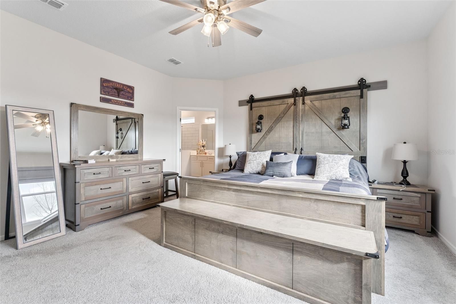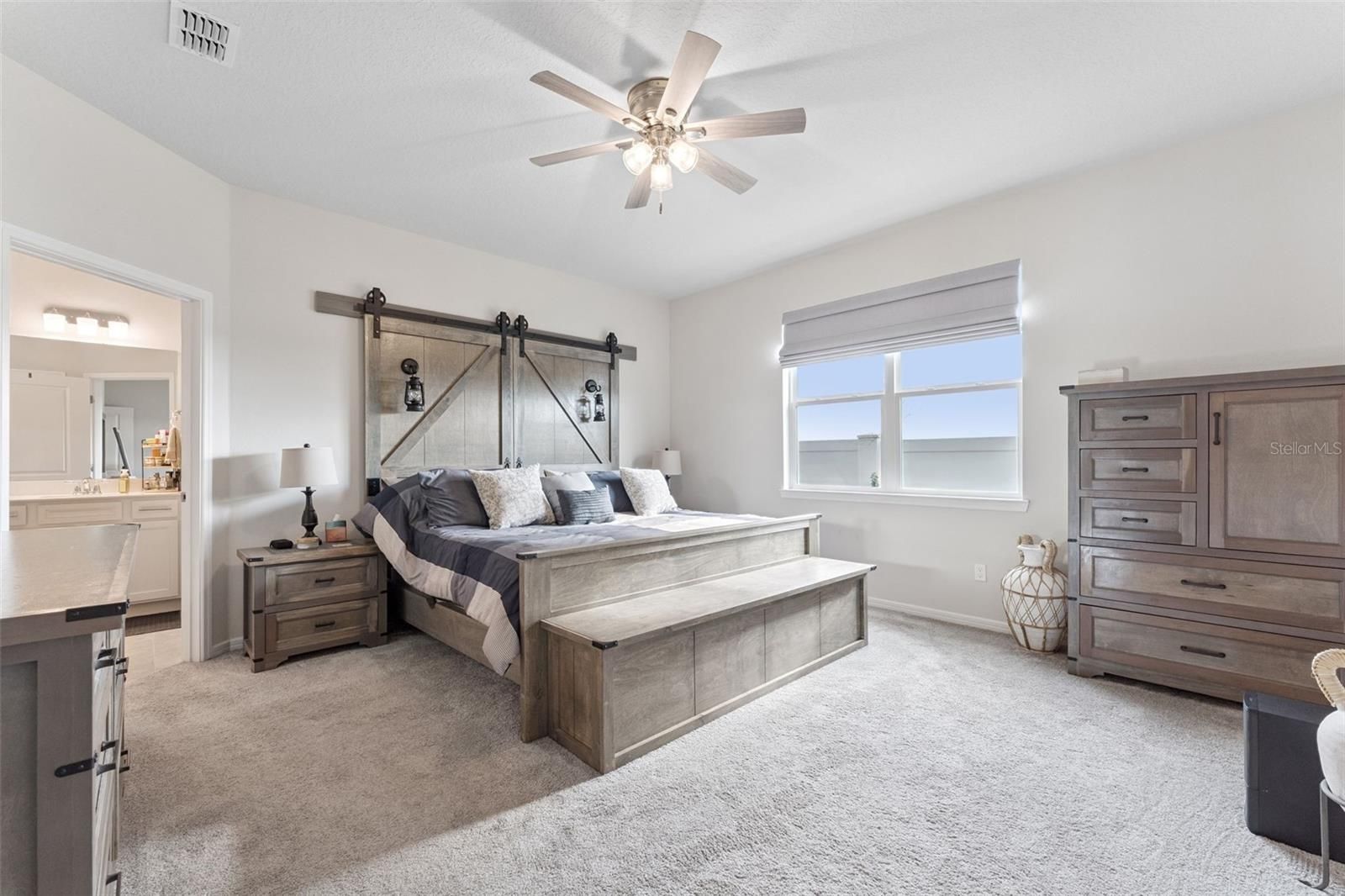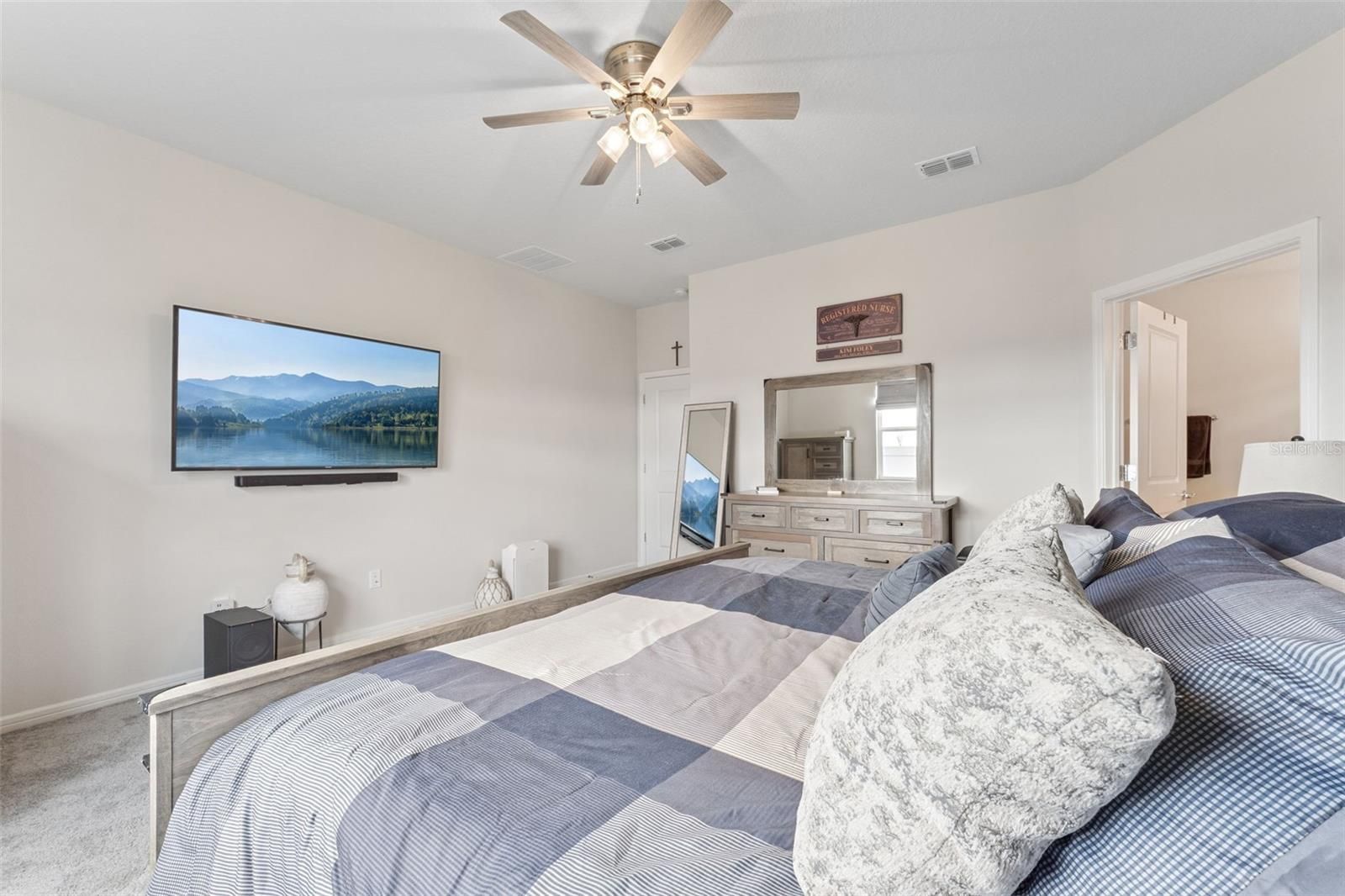 - Ceiling Fan(s), In-Wall Pest Control, Kitchen/Family Room Combo, Open Floorplan, Main Level Primary, Solid-Wood Cabinets, Split Bedrooms, Stone Counters, Thermostat, Walk-In Closet(s), Window Treatments
