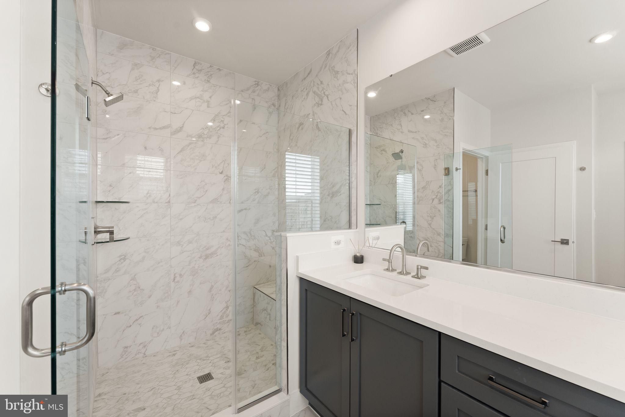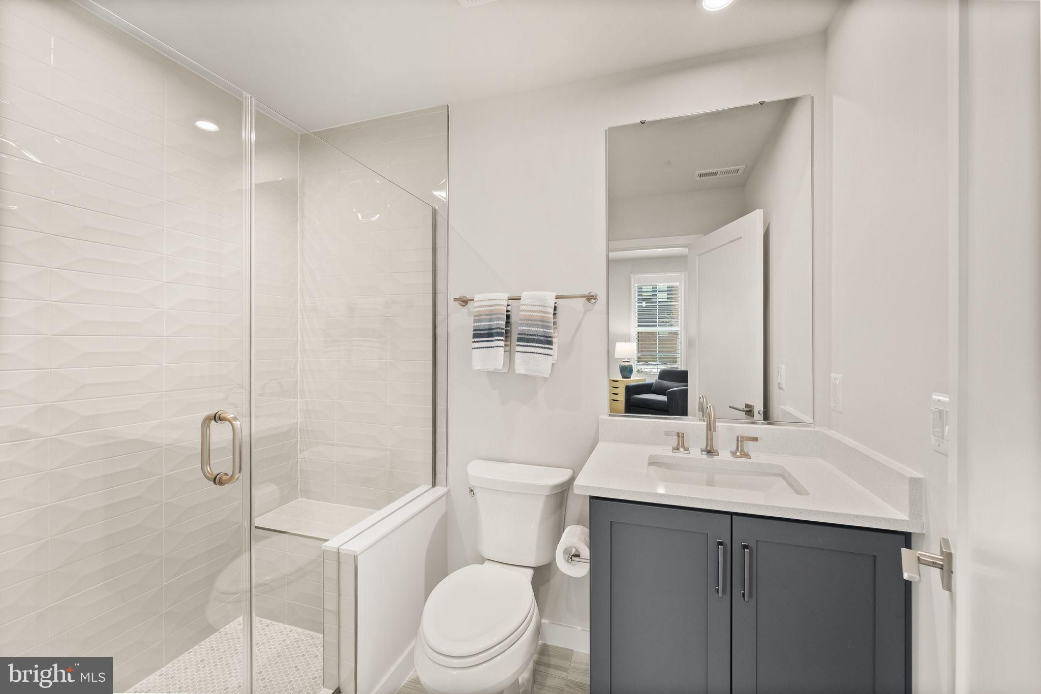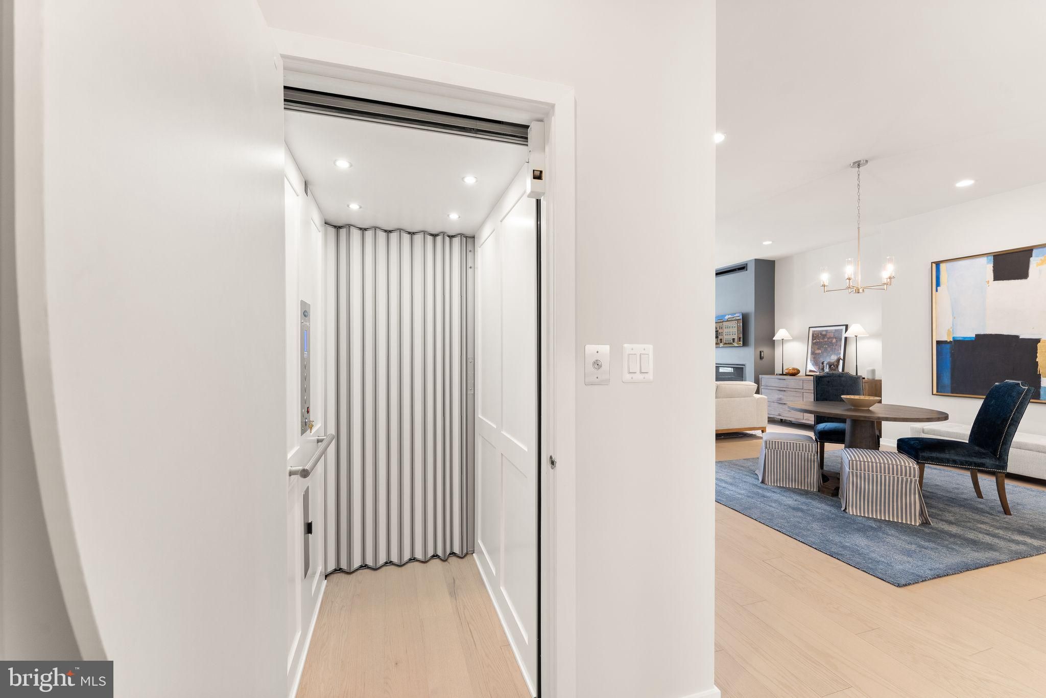 Experience elevated living in this exceptionally spacious and modern four-level townhome featuring 3 bedrooms, 3.5 baths, 3243 square feet in this 55+ active adult community, and with the rare luxury of a private elevator servicing every floor! Only 1.5 years old and impeccably maintained, the home has been thoughtfully designed with wide-plank light hardwood flooring throughout, this home blends contemporary style with everyday functionality in a prime, walkable location to the Belmont Chase shopping center! The entry level welcomes you with a bright, open foyer and a private first-floor bedroom complete with a walk-in closet and full bath. The bathroom showcases upgraded designer tile extending to the ceiling, a frameless glass shower, and sleek quartz countertops. Oak stairs connect each level, and the attached two-car garage offers convenient access to the home’s private elevator. The main living level is a true showstopper! It impresses with high ceilings, an expansive open-concept layout, and abundant natural light enhanced by plantation shutters on all levels! The spacious living area features a modern fireplace, flowing seamlessly into the dining space, and the stunning chef’s kitchen designed for both entertaining and daily living. Highlights include an oversized quartz island, enhanced white cabinetry extending to the ceiling, stylish pendant lighting, stainless steel KitchenAid appliances, a cooktop with hood vent, and a large walk-in pantry. A powder room is also conveniently located on this level. Upstairs, the bedroom level continues with hardwood flooring throughout. The luxurious primary suite features a tray ceiling, an expansive walk-in closet, and a spa-inspired bath with dual quartz vanities, upgraded floor-to-ceiling tile, and a frameless glass shower. An additional en-suite bedroom offers its own beautifully appointed bath with quartz counters and upgraded tile finishes, and walk-in closet. The generously sized laundry room is outfitted with abundant cabinetry, a utility sink, charming upgraded tile flooring, and front-load washer and dryer. The 4th top level opens to a spectacular rooftop terrace designed for year-round enjoyment. This private outdoor retreat includes a remote-controlled awning, gas hookup for grilling, wiring for an outdoor TV, and a striking modern gas fireplace—plus convenient elevator access! Ideally located just steps from shopping and dining at Belmont Chase, with immediate access to Route 7 and close proximity to Route 28 and One Loudoun, this home offers luxury, convenience, and sophisticated design all in one remarkable package. Be dazzled – schedule your showing today!