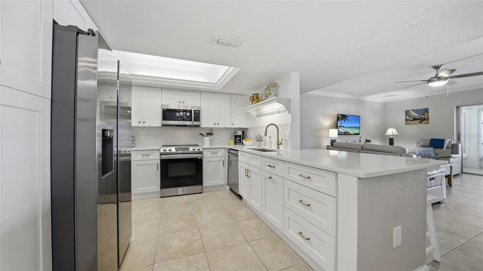 Welcome to effortless coastal living in this beautifully UPDATED second floor midrise residence in the premier GULF FRONT property of Whispering Sands! Designed with an OPEN CONCEPT floor plan, this light-filled condo showcases a bright, sophisticated 2023/2024 REMODELED kitchen featuring quartz countertops, stainless Samsung appliances, an impressive 8' breakfast bar with seating for 3, soft close cabinetry, and recessed lighting—all complemented by an elegant uplit tray ceiling. A true highlight is the expansive 29' x 8' lanai stretching the full length of the residence—offering an inviting extension of the living space ideal for relaxing, dining, or working from home, complete with hurricane impact sliders for total peace of mind. Both bathrooms have been tastefully updated with granite countertops and tiled, glass-enclosed walk-in showers, while ceiling fans and crown molding add comfort and sophistication throughout the unit. Beyond the residence, Whispering Sands offers true resort-style living in a premier Gulf front setting. Spend your days lounging on your private beach, taking a refreshing swim in one of two heated pools, an invigorating workout in the gym, or enjoying the vibrant social atmosphere of the clubhouse just steps from your door. Whether it’s a peaceful morning walk along the shoreline or a sunset gathering with neighbors, every day feels like a vacation. Perfectly positioned just steps from the clubhouse—currently undergoing complete remodeling in 2026—and pool, and a short stroll along the sidewalk to your 800' of your own private beach, this residence embodies the very best of resort style living. Ideally located just around the corner from the boutiques and restaurants of Siesta Key Village, you'll enjoy the perfect balance of relaxed beachfront living and easy access to dining, entertainment and island charm. Move right in and start enjoying the easy island lifestyle you’ve been dreaming of!