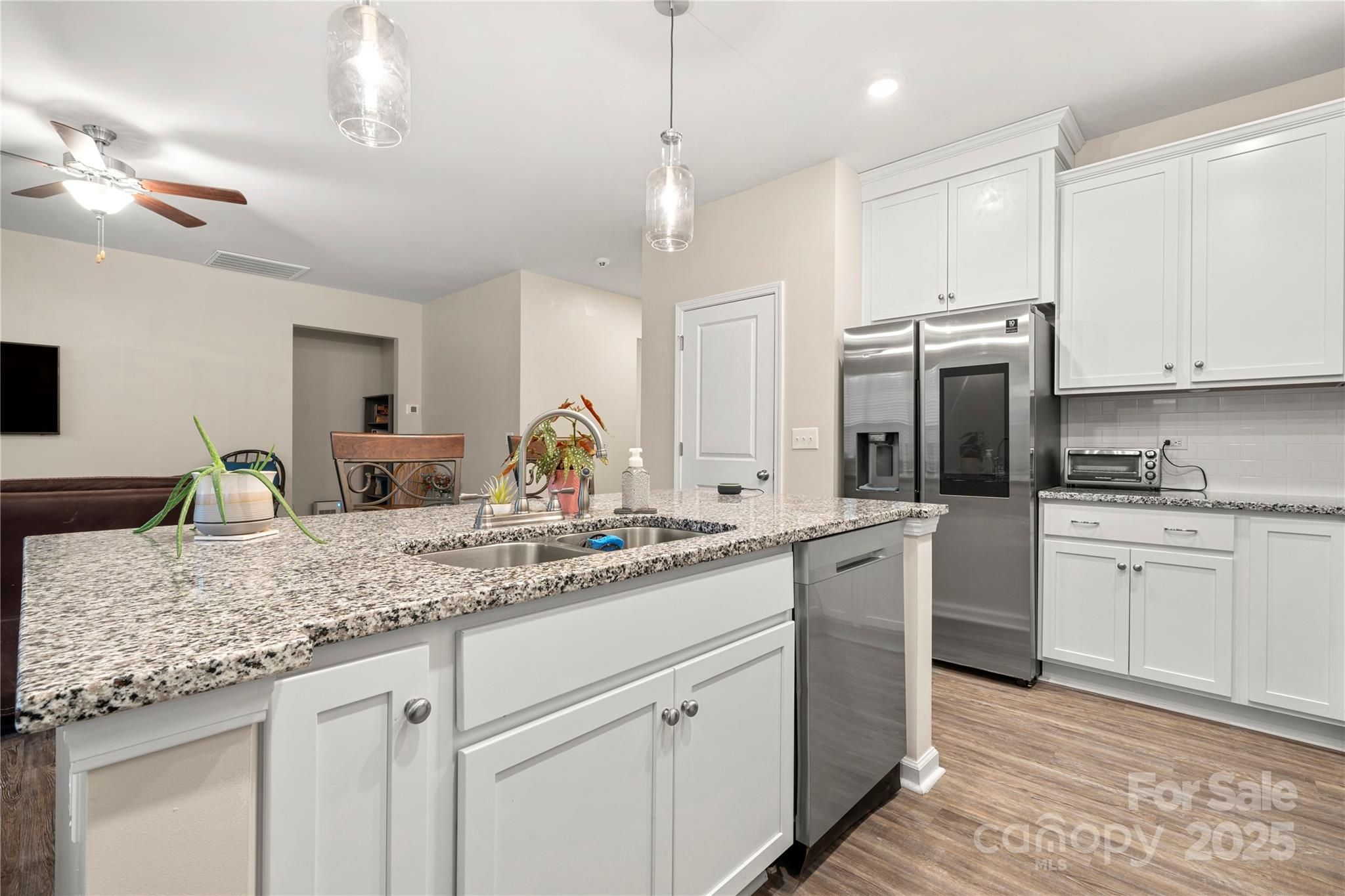 Welcome home to highly desirable Kinsley in Denver! This 3 bed 2 bath ranch with 2 car garage in a wonderful 55+ community is Move-In ready and waiting to be your next home! Open floorplan offers roomy kitchen featuring a breakfast island with pendants, stainless steel appliances, gas stove, granite, plenty of work and storage space. Large living area and dining area that opens to fenced backyard with concrete patio perfect for entertaining. Primary bedroom features lovely en-suite with dual vanity, big walk-in shower, large walk-in closet. Two more bedrooms share full bath. Laundry room, pantry, LVP, ceiling fans, neutral colors thru-out. Lawn maintenance inc with HOA. Excellent location convenient to shopping, dining, Hwy 77 and 485, and gorgeous Lake Norman. This is the one you have been searching for!