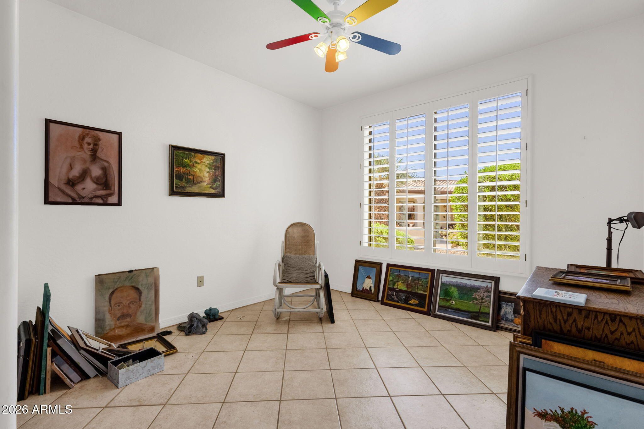 Very desirable split floor plan, 3-bedrooms 2-baths with a dedicated office; AN ADDED BONUS NOT COMMONLY FOUND in many 3-bedroom homes. Tile flooring in all the right places, neutral earth tones and plantation shutters add style and comfort throughout the home. The great room includes a fireplace, creating a warm focal point for relaxing evenings and gatherings. Spacious kitchen offers granite countertops, oak cabinets, black appliances, gas cooktop, BLANCO sink, and pendant lighting over the breakfast bar. Ample counter space and cabinet storage make this kitchen ideal for everyday cooking or entertaining. Large primary suite features a bay window bringing in natural light. Primary bath includes dual sinks, soaking tub, and separate shower. Two additional bedrooms offer flexible space for guests, hobbies, or a home office. Laundry room provides additional storage and workspace. Covered patio offers space for outdoor seating and backyard enjoyment. Convenient Surprise location 1.7 miles to Surprise Community Park and Surprise Stadium, home of spring training baseball and community events. Nearby access to golf courses, shopping, dining, and medical services including Banner Del E Webb Medical Center.