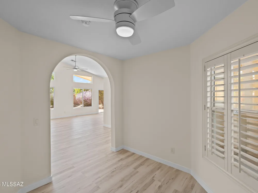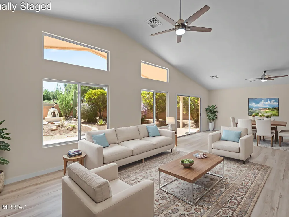 Welcome to the extravagant Quail Creek Community, promoting an active adult lifestyle to enjoy retirement to the fullest. Why wait 12 months for a new construction home when you can move right into this beautifully updated property that's ready to become your ideal place to call home? Nestled on a large lot with well-manicured landscaping, this lot offers peek-a-boo views of the Santa Rita Mountain range, an inviting covered patio and wood burning fireplace for added entertainment and relaxation. Step inside to soaring vaulted ceilings creating an open and airy atmosphere. To your left, a versatile office or den awaits, perfect for work or relaxation. The expansive great room seamlessly connects to the open-concept kitchen and dining area.